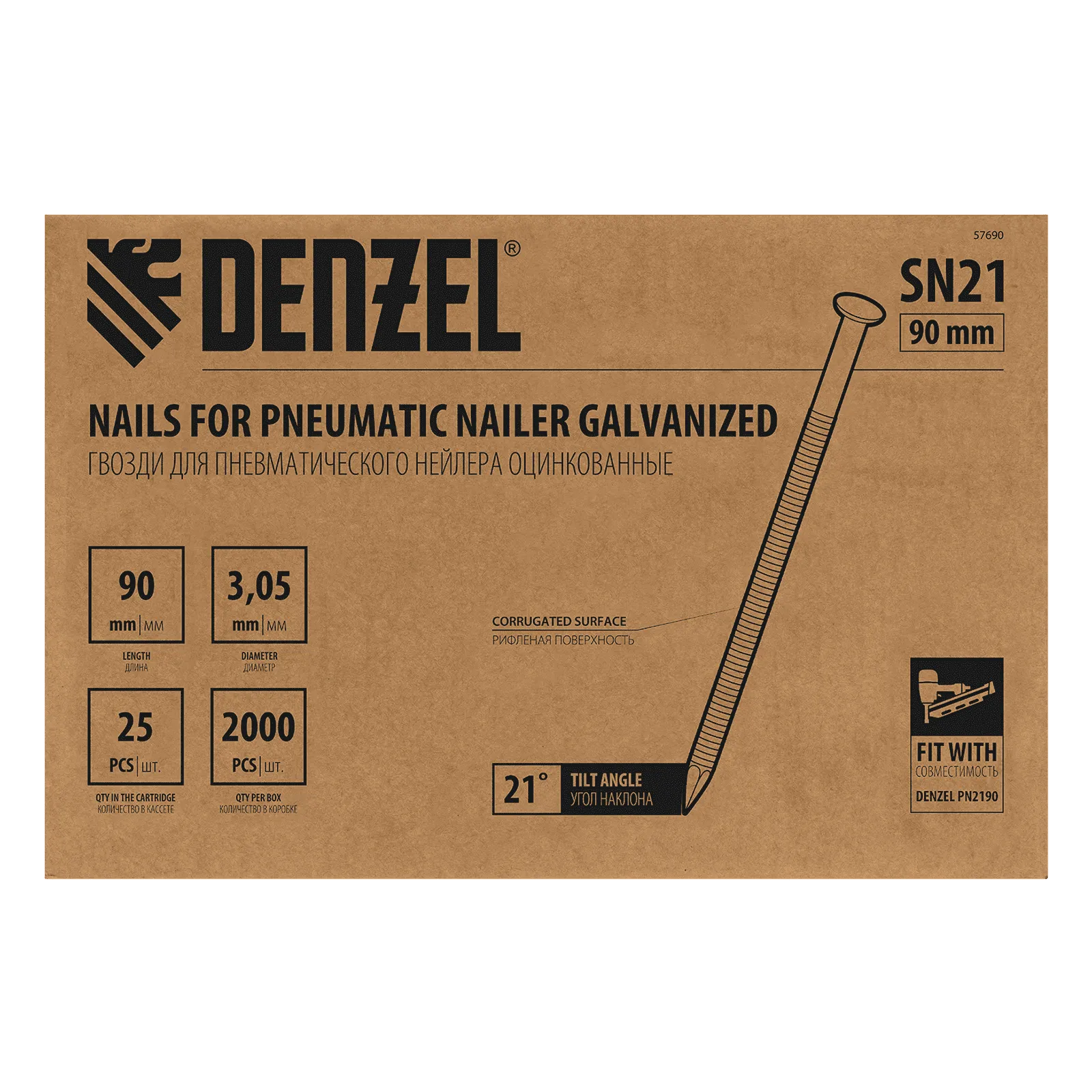 Оцинкованные гвозди Denzel 57690 типа SN21, длиной 90 мм и диаметром 3,05 мм, 2000 шт. в упаковке, — расходники для пневматического нейлера. Используются для скрепления различных материалов, будут полезны во время сборочных и отделочных работ.