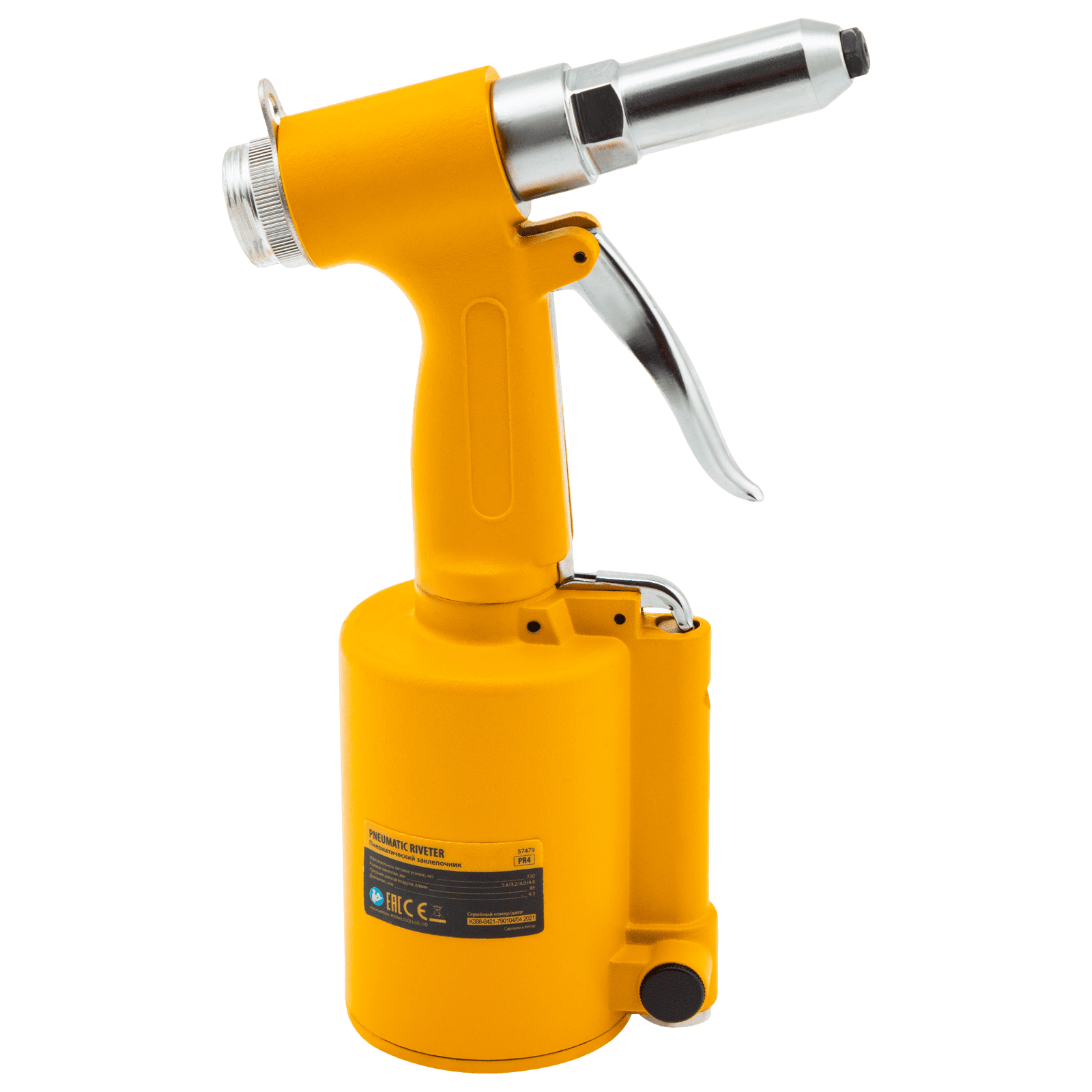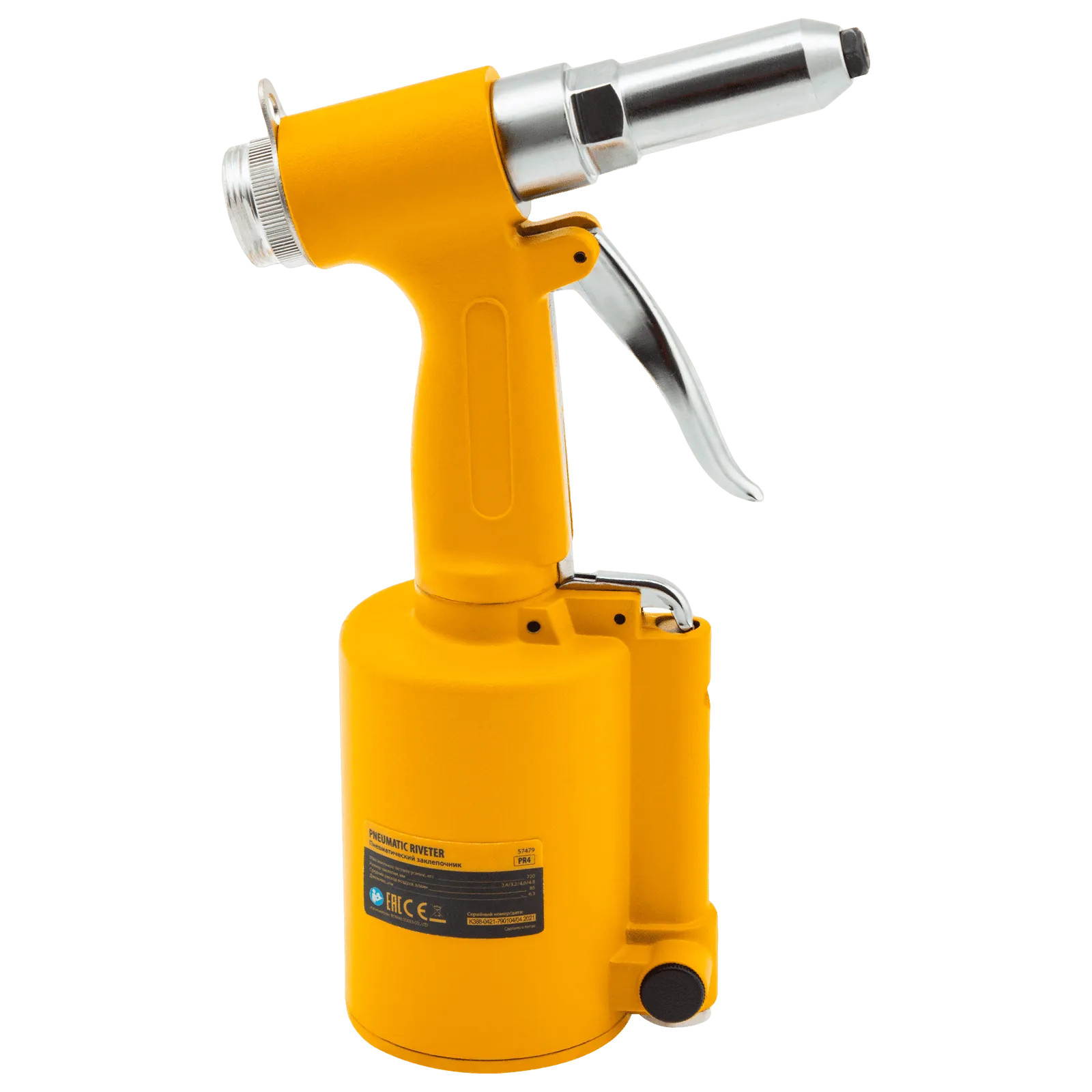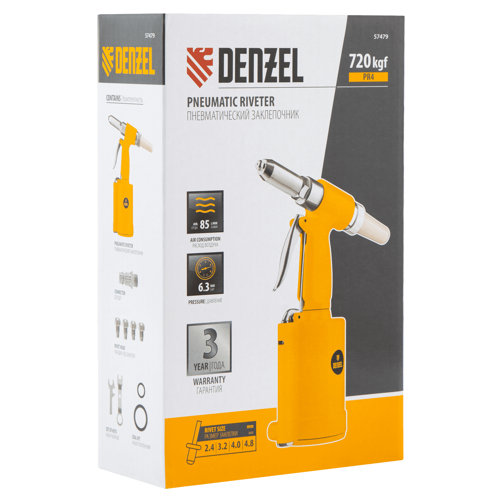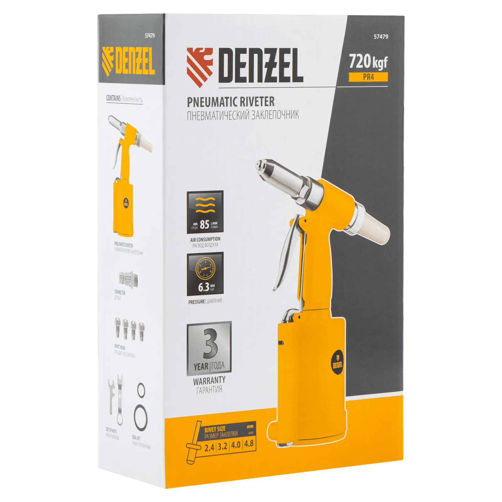 Пневматический заклепочник Denzel PR4 57479 значительно упрощает работу в автосервисах, домашних мастерских, на малых предприятиях и на ремонтных площадках. С его помощью можно без усилий скрепить листовой, профильный и панельный материал из пластика и металла.;Пистолет для вытяжных заклепок работает под давлением 6,3 АТМ и расходует всего 85 литров воздуха в минуту, поэтому для него подойдет компрессор средней мощности. В качестве оснастки используются заклепки размером 2,4-4,8 мм. В комплект поставки входит 4 насадки под заклепки размерами 2,4 мм, 3,2 мм, 4 мм и 4,8 мм.