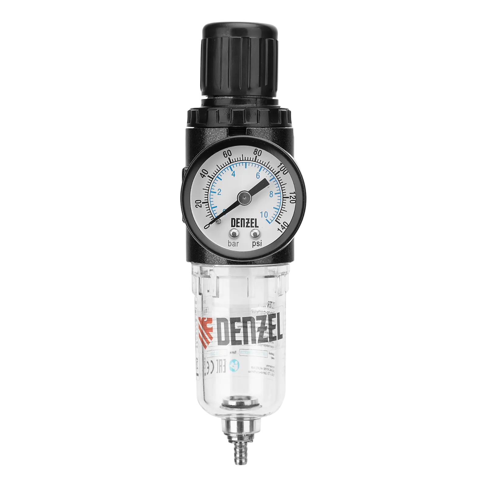Фильтр-регулятор Denzel FR1500 57459 с присоединительным размером 1/4" и рабочим давлением 10 бар имеет пропускную способность 1500 л/мин и предназначен для подготовки сжатого воздуха, поступающего от компрессора: осушения и очищения от пыли и других твердых частиц размером от 40 мкм. Также позволяет устанавливать и поддерживать давление, необходимое для эффективной работы пневмоинструмента. Может эксплуатироваться при температуре от -10 °C до +60 °C. Фильтр-регулятор предназначен для бытового применения, также будет полезен в мастерской и гараже.