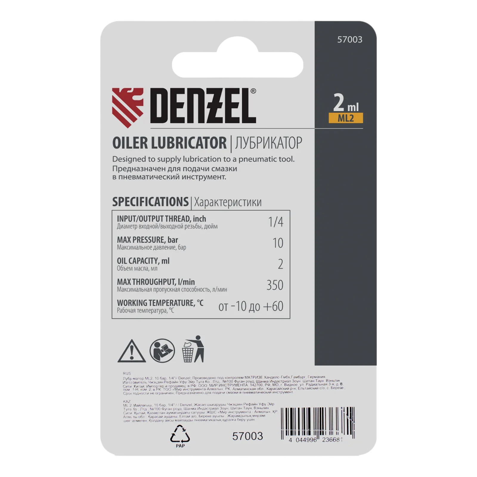 Лубрикатор Denzel ML2 57003 с рабочим давлением 10 бар и присоединительным размером 1/4" имеет пропускную способность 350 л/мин и обеспечивает поступление смазки в пневматическую систему. Предотвращает преждевременный износ и поломку рабочих деталей пневмоинструмента: гайковерта, дрели, молотка и т.д.