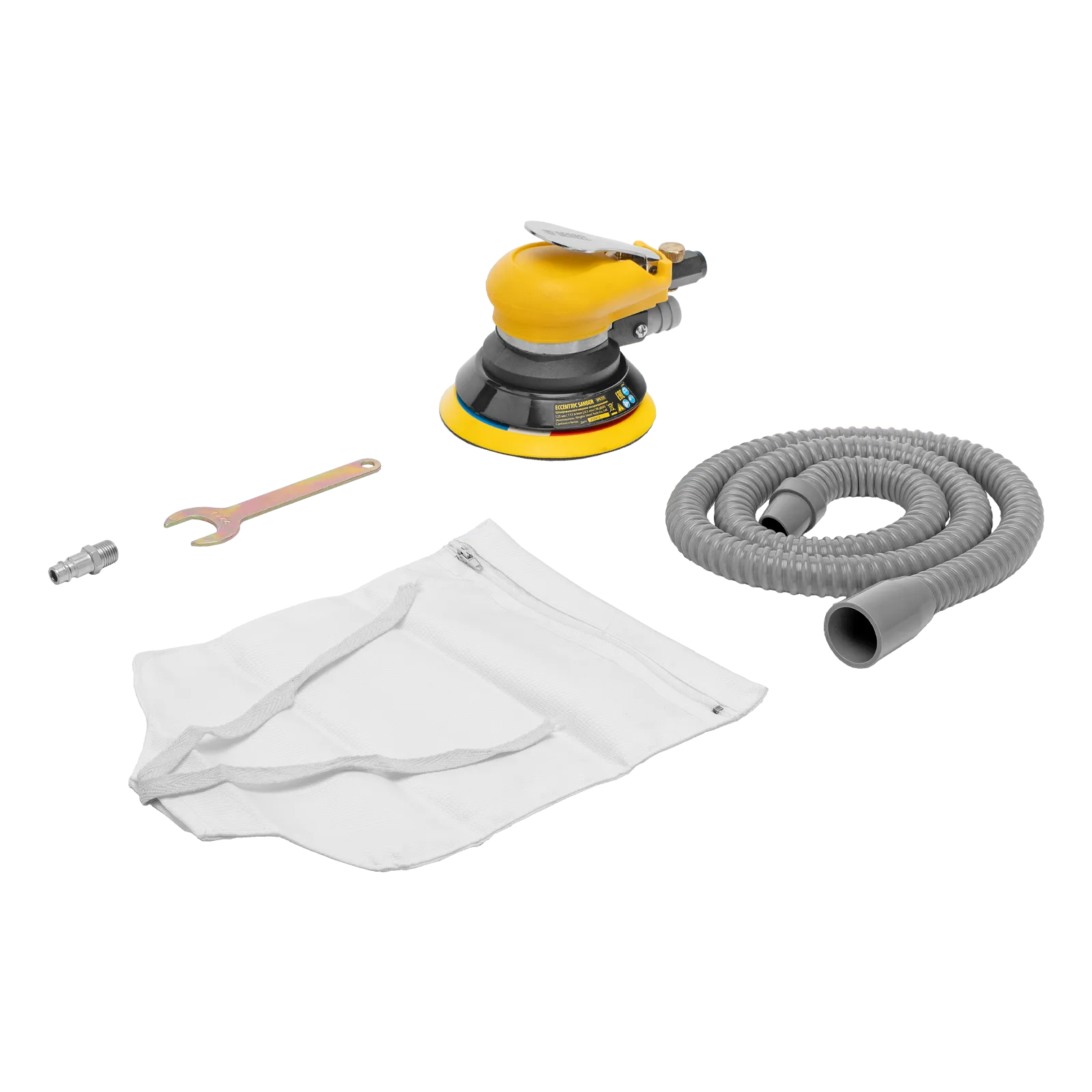 - Эффективная система пылеудаления — в комплект поставки входит пылесборный мешок со шлангом для удаления отходов шлифовки, поэтому инструмент можно использовать в закрытых помещениях.