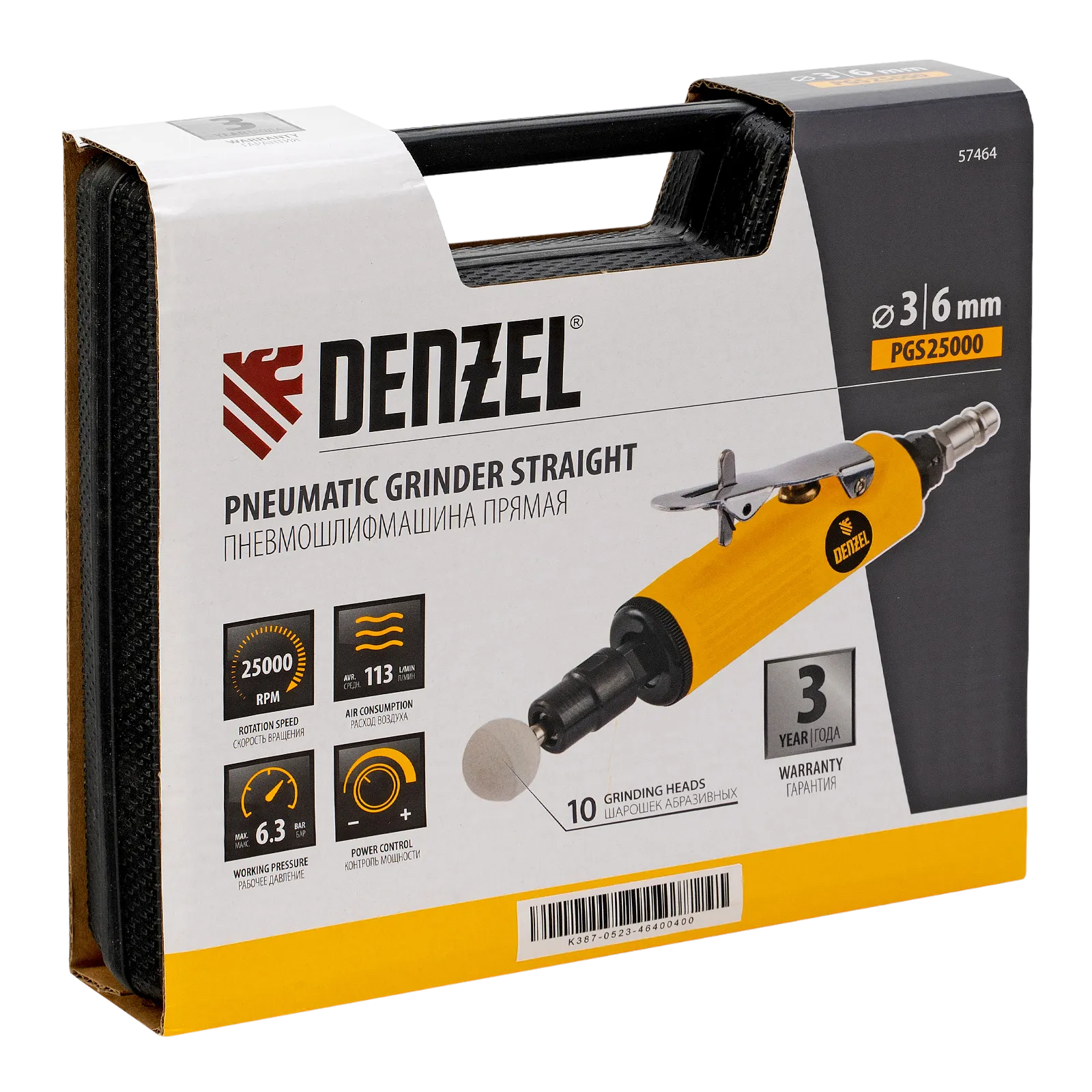 Прямая пневмошлифмашина Denzel PGS25000 57464 поставляется с 10 шлифовальными камнями и цангами 3 и 6 мм, потребляет 113 л сжатого воздуха в минуту и обеспечивает скорость вращения оснастки 25000 об/мин. Используется для обработки изделий из пластика, древесины и металла. Позволяет удалять заусенцы, зачищать сварные швы, снимать тонкий слой ржавчины или лакокрасочного покрытия на небольших участках, выполнять шлифовальные работы. Инструмент оптимален для работы в условиях ограниченного пространства, подходит для профессионального и бытового использования.