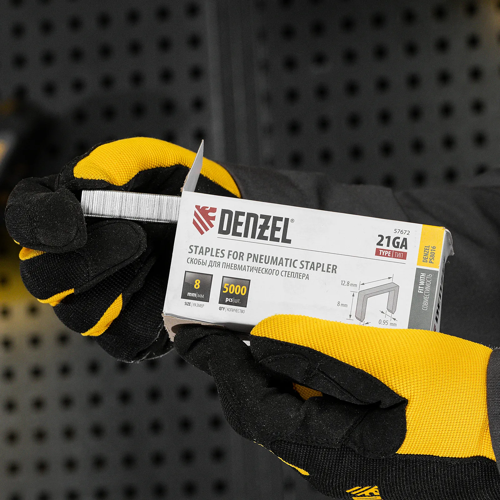Скобы 21GA Denzel 57672 шириной 12,8 мм, 5000 шт. в упаковке, предназначены для пневматического степлера, совместимого с крепежом размера 8 х 0,95 х 0,6 мм. Используются для крепления листовых материалов к деревянному основанию, подходят для обивки мебели, укладки напольного покрытия, фиксации утеплителя.