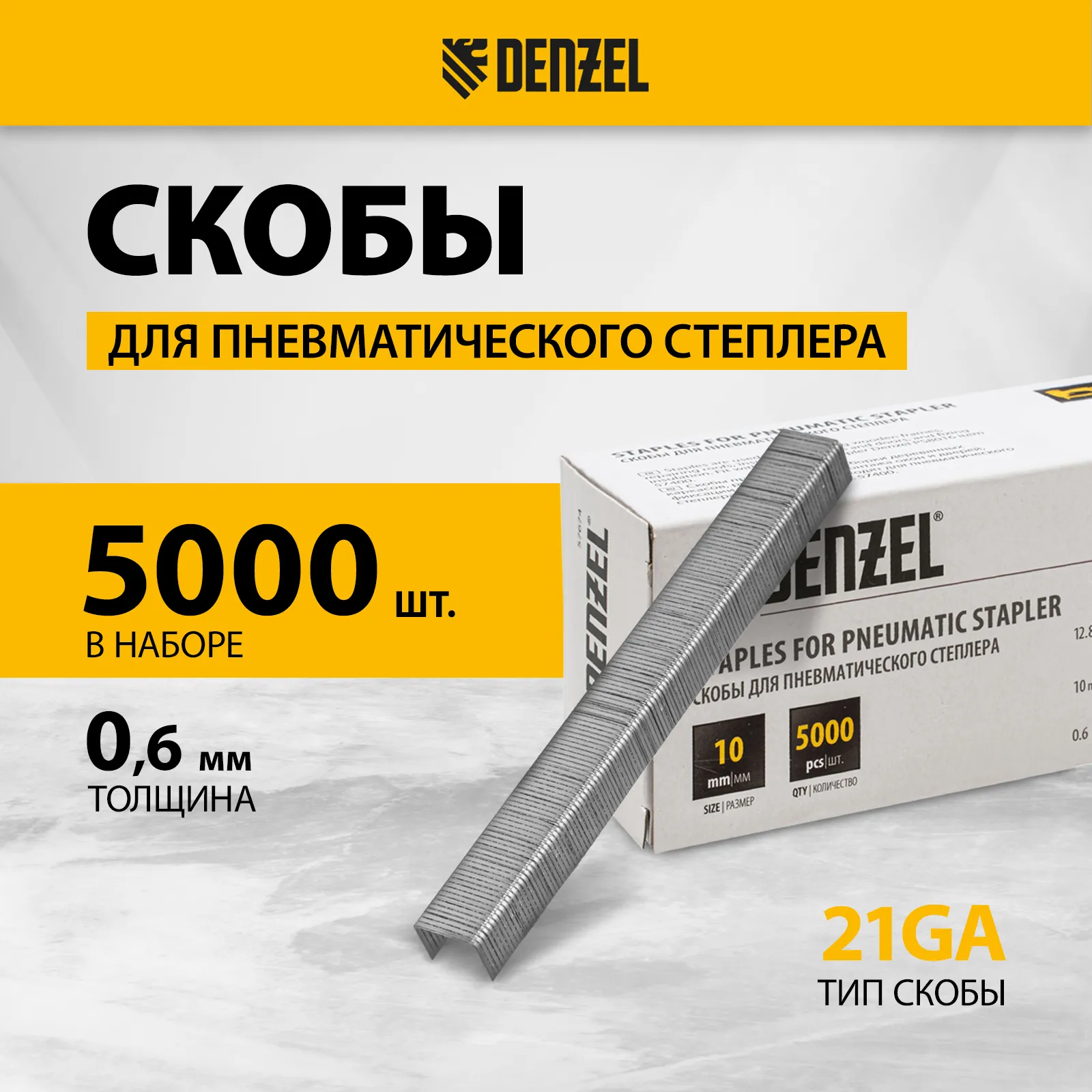 Скобы 21GA Denzel 57674 шириной 12,8 мм, 5000 шт. в упаковке, предназначены для пневматического степлера, совместимого с крепежом размера 10 х 0,95 х 0,6 мм. Используются для крепления листовых материалов к деревянному основанию, подходят для обивки мебели, укладки напольного покрытия, фиксации утеплителя.