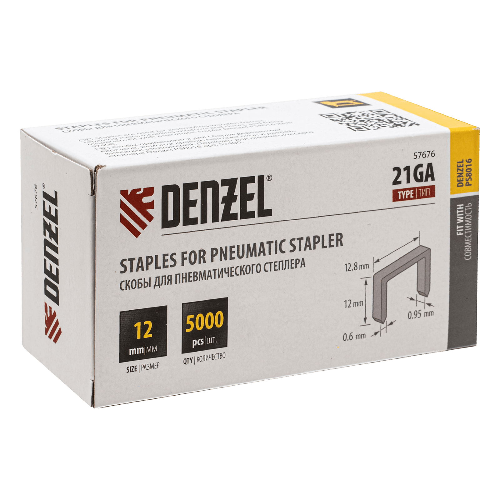 Скобы 21GA Denzel 57676 шириной 12,8 мм, 5000 шт. в упаковке, предназначены для пневматического степлера, совместимого с крепежом размера 12 х 0,95 х 0,6 мм. Используются для крепления листовых материалов к деревянному основанию, подходят для обивки мебели, укладки напольного покрытия, фиксации утеплителя.
