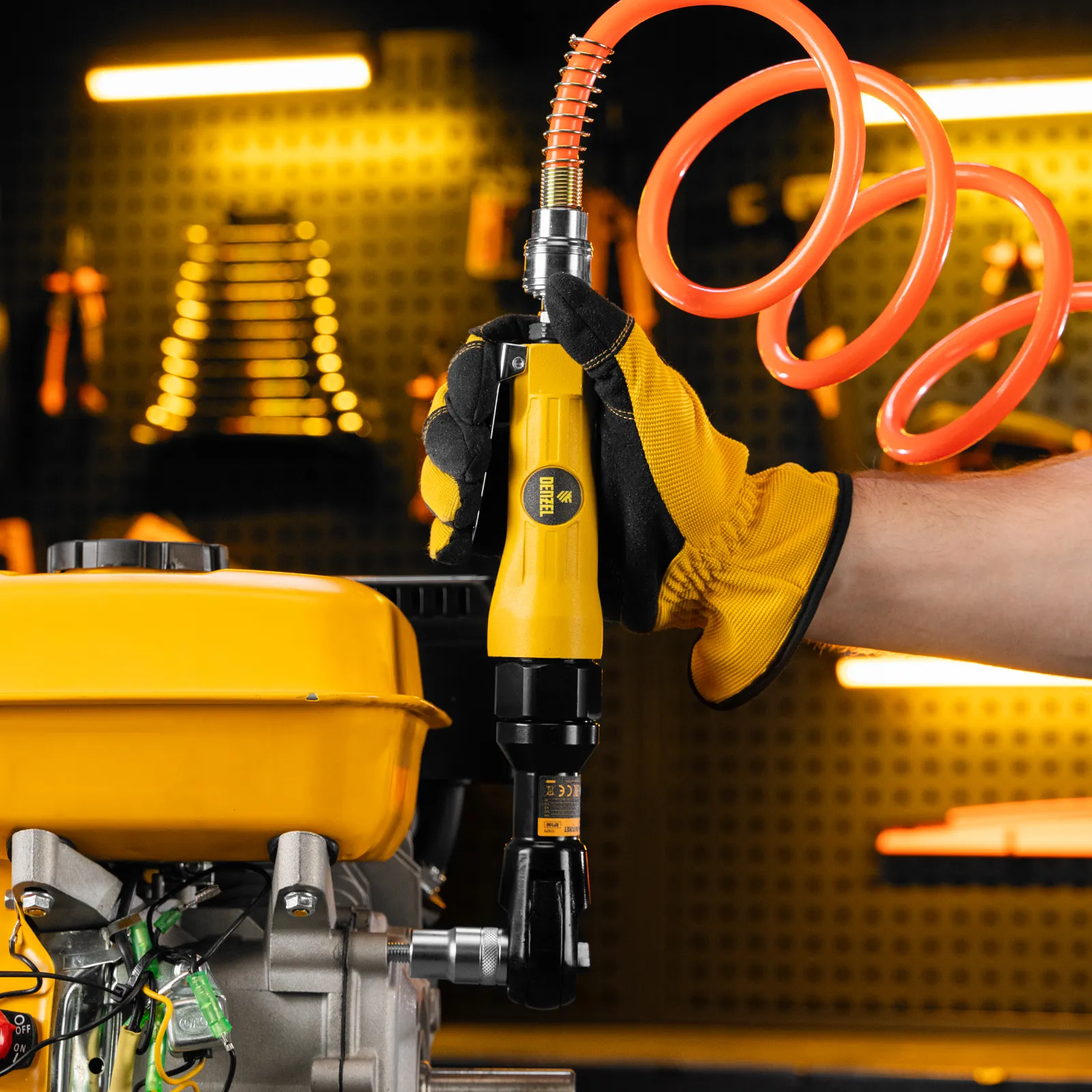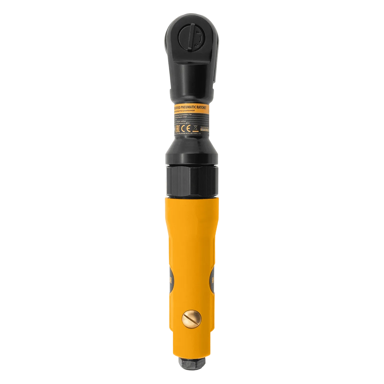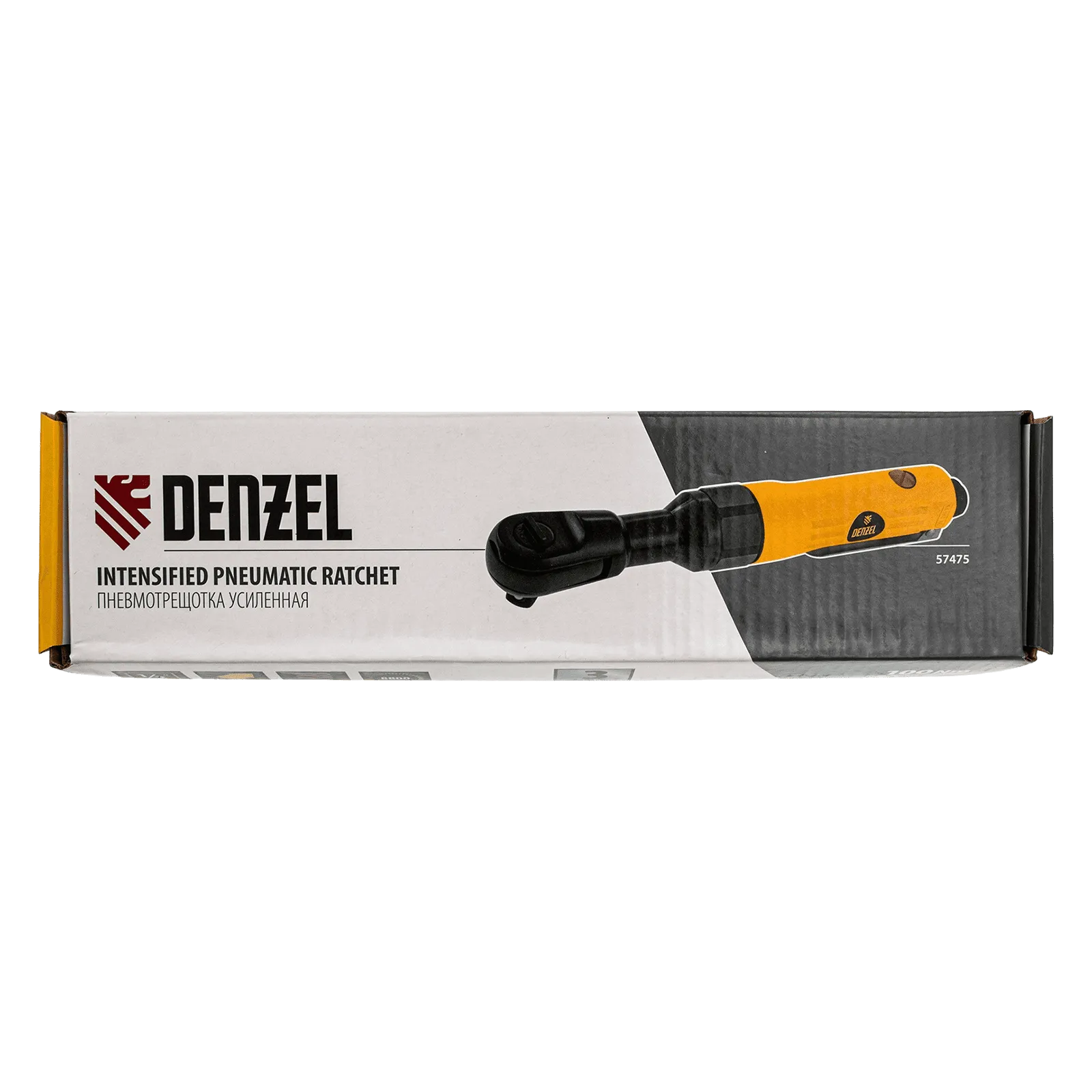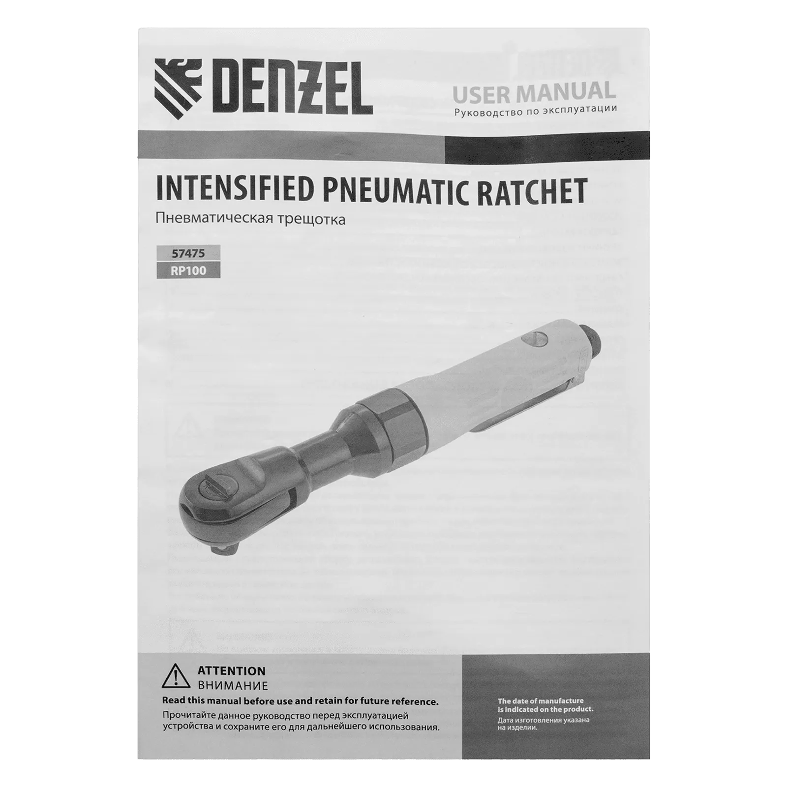 Усиленная пневмотрещотка Denzel RP100 57475, 160 об/мин, с квадратным хвостовиком 1/2 дюйма, — незаменимый помощник в автосервисе, слесарном цехе, на шиномонтаже, в частной мастерской и в любом деле, где нужен монтаж и демонтаж резьбового крепежа. Крутящий момент 100 Нм позволяет аккуратно работать с мелкими крепежными элементами без риска их повреждения и оперативно справляться со сложными, тугими соединениями. Применение трещотки в быту или промышленности позволяет сэкономить время и силы мастера.;Инструмент предназначен для работы при давлении 6,3 бар, расход воздуха в среднем не превышает 200 л/мин. Во время работы не забывайте использовать специальное масло ISO 46, которое можно добавлять как напрямую в инструмент, так и с помощью блока подготовки воздуха Denzel 57469, включающего в себя лубрикатор для автоматической подачи масла.