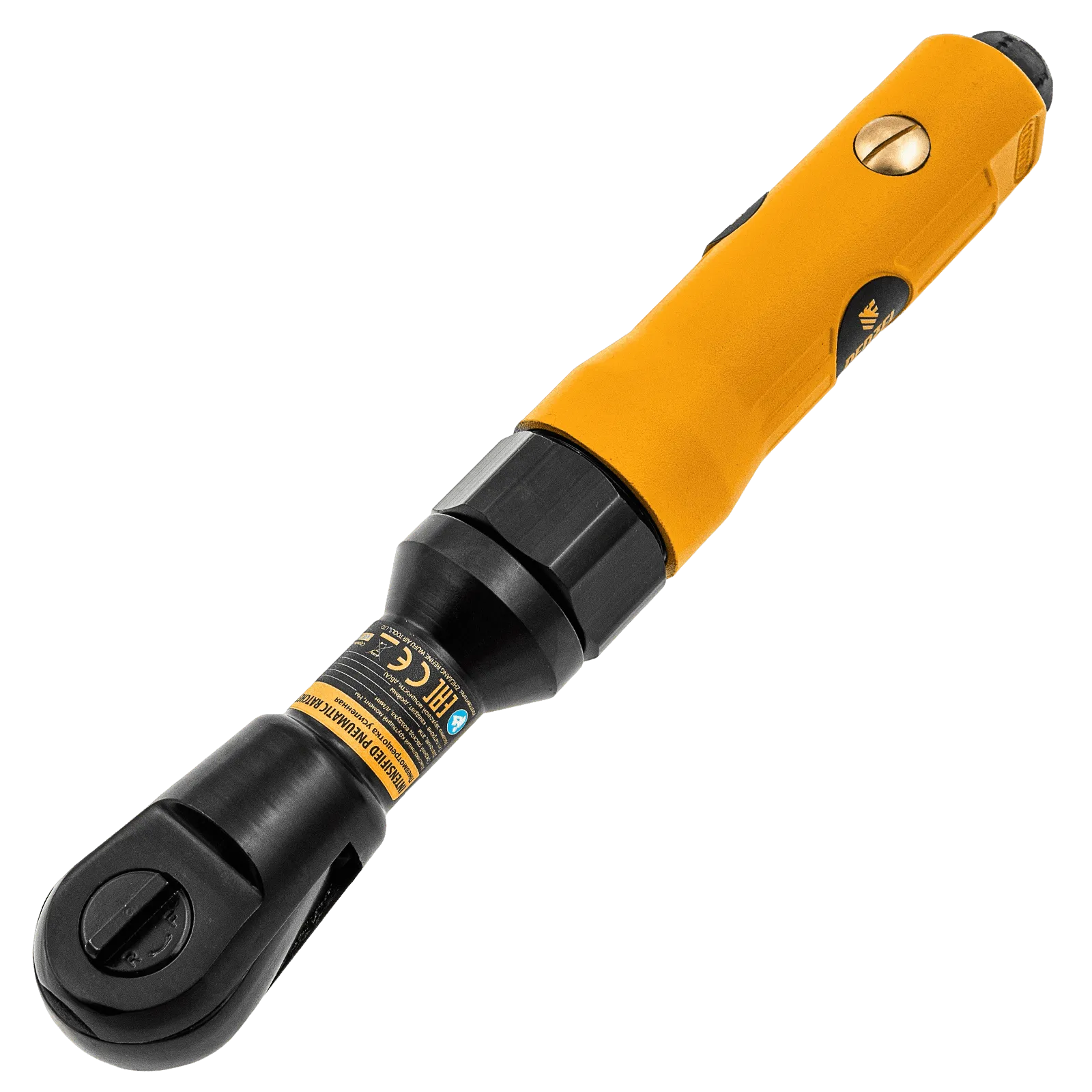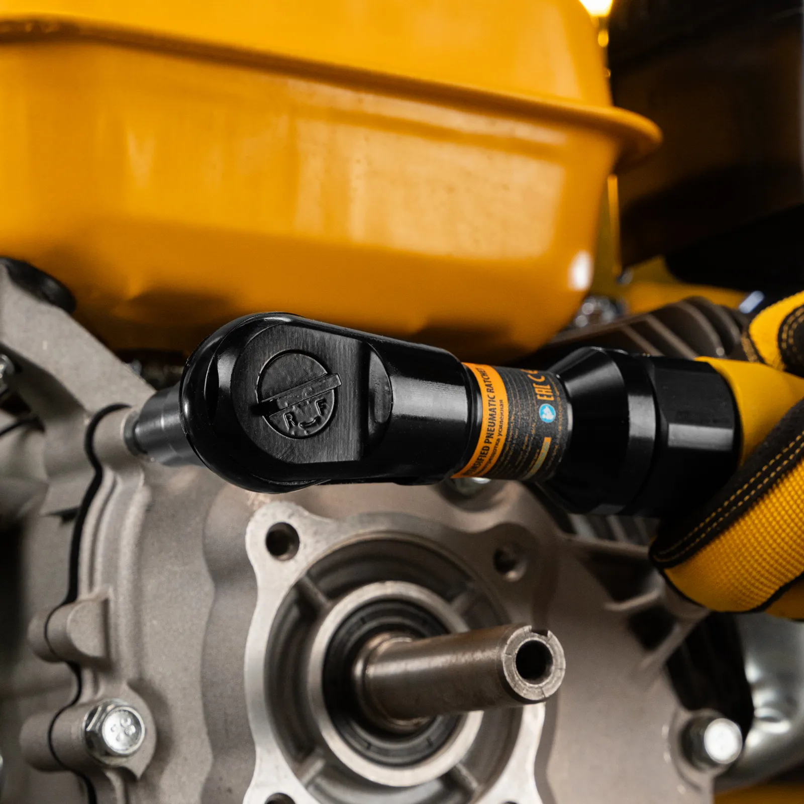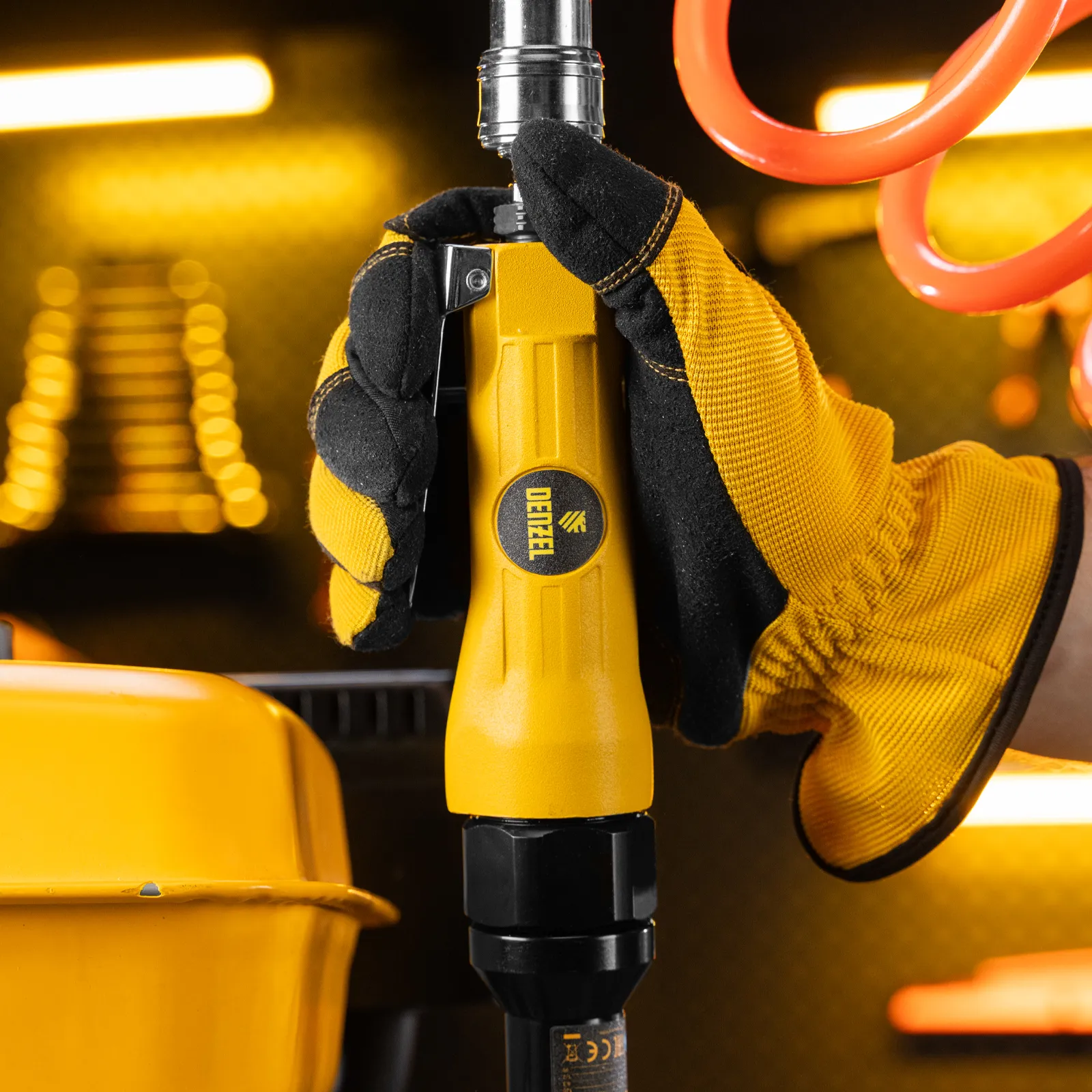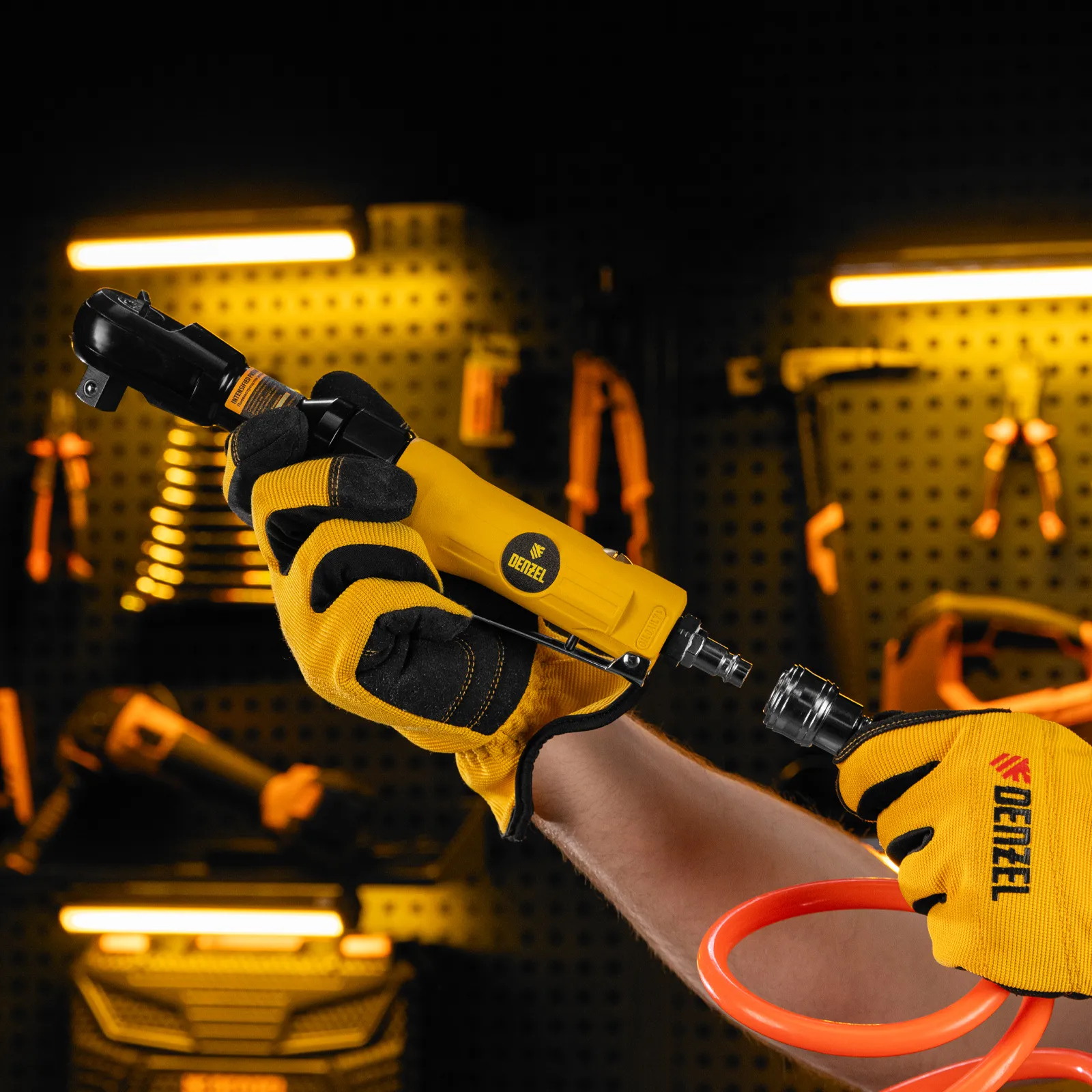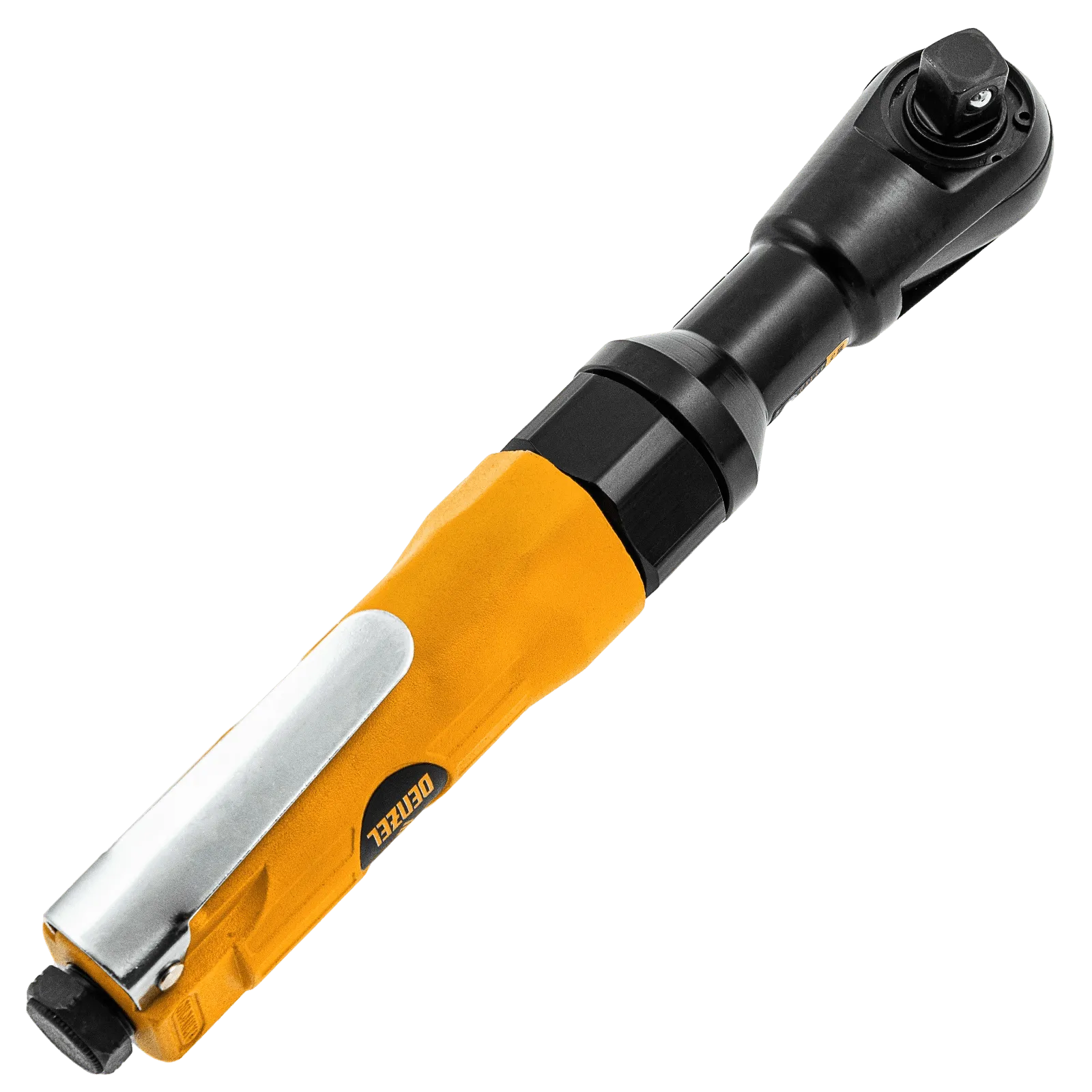 Усиленная пневмотрещотка Denzel RP100 57475, 160 об/мин, с квадратным хвостовиком 1/2 дюйма, — незаменимый помощник в автосервисе, слесарном цехе, на шиномонтаже, в частной мастерской и в любом деле, где нужен монтаж и демонтаж резьбового крепежа. Крутящий момент 100 Нм позволяет аккуратно работать с мелкими крепежными элементами без риска их повреждения и оперативно справляться со сложными, тугими соединениями. Применение трещотки в быту или промышленности позволяет сэкономить время и силы мастера.;Инструмент предназначен для работы при давлении 6,3 бар, расход воздуха в среднем не превышает 200 л/мин. Во время работы не забывайте использовать специальное масло ISO 46, которое можно добавлять как напрямую в инструмент, так и с помощью блока подготовки воздуха Denzel 57469, включающего в себя лубрикатор для автоматической подачи масла.