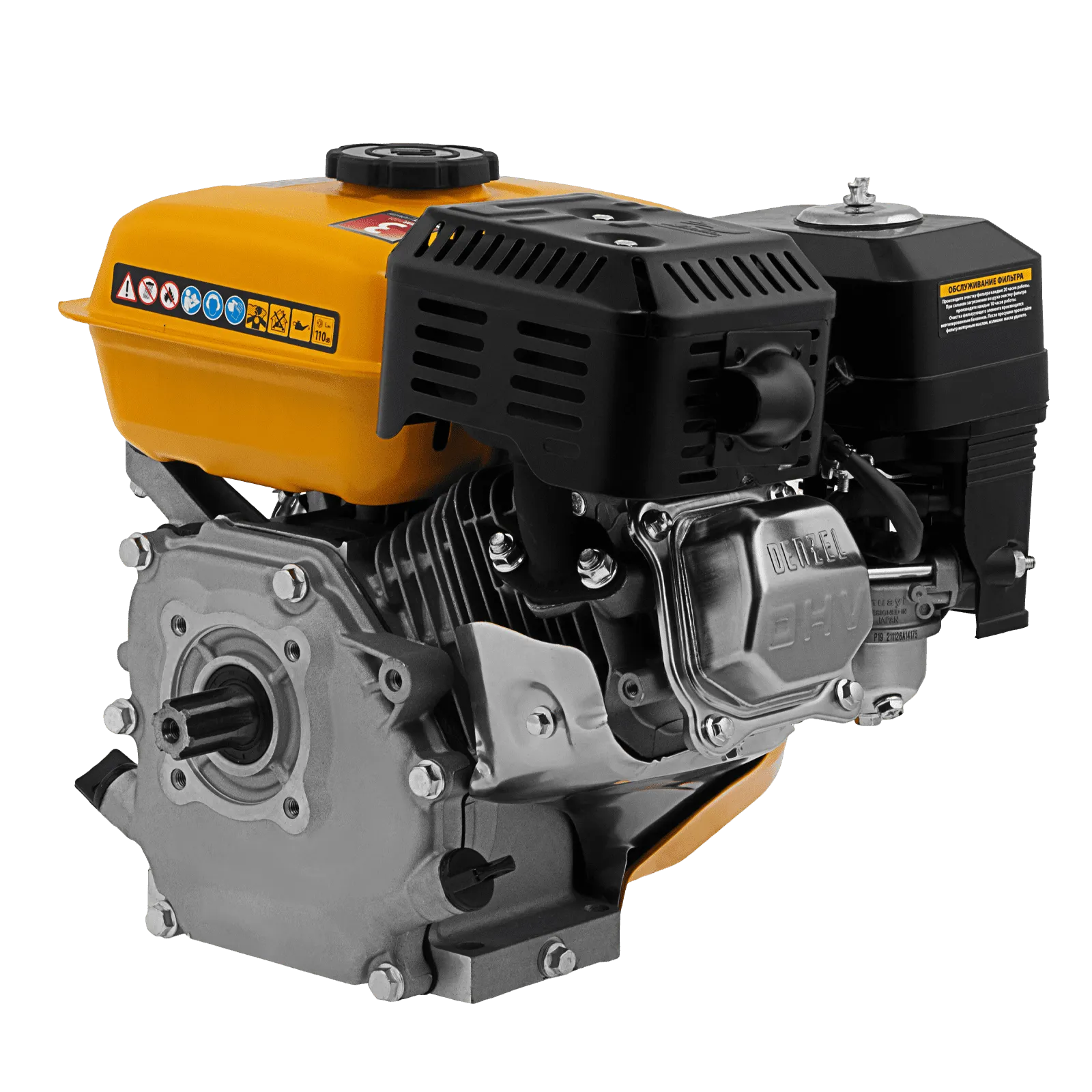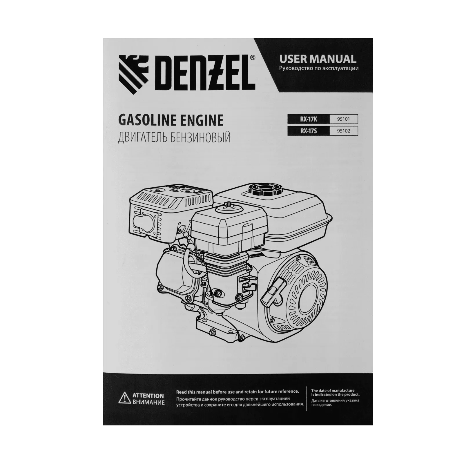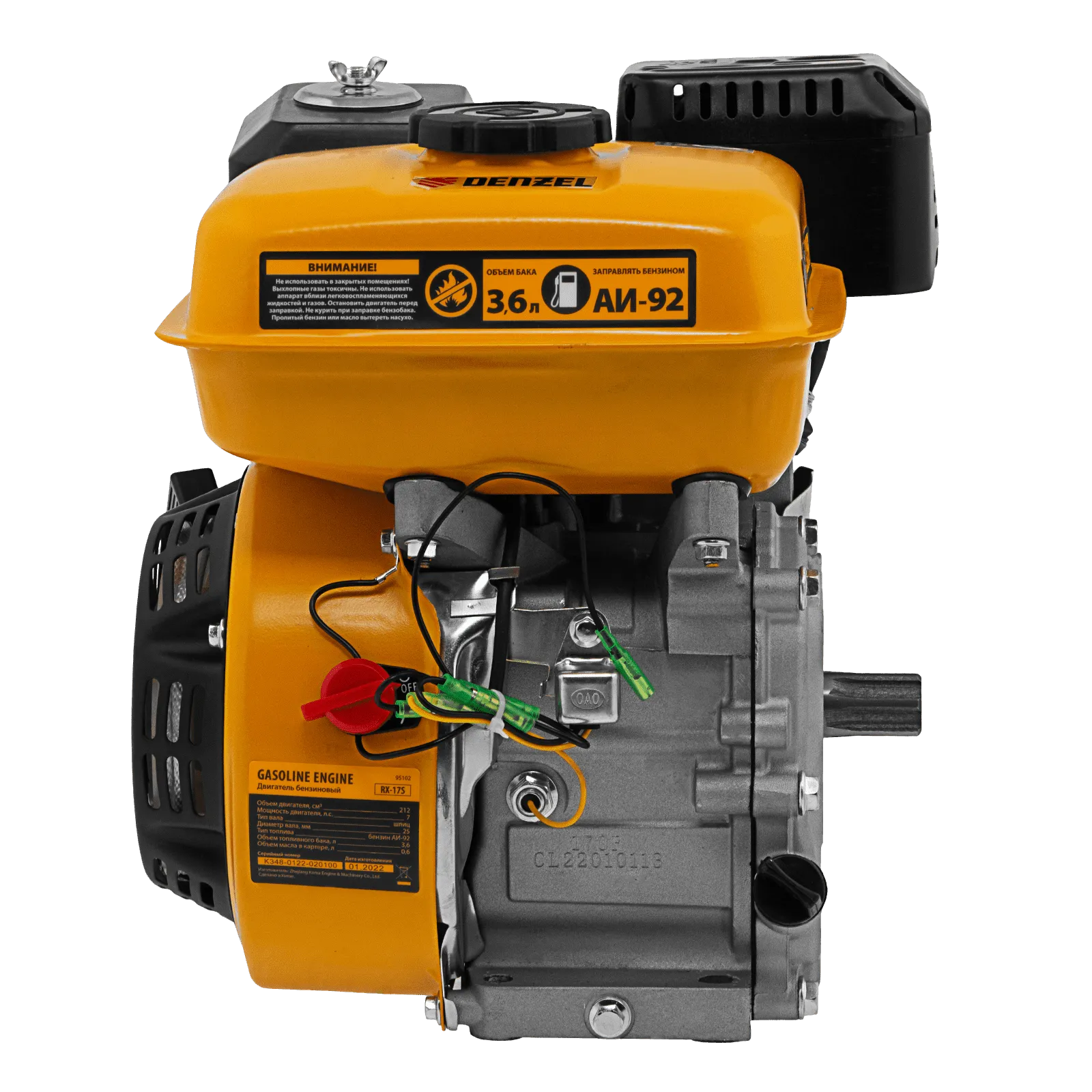 Четырехтактный бензиновый двигатель Denzel RX-17S 95102 мощностью 7 л. с. и объемом 212 см3, с типом горизонтального вала шлиц 25 мм, имеет ручной старт и воздушное охлаждение. Предназначен для использования в качестве привода садово-парковой и строительной техники (садовых измельчителей, мотопомп, бензиновых моек высокого давления и др.). Обеспечивает бесперебойное функционирование оборудования и эффективное выполнение сельскохозяйственных, строительных работ, а также решение прочих задач на загородном участке.