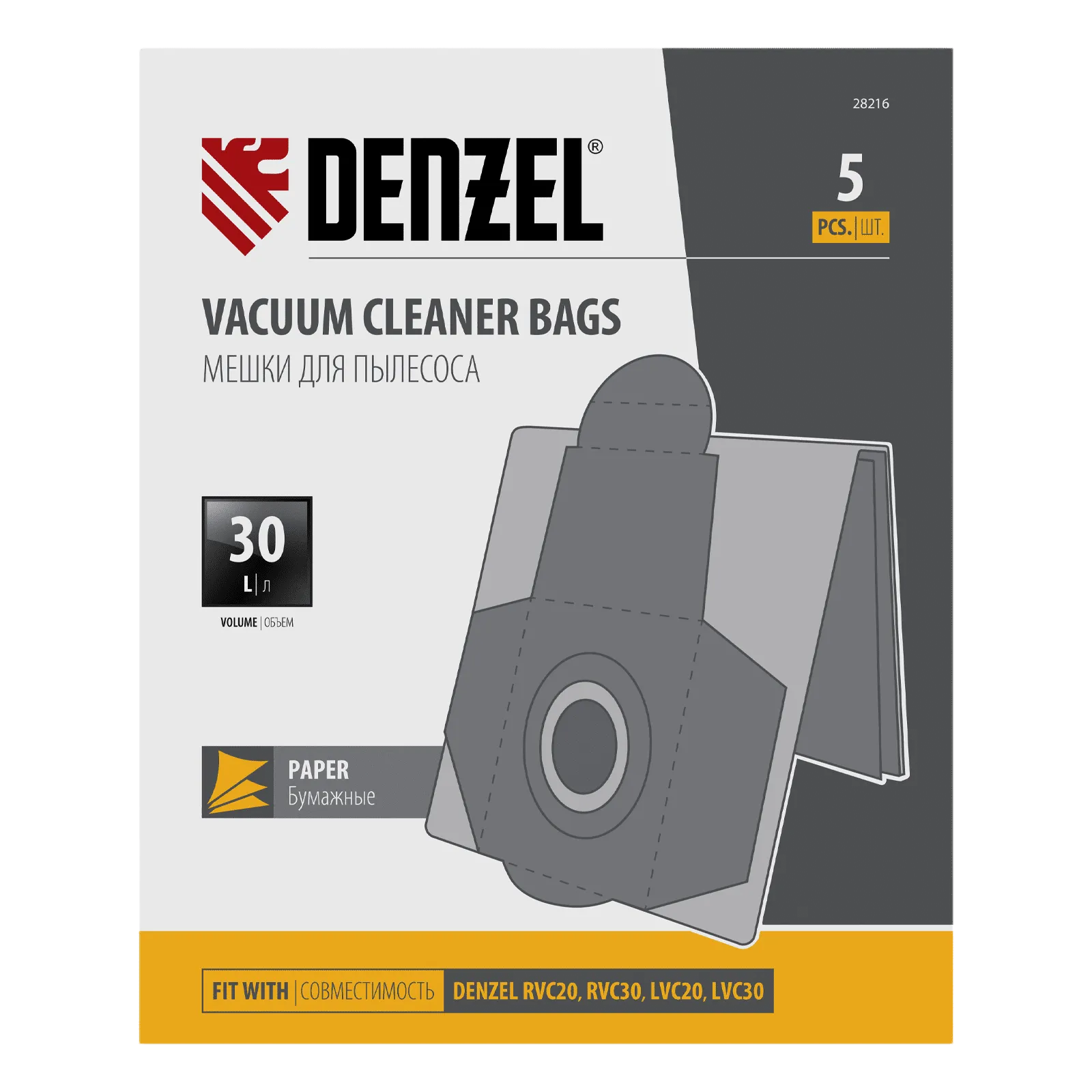Комплект одноразовых мешков Denzel 28216 представляет собой набор из 5 расходников для строительных пылесосов RVC20 (28202), RVC30 (28203), LVC20 (28292), LVC30 (28293). Мешок объемом 30 л устанавливается в специальное гнездо с внутренней стороны бака и служит для сбора мусора во время сухой уборки.