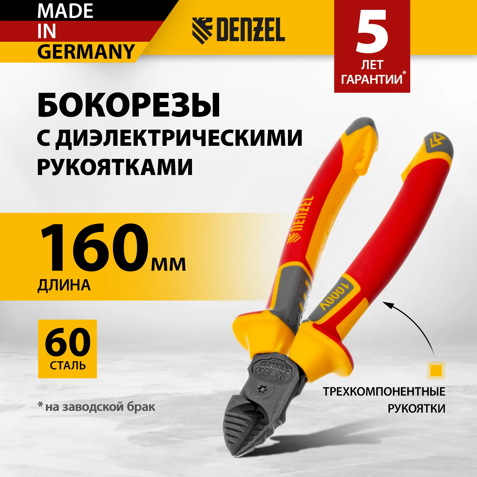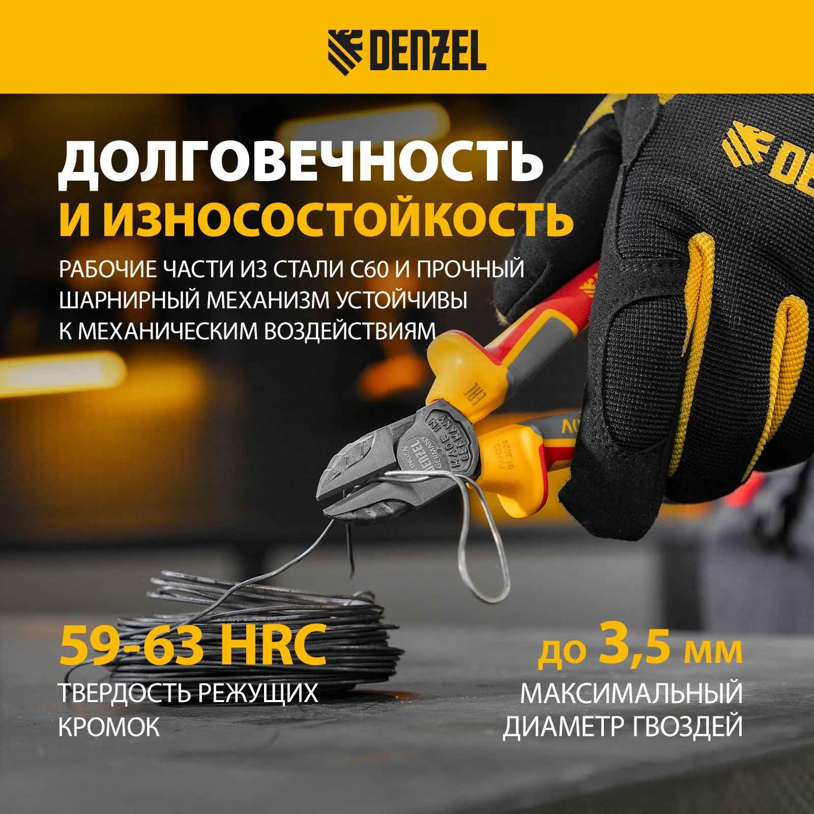 Бокорезы Denzel 17788 длиной 160 мм, с трехкомпонентными диэлектрическими рукоятками, рассчитанными на напряжение до 1000 В, предназначены для разрезания кабелей, проводов, проволоки, стержней из пластмассы и металла. Максимальный диаметр перерезаемой мягкой проволоки (алюминиевой, медной, с пределом прочности 220 Н/мм2) составляет 6 мм, проволоки средней жесткости и гвоздей (750 Н/мм2) — 3,5 мм, жесткой (1800 Н/мм2) — 2 мм. Бокорезы подходят для проведения электромонтажных работ. Инструмент эффективно справляется с поставленными задачами благодаря шарниру, смещенному к режущим кромкам и увеличивающему усилие реза на 20%.