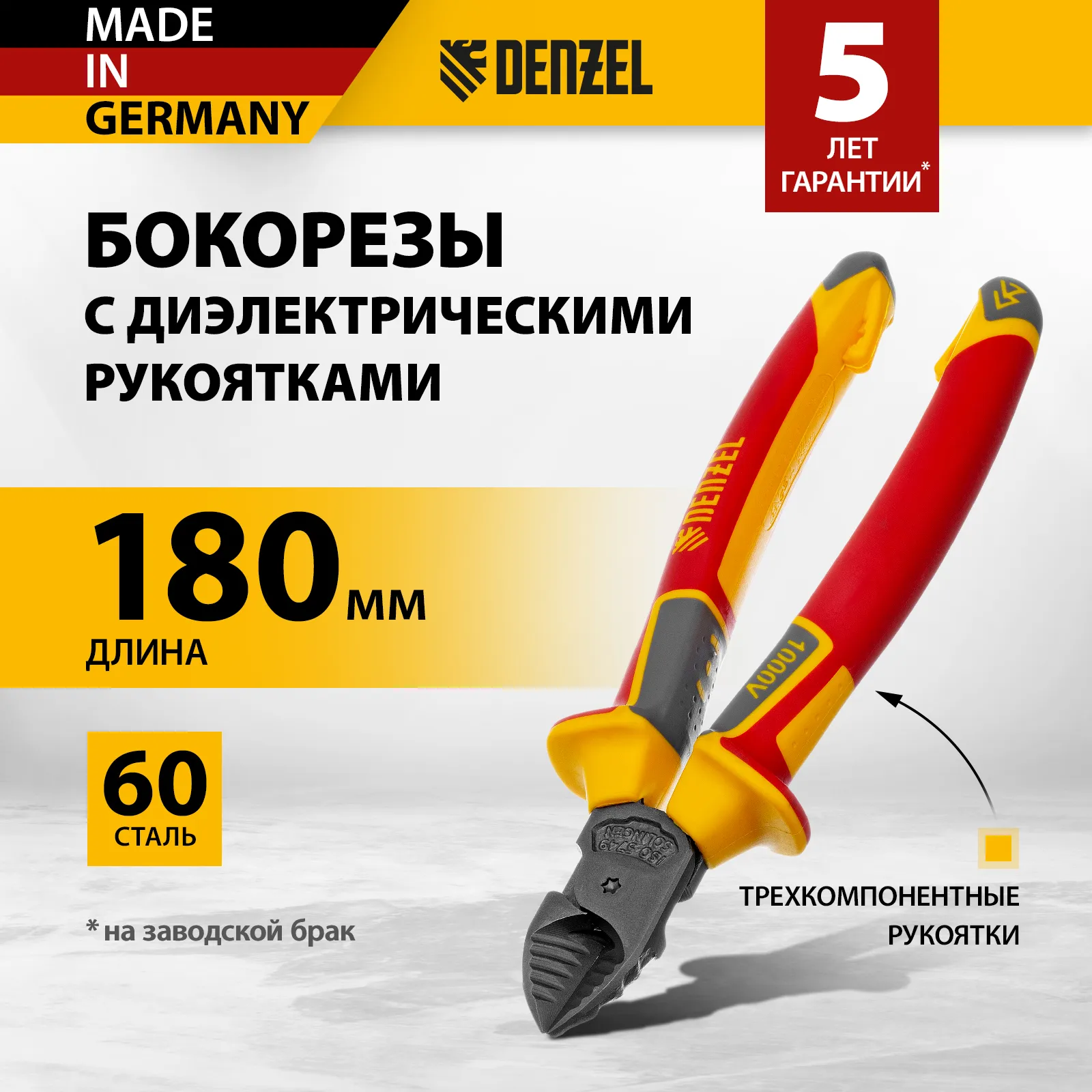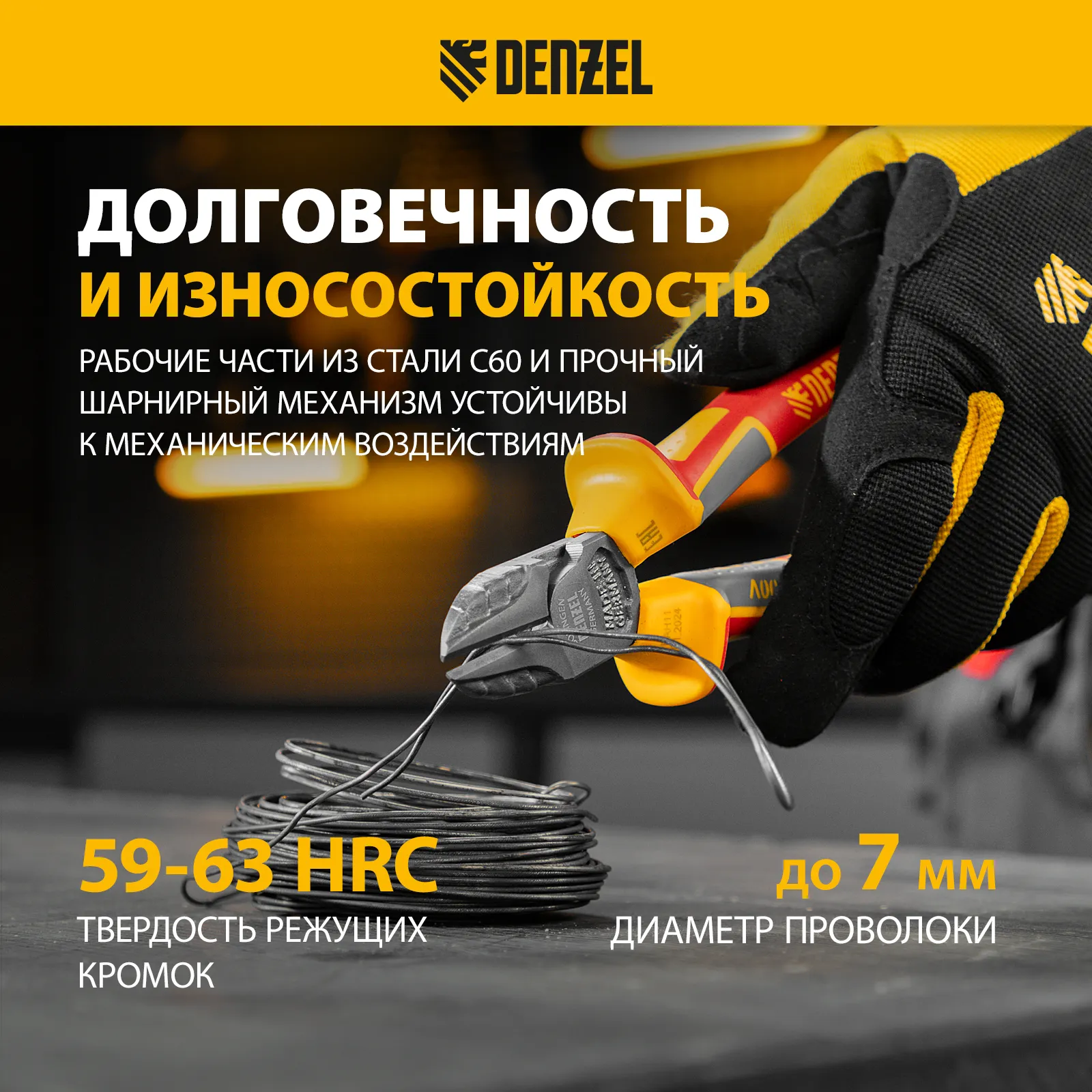 Бокорезы Denzel 17789 длиной 180 мм, с трехкомпонентными диэлектрическими рукоятками, рассчитанными на напряжение до 1000 В, предназначены для разрезания кабелей, проводов, проволоки, стержней из пластмассы и металла. Максимальный диаметр перерезаемой мягкой проволоки (алюминиевой, медной, с пределом прочности 220 Н/мм2) составляет 7 мм, проволоки средней жесткости и гвоздей (750 Н/мм2) — 4 мм, жесткой (1800 Н/мм2) — 2,5 мм. Бокорезы подходят для проведения электромонтажных работ. Инструмент эффективно справляется с поставленными задачами благодаря шарниру, смещенному к режущим кромкам и увеличивающему усилие реза на 20%. Важно — перед началом работы необходимо отключить напряжение в сети!