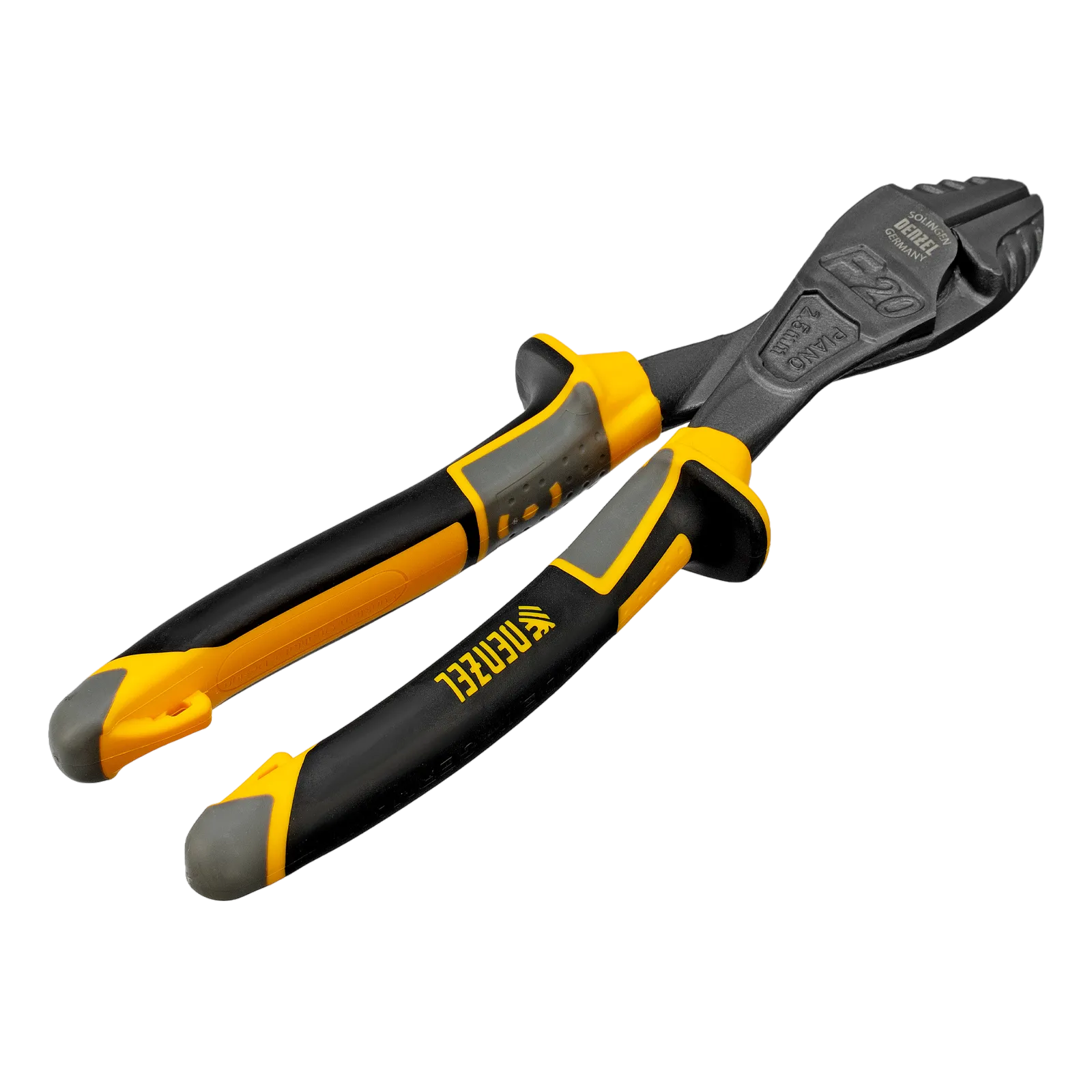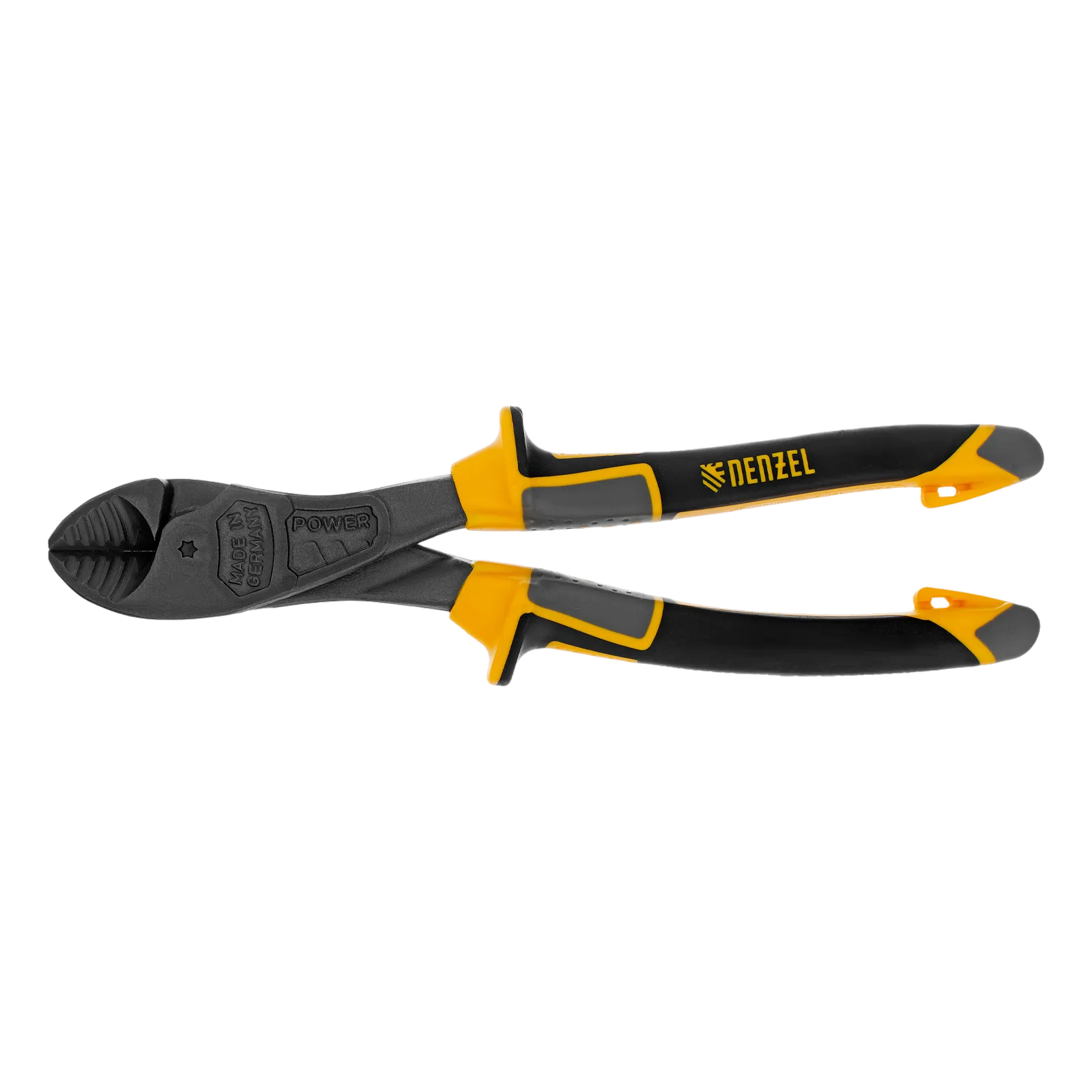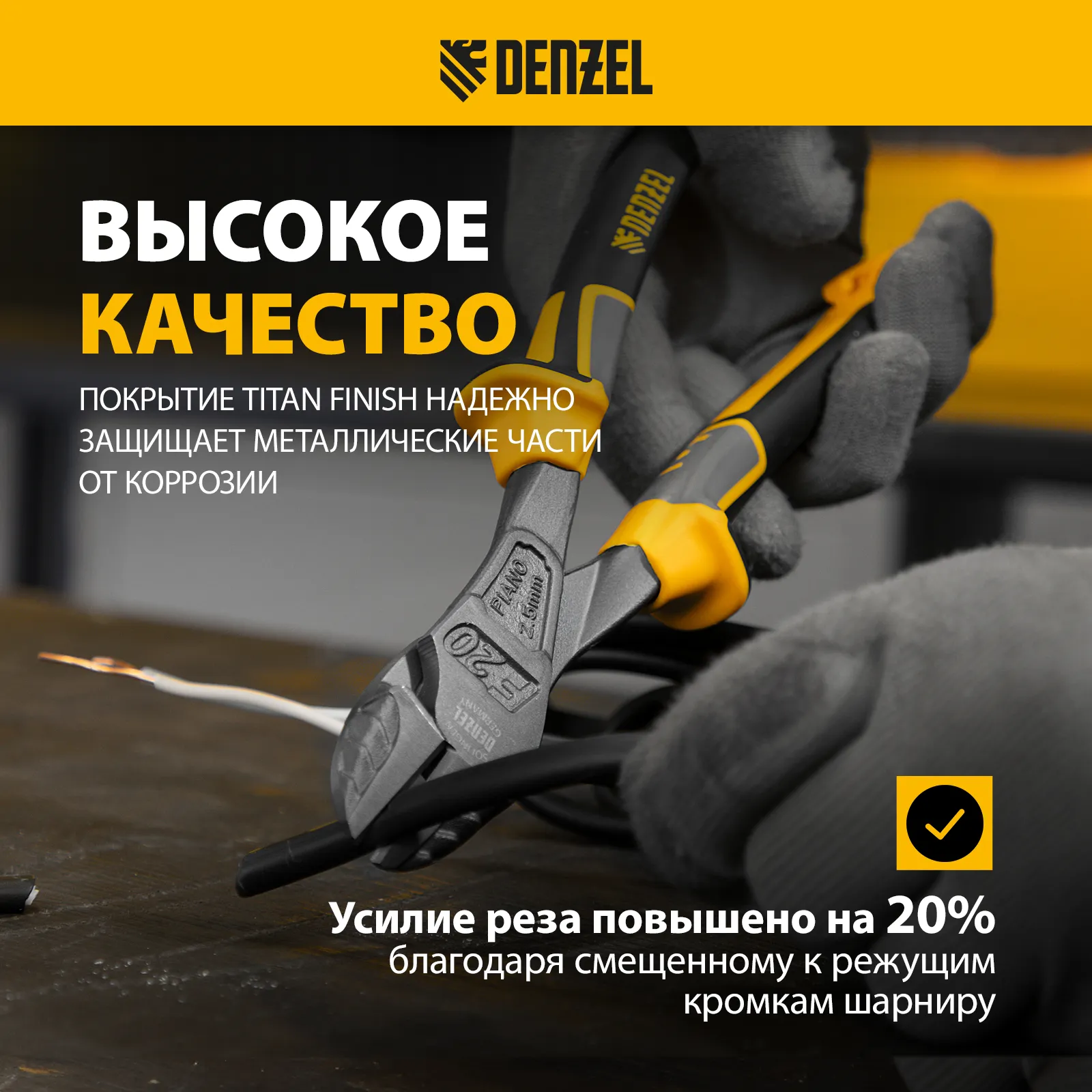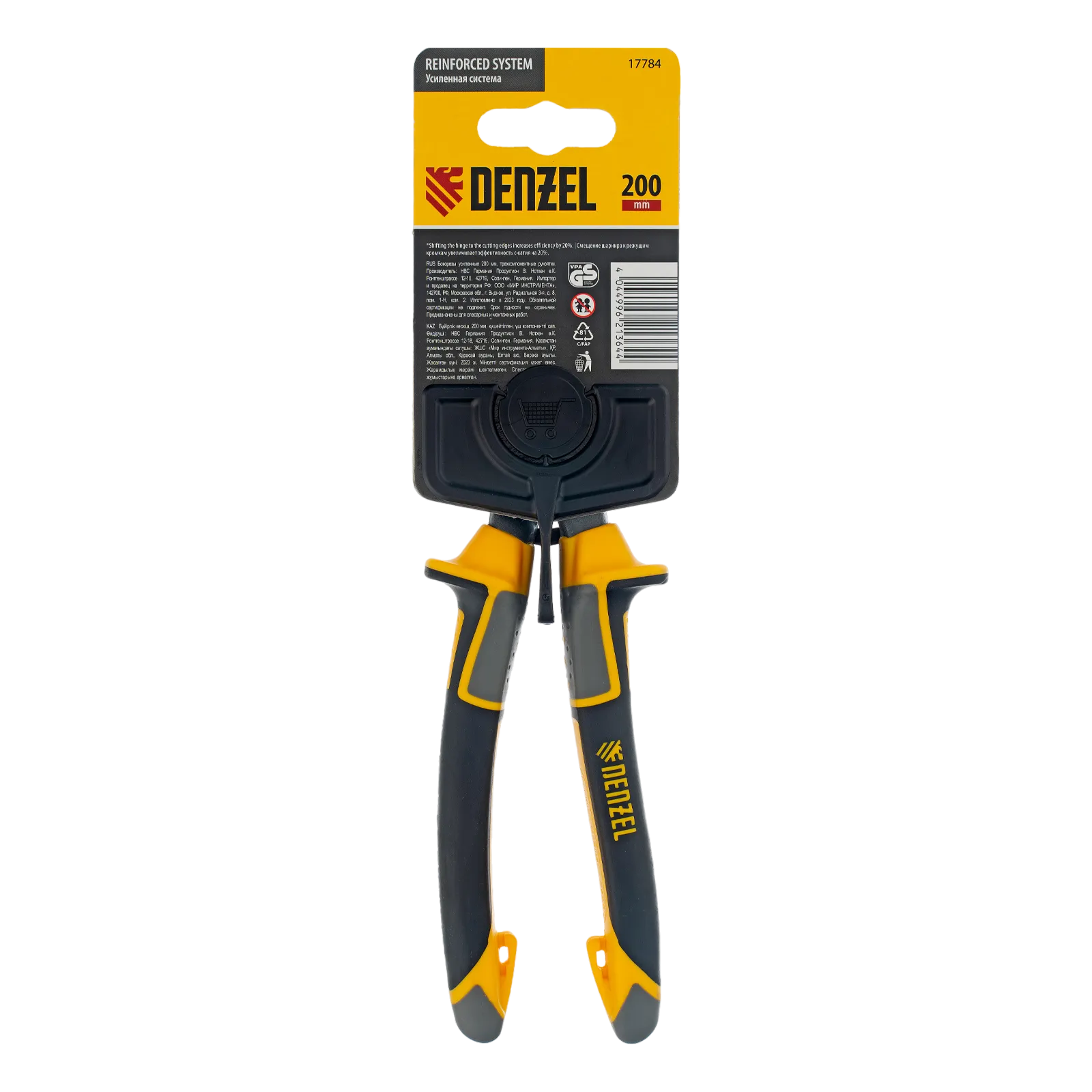 Усиленные бокорезы Denzel 17784 длиной 200 мм, с трехкомпонентными рукоятками, предназначены для разрезания кабелей, проводов, гвоздей и проволоки средней (750 Н/мм2) и высокой жесткости (1800 Н/мм2) диаметром 4 и 2,8 мм соответственно. Подходят для резки рояльных струн (предел прочности 2300 Н/мм2) диаметром до 2,5 мм. Успешно справляются не только с медными, алюминиевыми и пластмассовыми деталями, но и с более жесткими стальными элементами. Встроенный рычажный механизм и смещенный непосредственно к режущим кромкам шарнир увеличивают усилие реза на 20%.