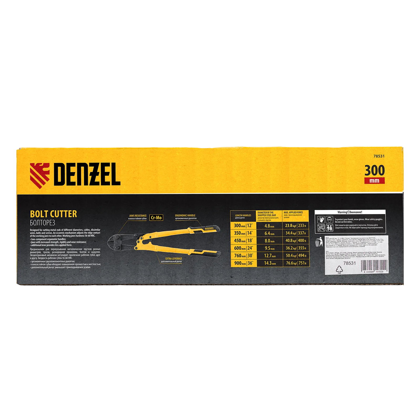 Болторез Denzel 78531 длиной 300 мм (12 дюймов), из стали Cr-Mo, предназначен для перекусывания стальных прутков диаметром 4,8 мм, болтов и шурупов, тросов, разнородной проволоки.