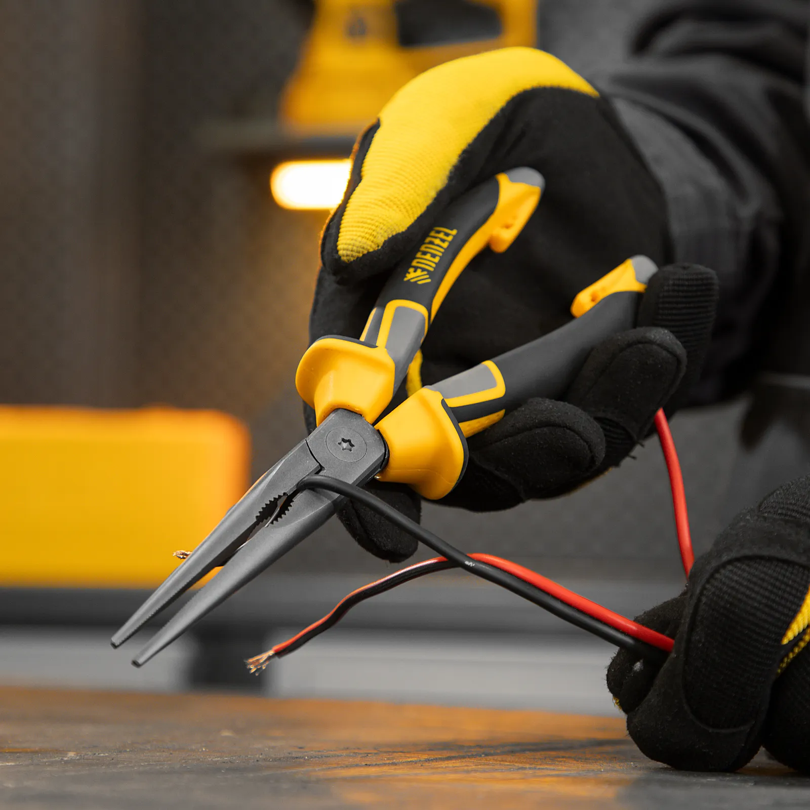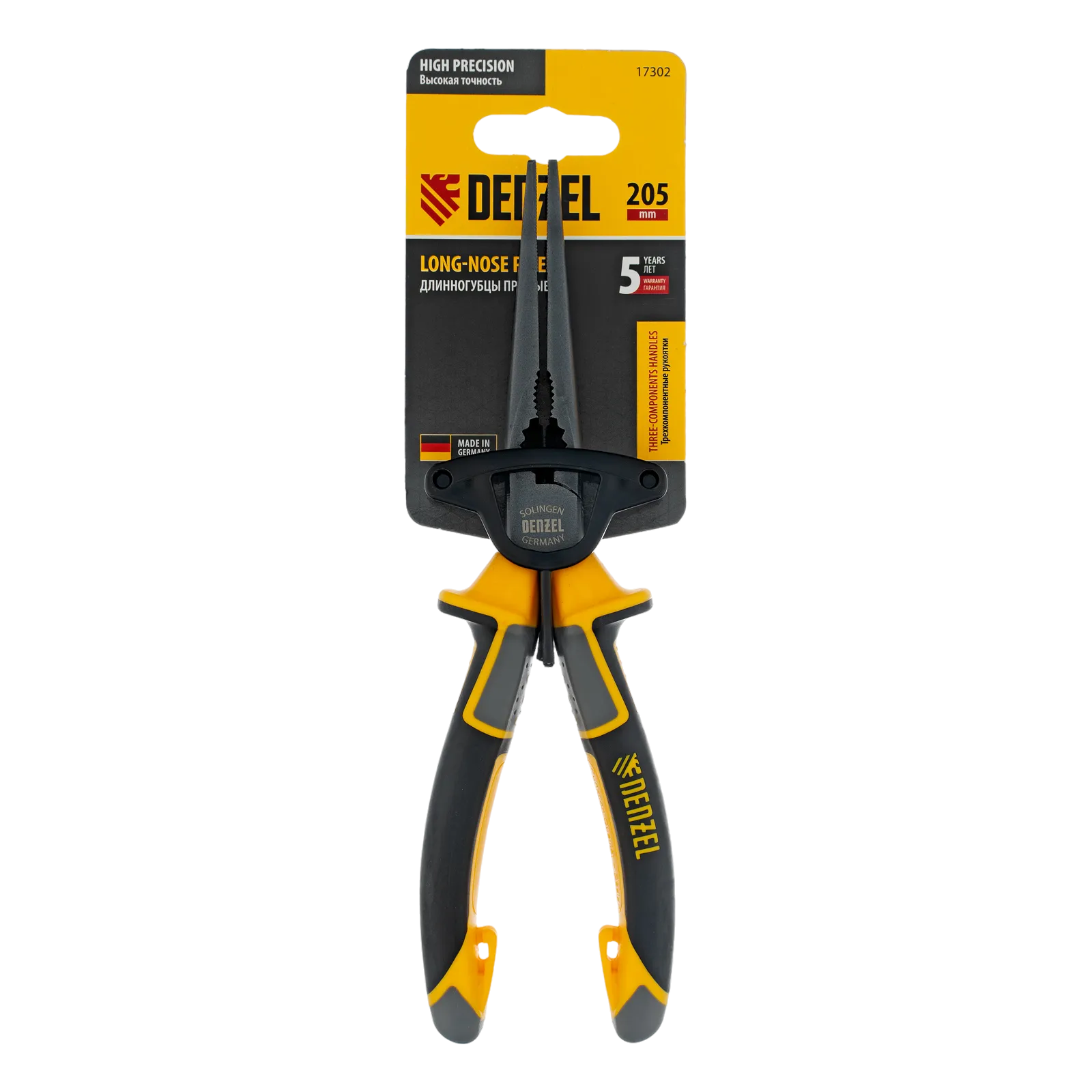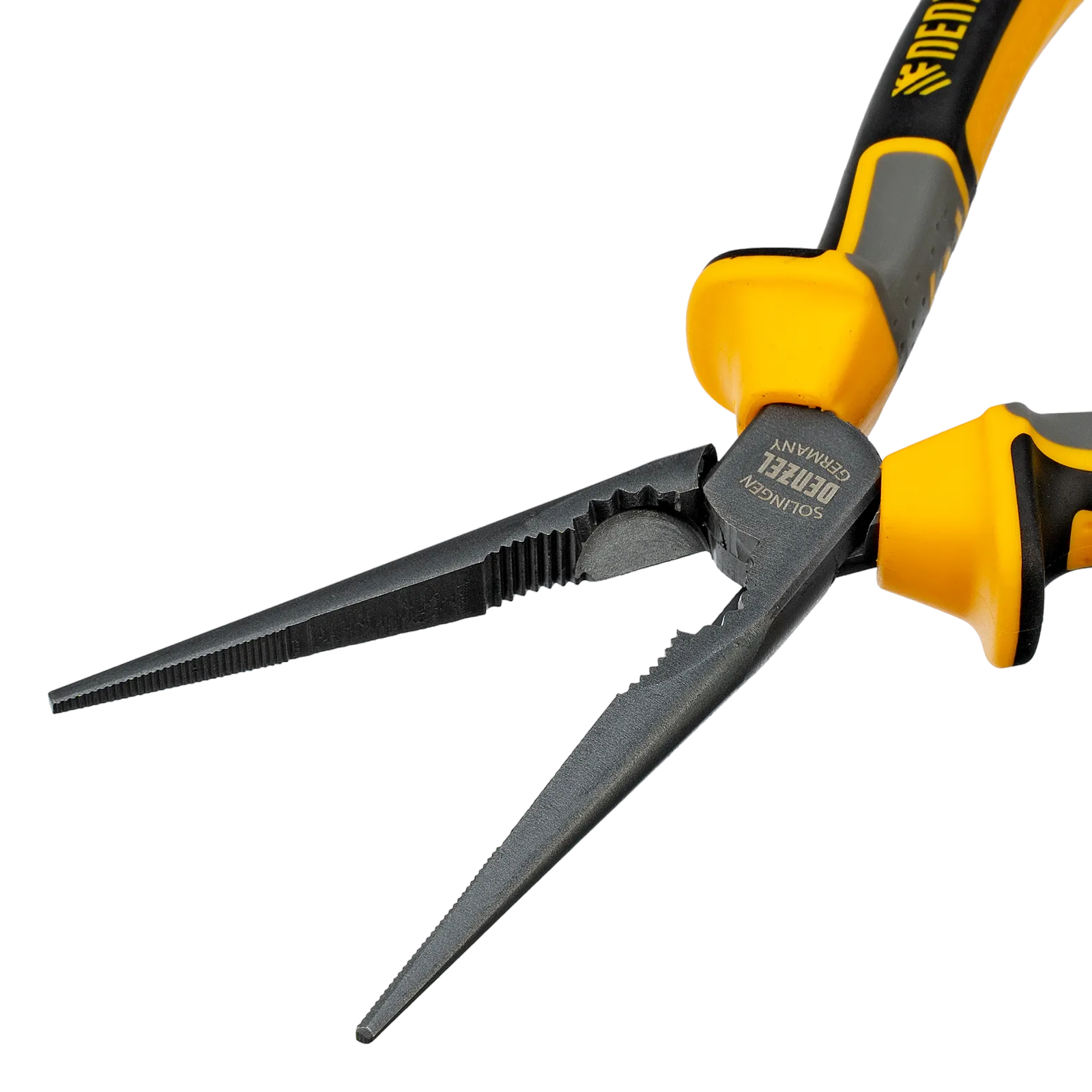 Прямые длинногубцы Denzel 17302 длиной 205 мм, с трехкомпонентными рукоятками, используются для работы с мелкими деталями и крепежом. Позволяют удерживать, сгибать и перекусывать провода или проволоку. Максимальный диаметр перерезаемой мягкой проволоки (алюминиевой, медной, с пределом прочности 220 Н/мм2) составляет 3,9 мм, проволоки средней жесткости и гвоздей (750 Н/мм2) — 3,2 мм, жесткой (1800 Н/мм2) — 2,2 мм. Инструмент оптимален для манипуляций в ограниченном пространстве. Ровные насечки на зажимных частях обеспечивают надежный захват и удержание деталей. Длинногубцы будут полезны во время проведения электромонтажных работ, ремонта оргтехники, техобслуживания автомобиля, пригодятся также в быту.