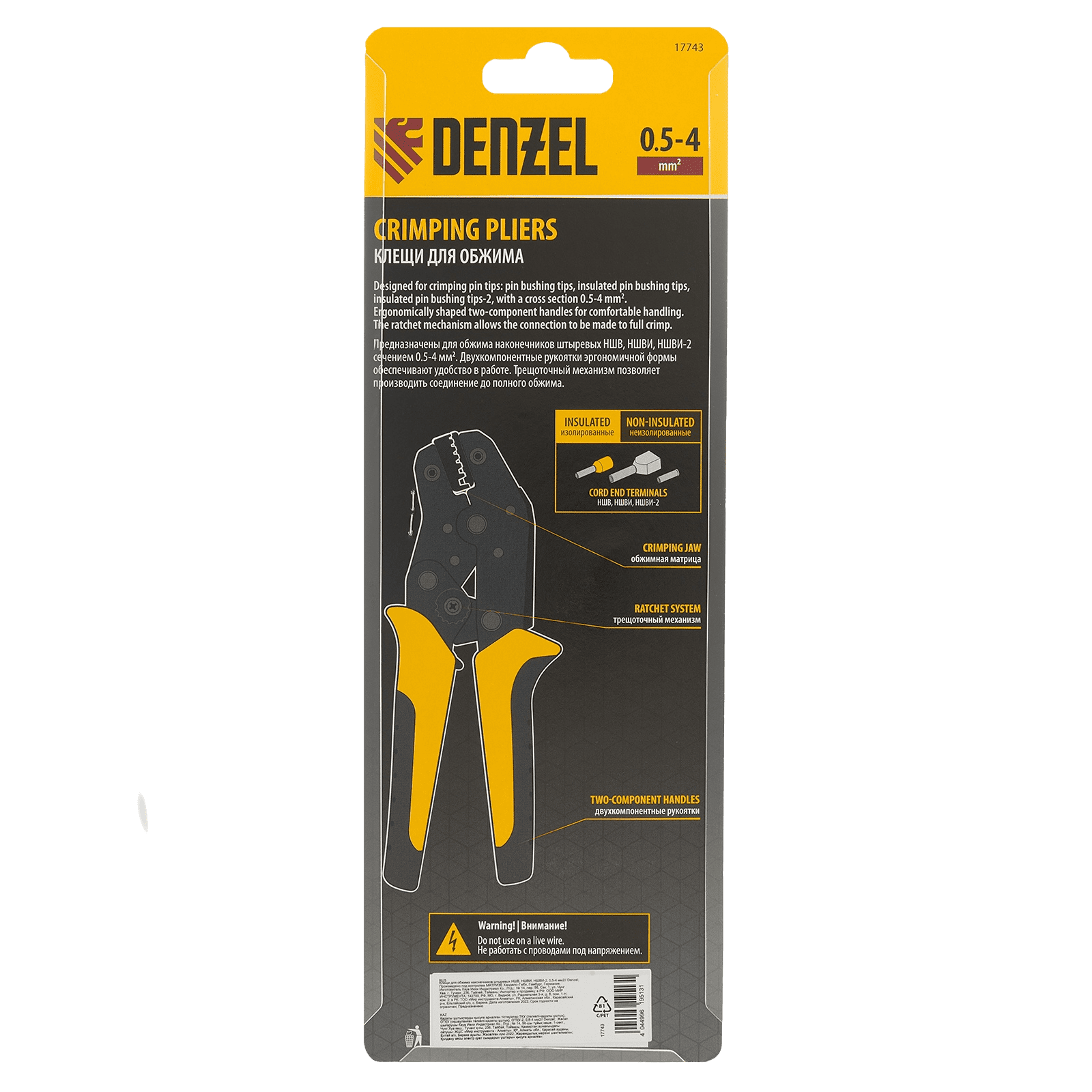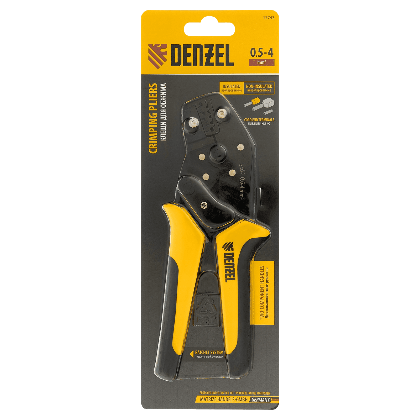 Клещи Denzel 17743 предназначены для обжима наконечников штыревых втулочных НШВ, НШВИ, НШВИ-2 сечением 0,5-4 мм². Двухрычажная передача силы сжатия позволяет увеличить эффективность работы без дополнительных усилий мастера. Инструмент пригодится частным и профессиональным мастерам при проведении электромонтажных работ.