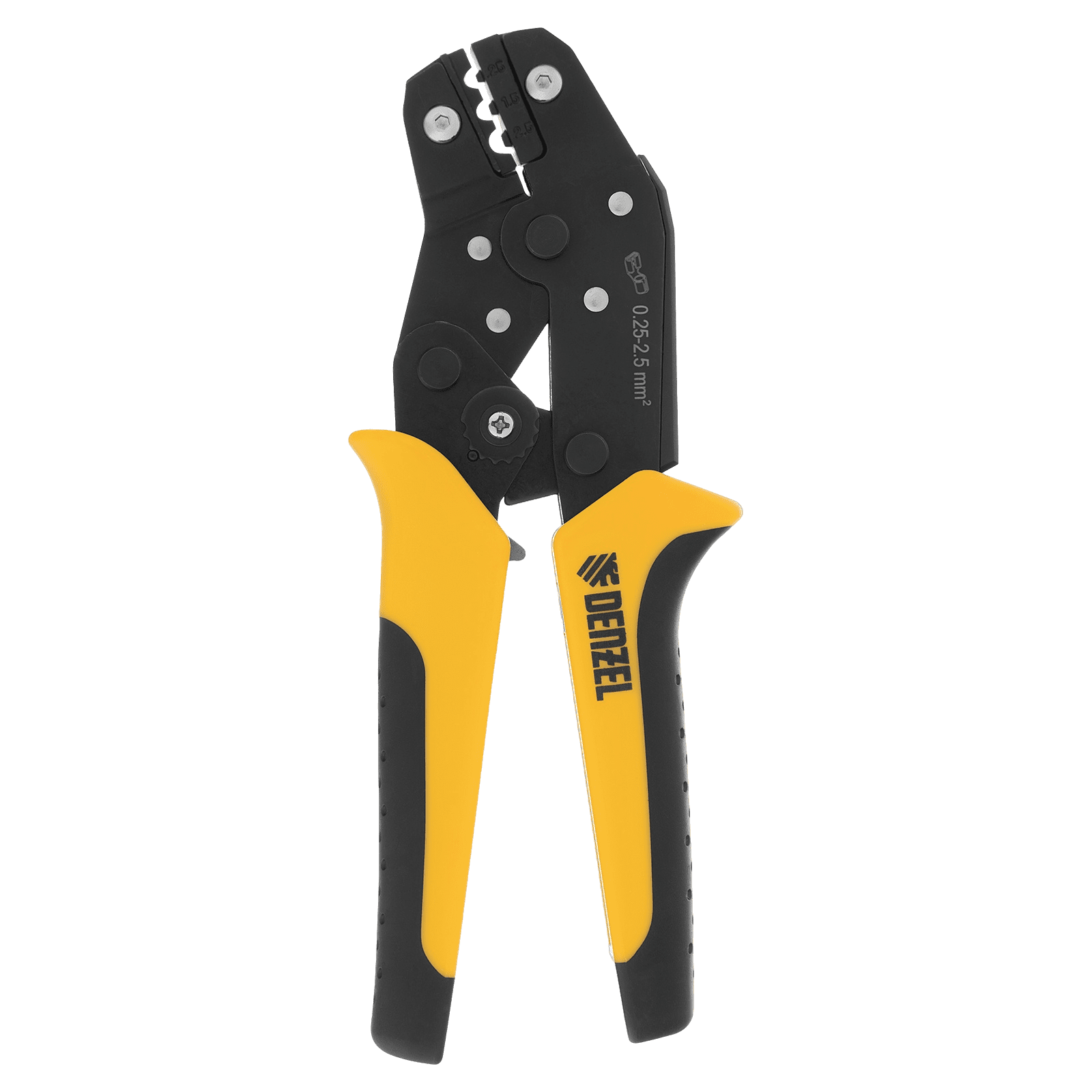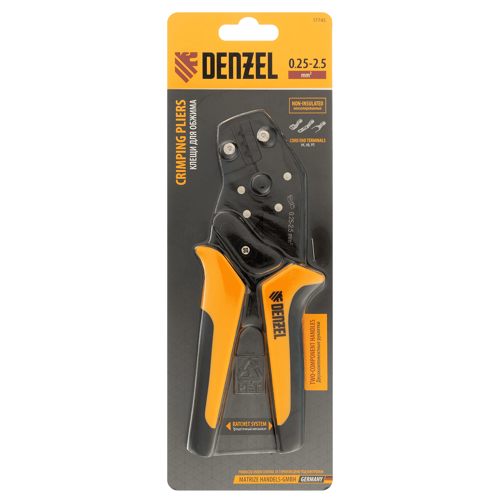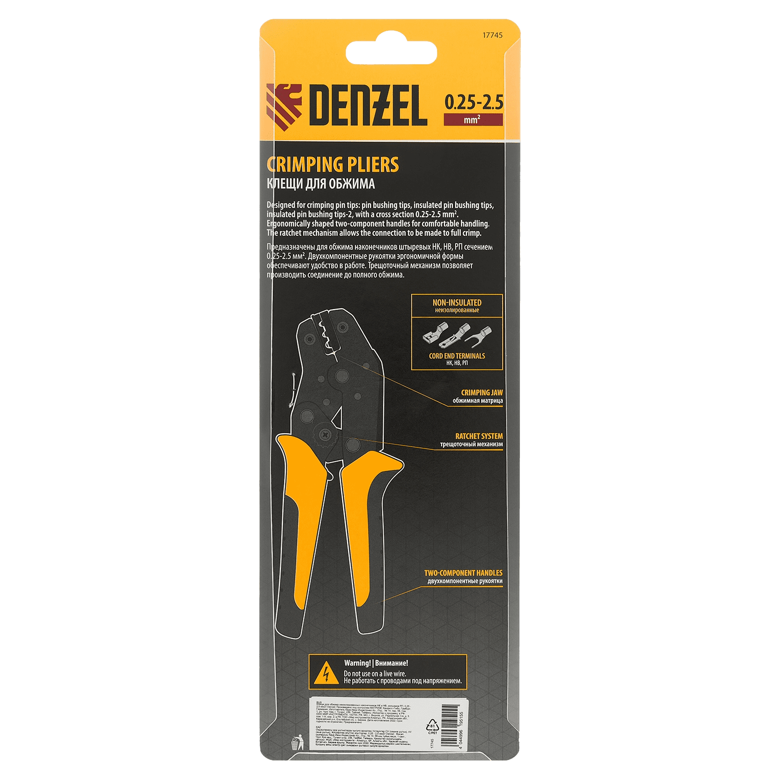 Клещи Denzel 17745 предназначены для обжима неизолированных наконечников кольцевых НК и вилочных НВ, разъемов плоских РП сечением 0,25-2,5 мм². Инструмент пригодится частным и профессиональным мастерам при проведении электромонтажных работ.