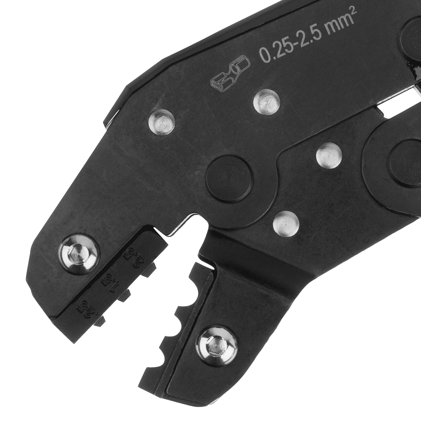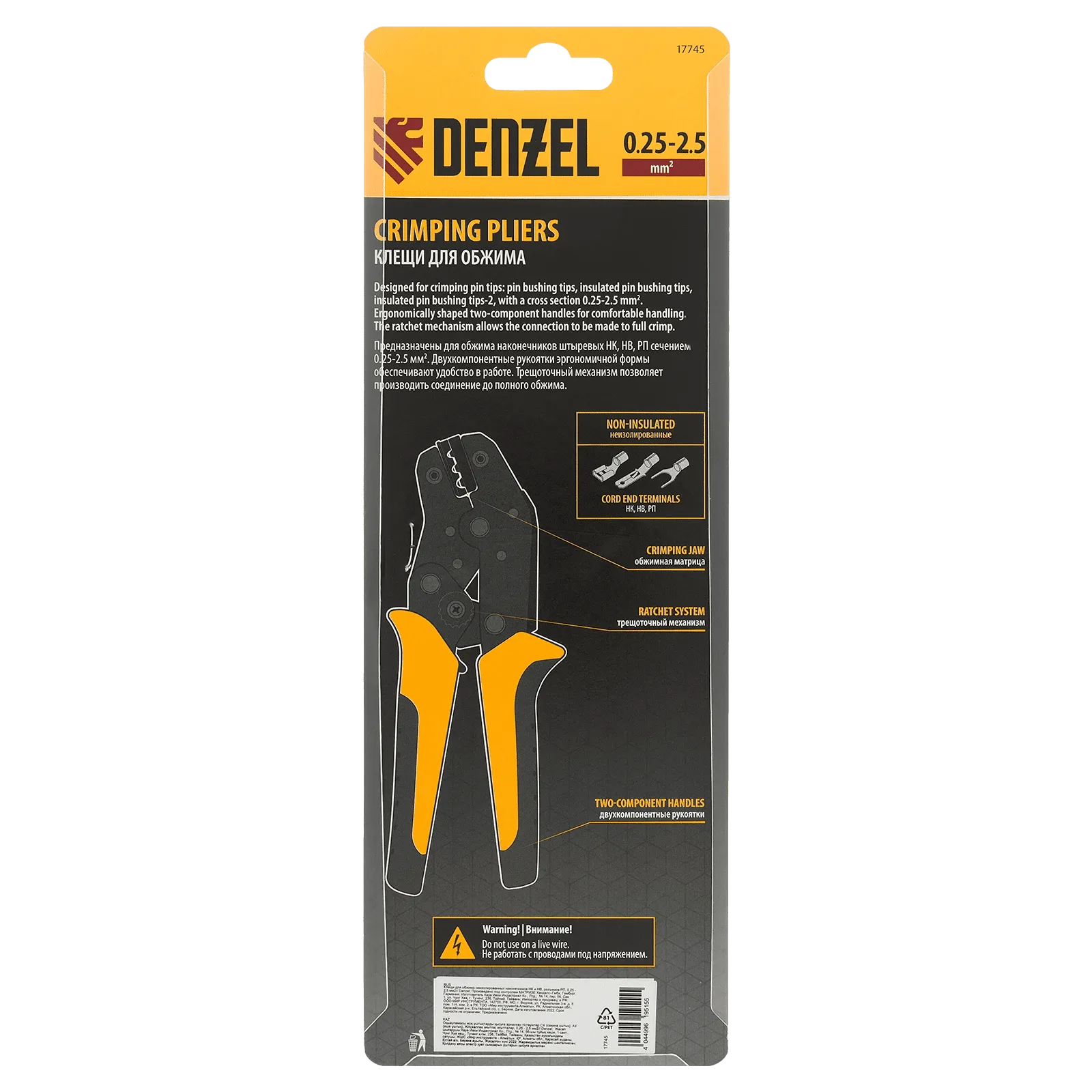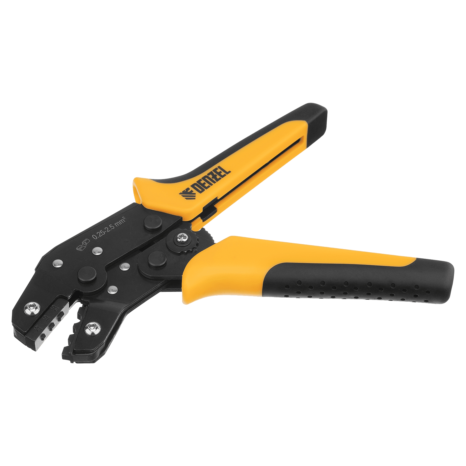 Клещи Denzel 17745 предназначены для обжима неизолированных наконечников кольцевых НК и вилочных НВ, разъемов плоских РП сечением 0,25-2,5 мм². Инструмент пригодится частным и профессиональным мастерам при проведении электромонтажных работ.
