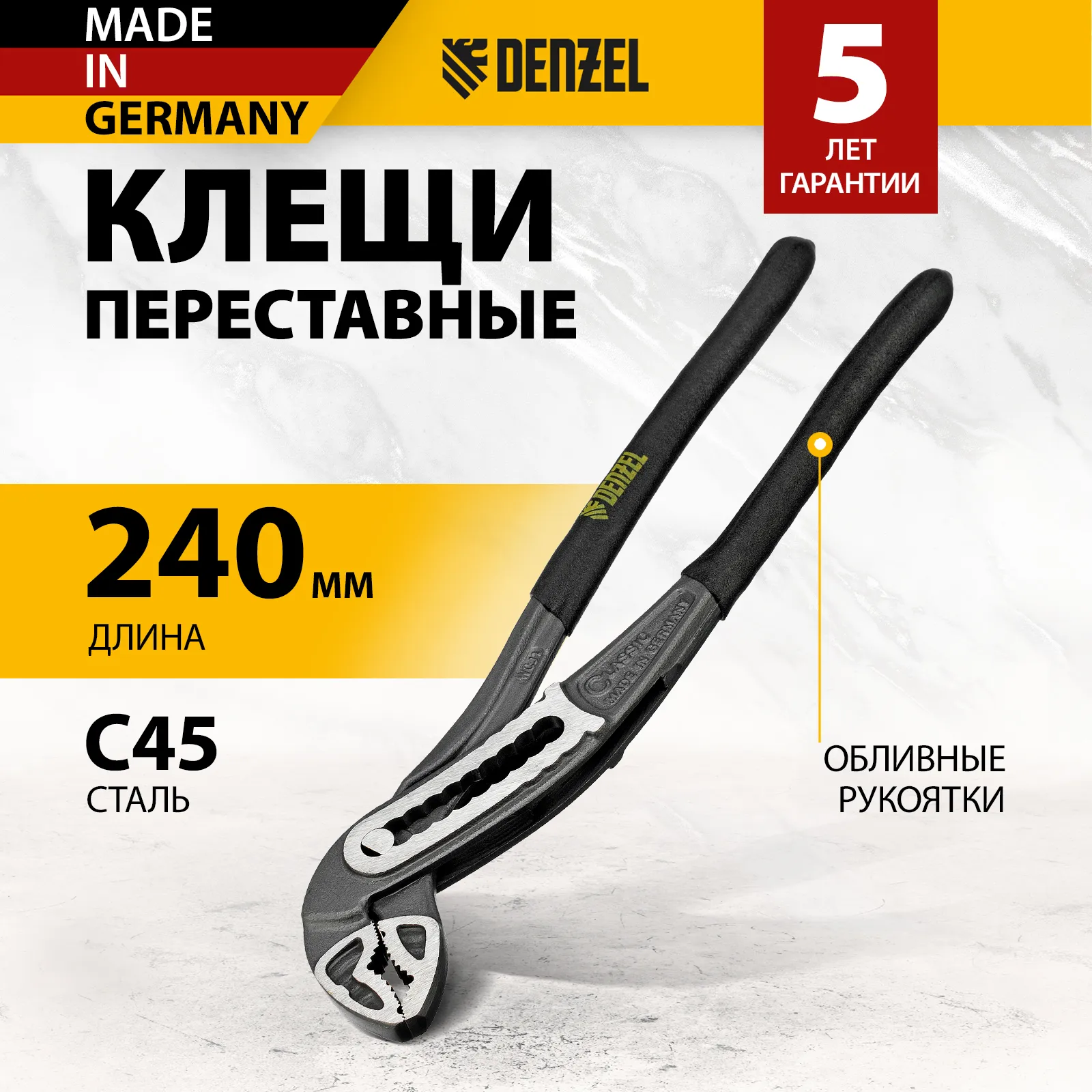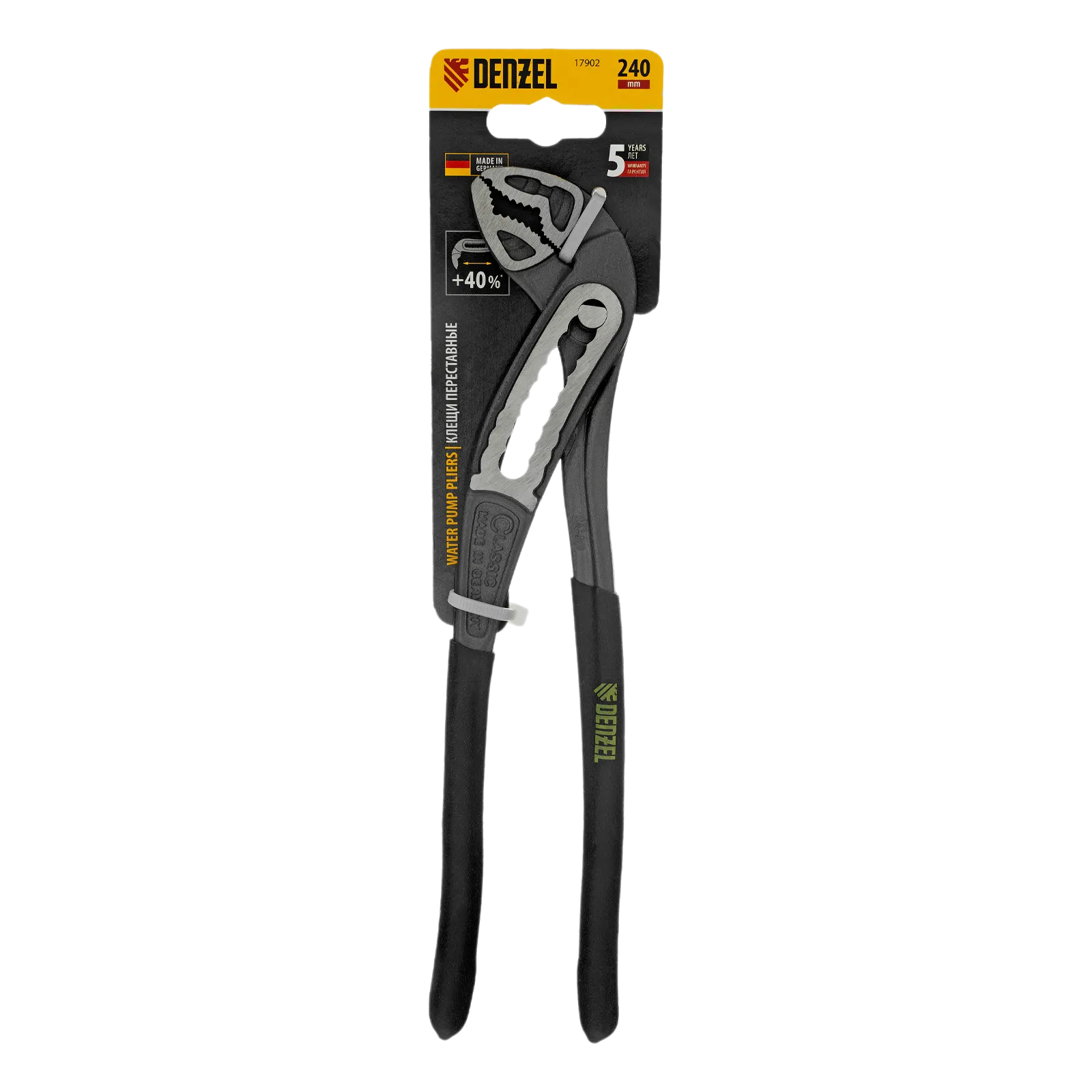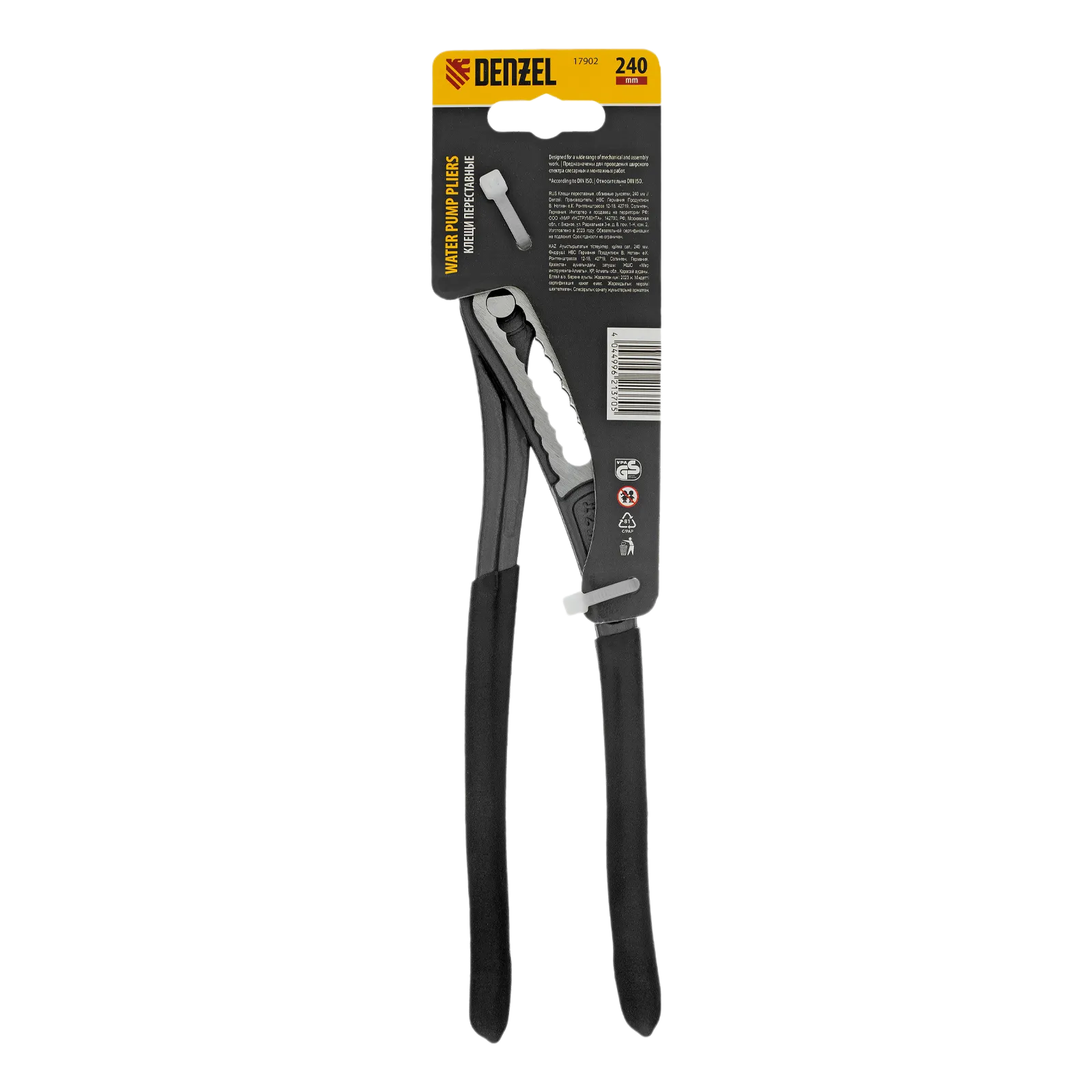 Переставные клещи Denzel 17902 длиной 240 мм, с обливными рукоятками, предназначены для фиксации и вращения деталей и заготовок различной формы. Подходят для захвата фитингов, труб, крепежных элементов. Инструмент используется при проведении ремонтных, монтажных, сантехнических работ.