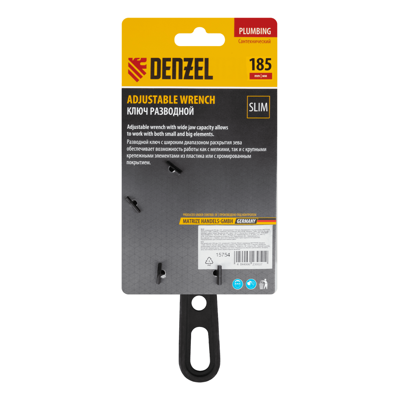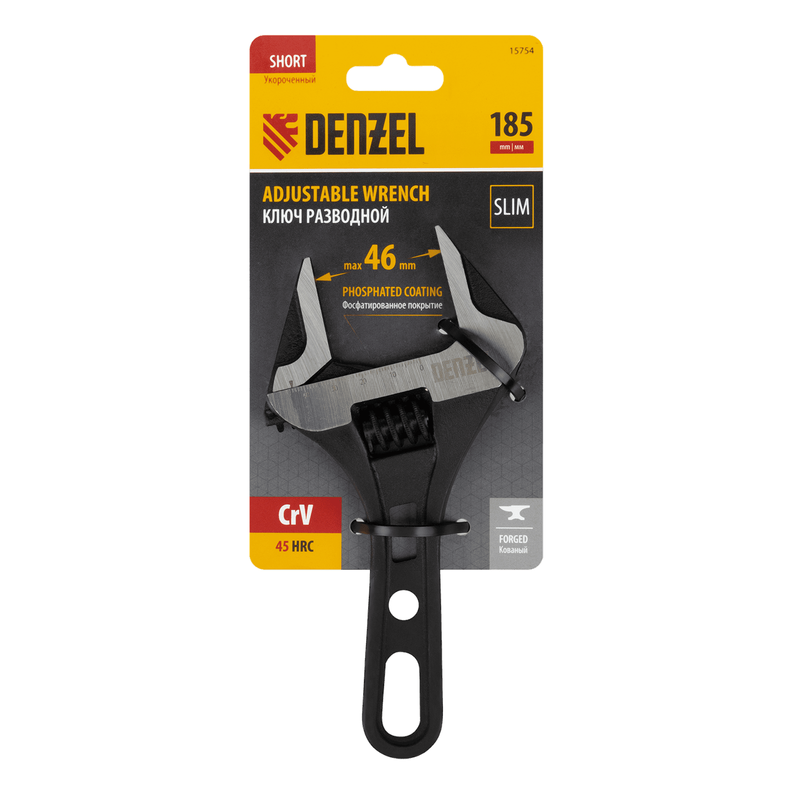 Ключ разводной кованый Denzel 15754 длиной 185 мм, из стали CrV, с укороченной рукояткой и увеличенным раскрытием губок, используется для монтажа и демонтажа крепежных элементов диаметром до 46 мм. Благодаря тонким губкам и укороченной рукоятке удобен для работы в труднодоступных местах. Имеет широкую область применения: сантехнические работы, мелкий бытовой ремонт, полупрофессиональная сфера и т. д.