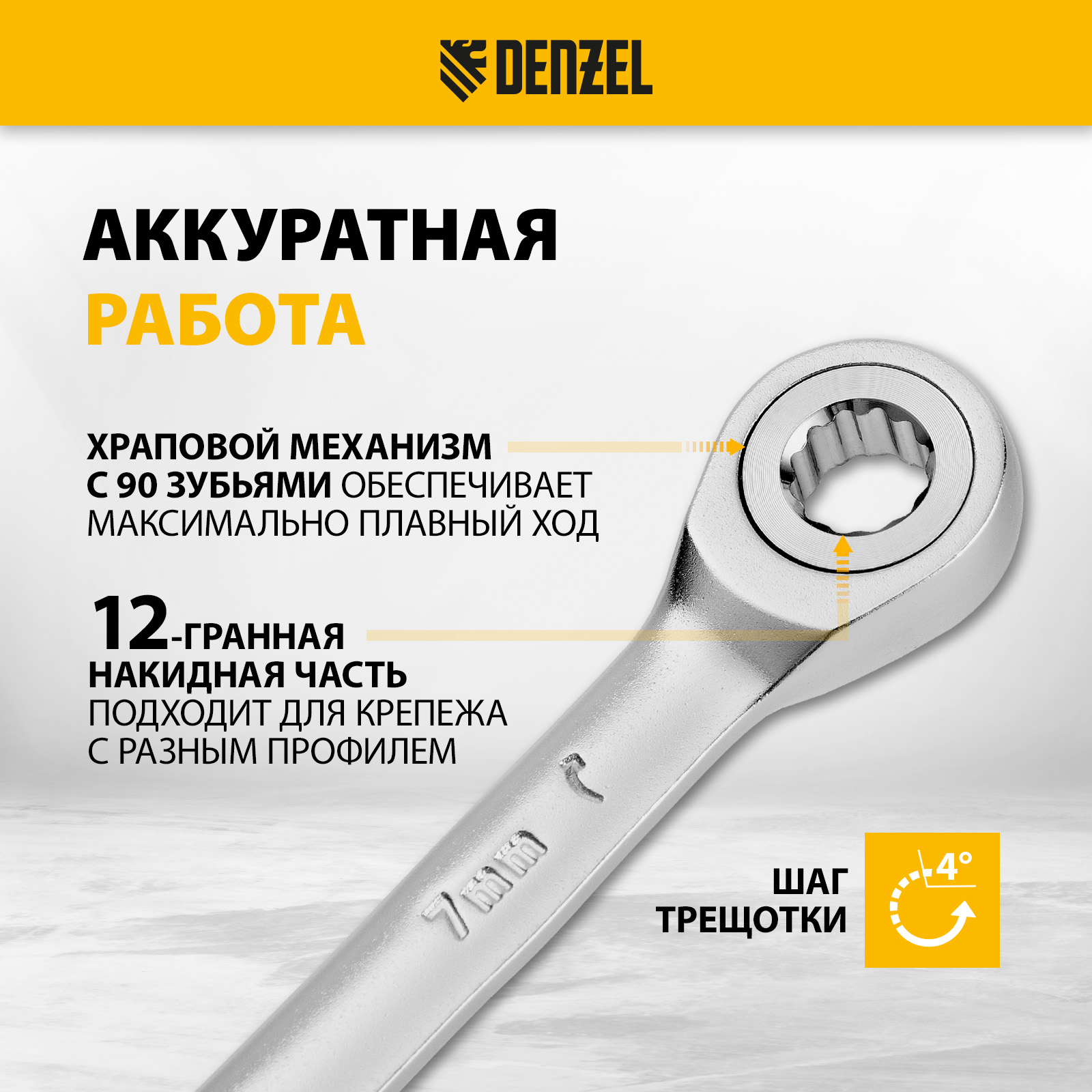 Комбинированный трещоточный ключ Denzel 14701 из стали CrV, с защитным покрытием «матовый хром», предназначен для работы с резьбовым крепежом размером 7 мм. Рожковый профиль упрощает работу в местах, где использование накидной рабочей части невозможно. 12-гранный профиль кольцевой части подходит для крепежа с разным профилем. Хромированное кольцо обеспечивает сохранность и долговечность инструмента. Ключ будет полезен дома, в мастерской и гараже.