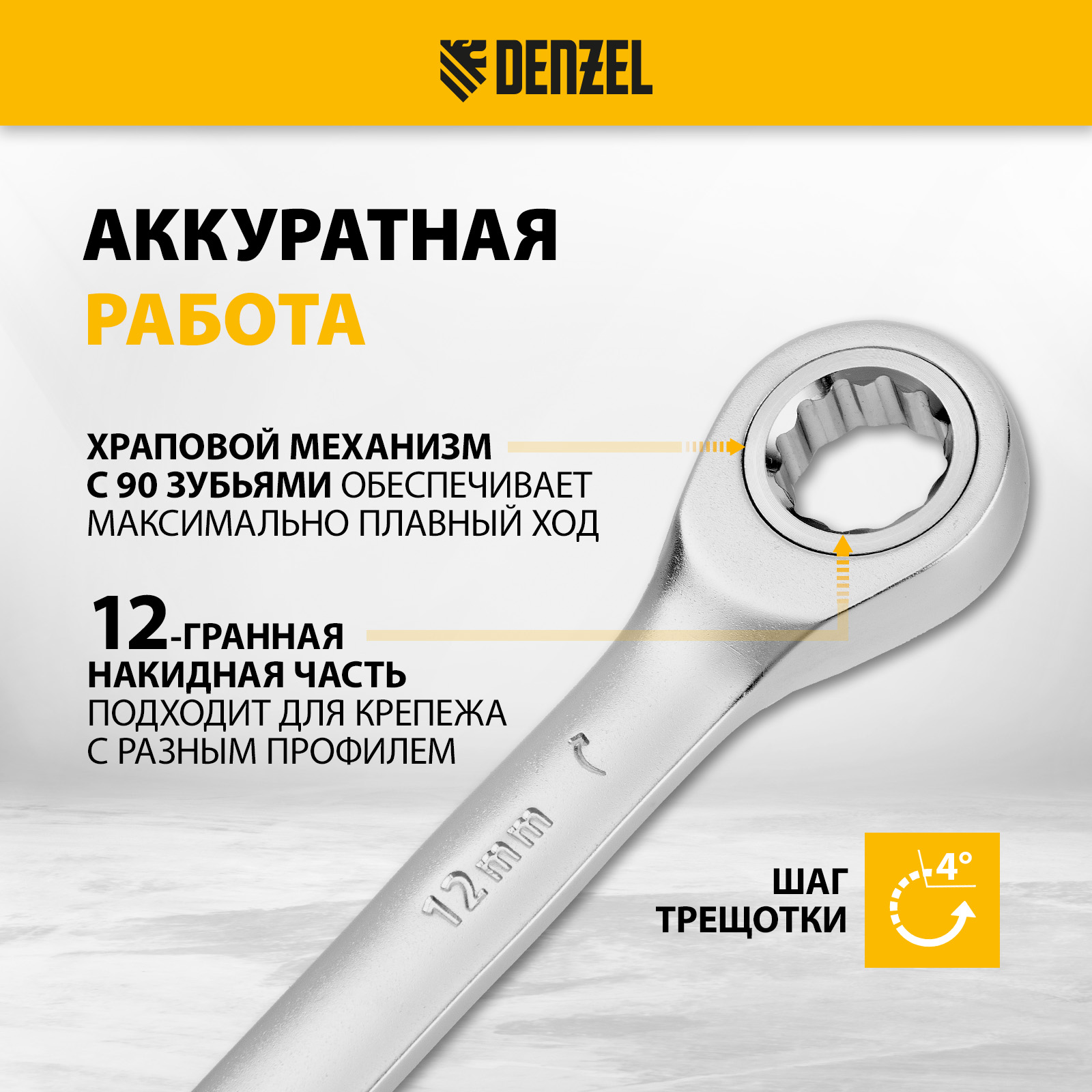 Комбинированный трещоточный ключ Denzel 14706 из стали CrV, с защитным покрытием «матовый хром», предназначен для работы с резьбовым крепежом размером 12 мм. Рожковый профиль упрощает работу в местах, где использование накидной рабочей части невозможно. 12-гранный профиль кольцевой части подходит для крепежа с разным профилем. Хромированное кольцо обеспечивает сохранность и долговечность инструмента. Ключ будет полезен дома, в мастерской и гараже.