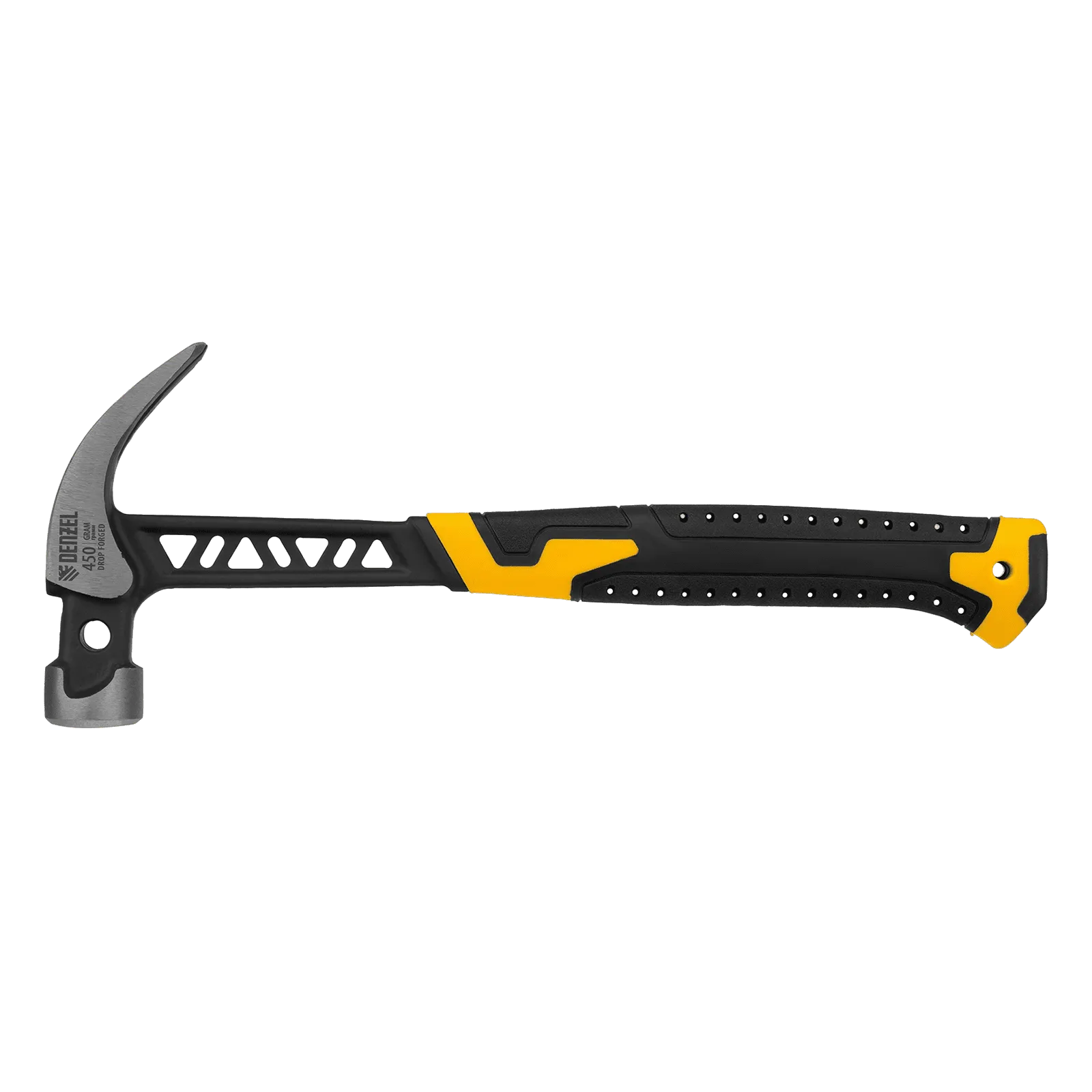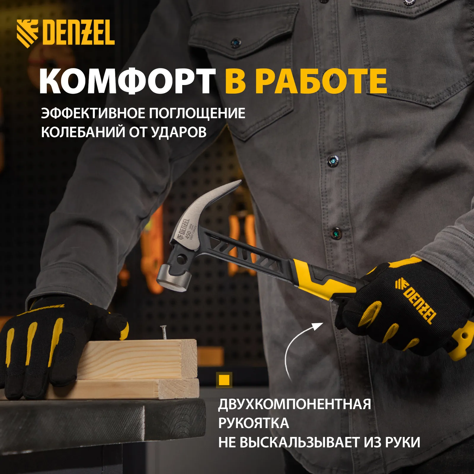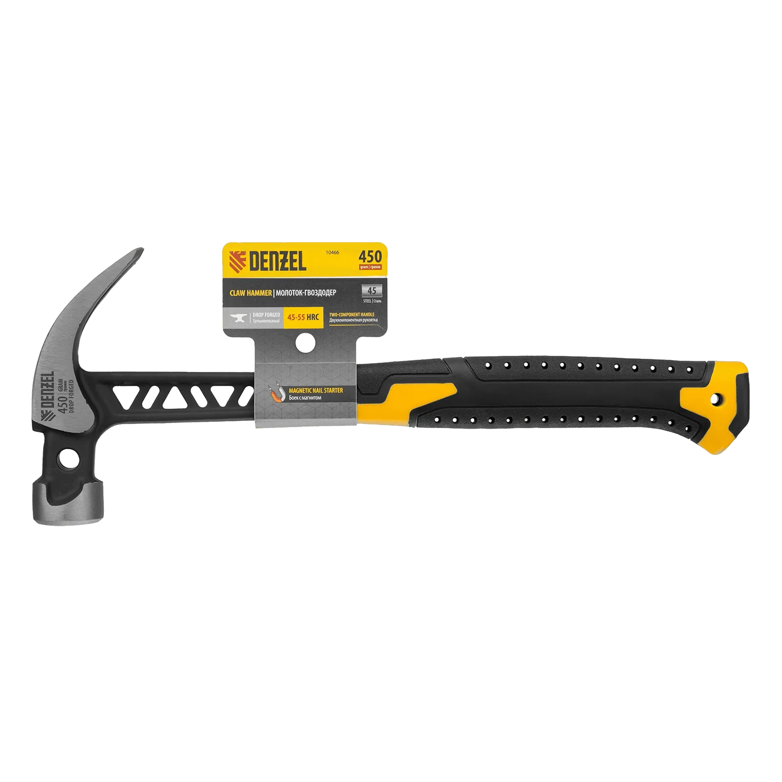 Цельнокованый молоток-гвоздодер Denzel 10466 с бойком весом 450 г, с магнитом и двухкомпонентной обрезиненной рукояткой, предназначен для забивания и извлечения гвоздей. Имеет рабочую часть специальной формы — с круглым бойком и плоским носком с клиновидной прорезью. Магнитный держатель в верхней части бойка позволяет установить гвоздь, не придерживая его рукой, что упрощает работу в труднодоступных местах. Молоток используется в профессиональной сфере, пригодится также и в быту.