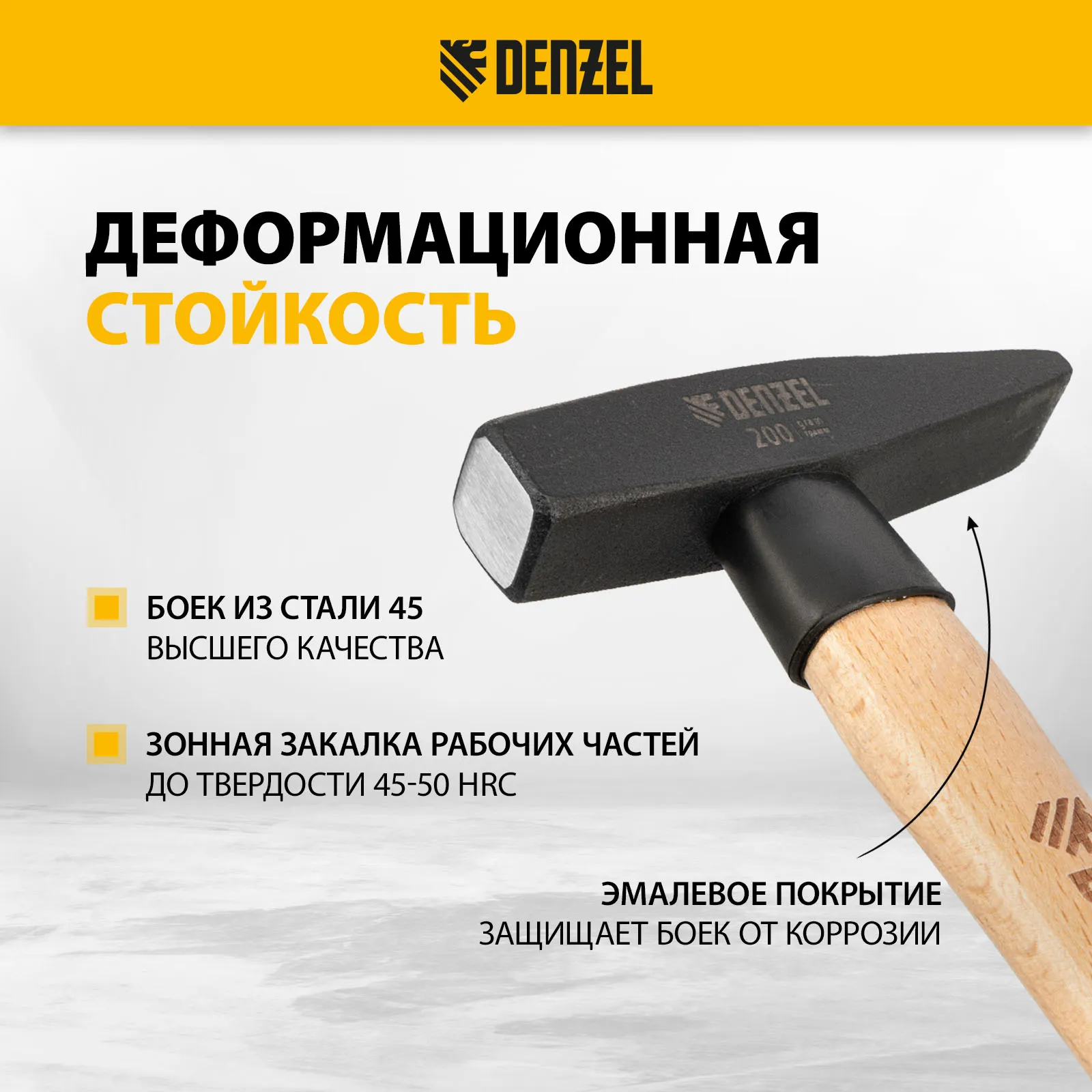 Слесарный молоток Denzel 10426 с квадратным кованым бойком весом 200 г предназначен для забивания гвоздей и другого крепежа и для работы с металлическими заготовками. Инструмент применяется во время слесарных или столярных работ в быту, также будет полезен профессионалам.