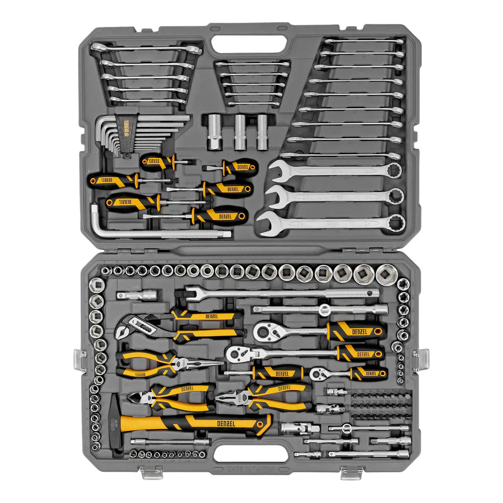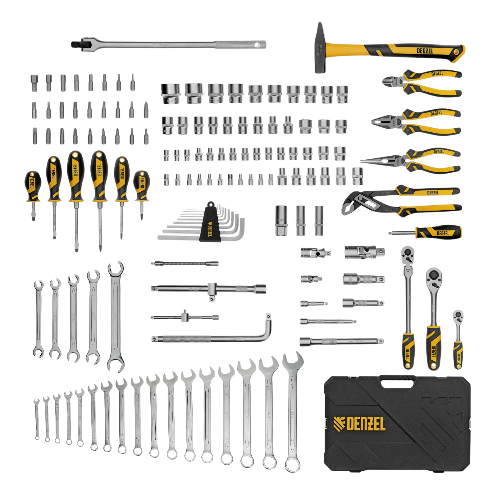 Набор инструментов Denzel 15805 состоит из 144 предметов с присоединительными квадратами 1/4″ и 1/2″, упакованных во вместительный ударопрочный кейс собственной разработки с антивандальным покрытием. В комплект поставки входят инструменты и оснастка для монтажа и демонтажа резьбовых соединений, а также молоток, переставные клещи, бокорезы, длинногубцы и плоскогубцы для выполнения слесарных и сантехнических работ. Набор предназначен для профессионального использования в автомастерской, будет полезен и для решения бытовых вопросов.