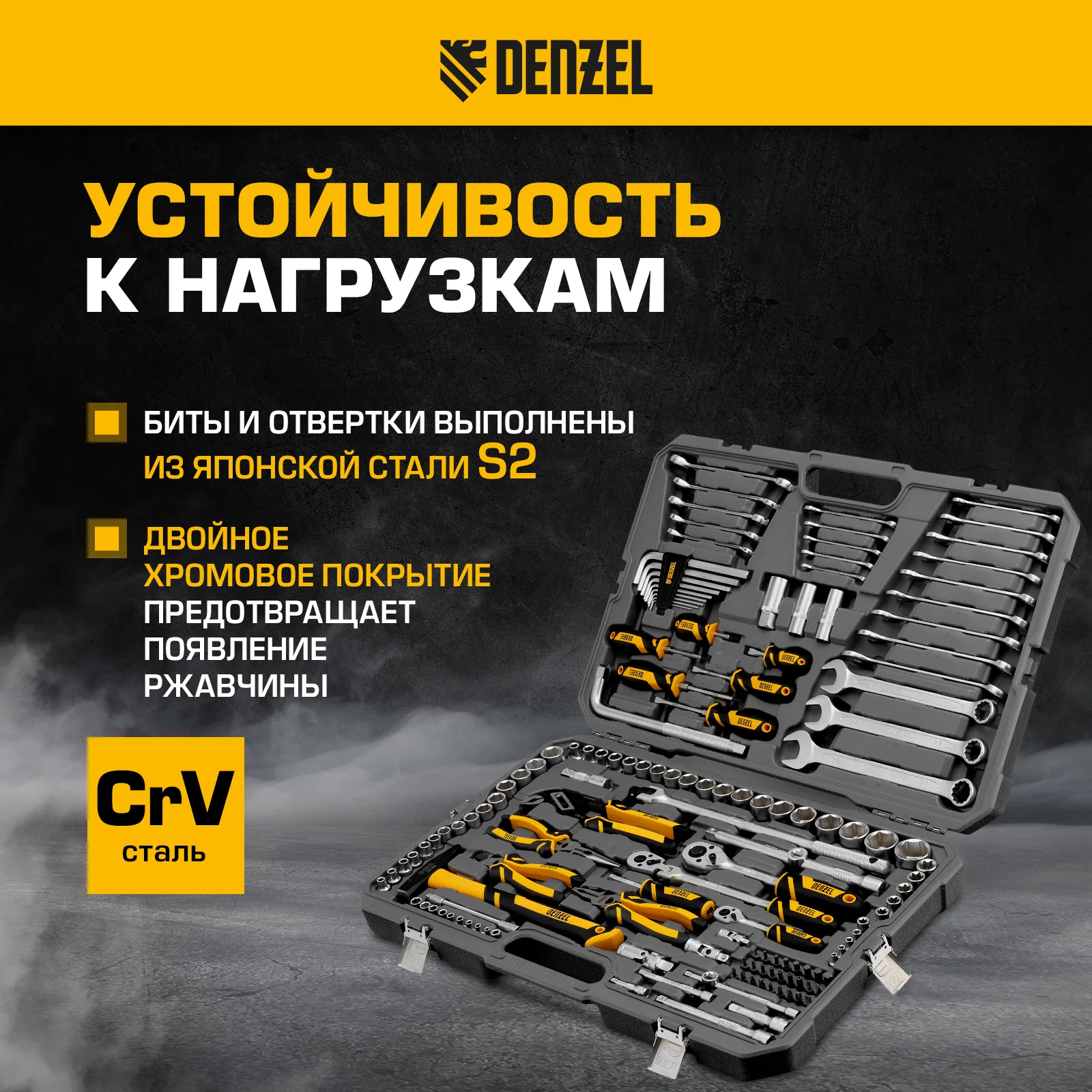 - Устойчивость к высоким нагрузкам — инструменты изготовлены из высокопрочной закаленной стали CrV, биты и отвертки выполнены из японской стали S2.