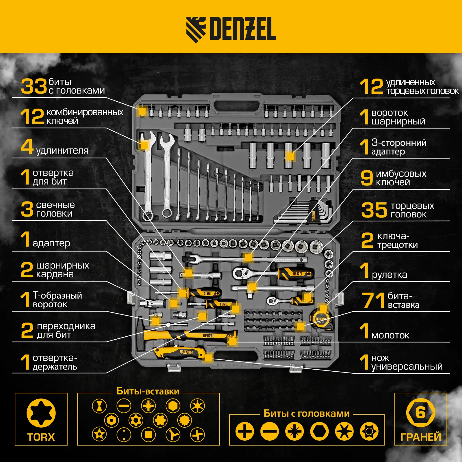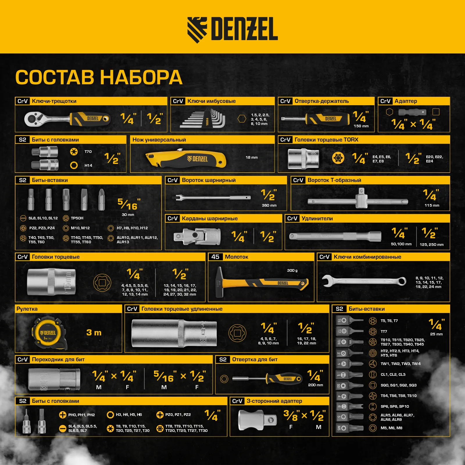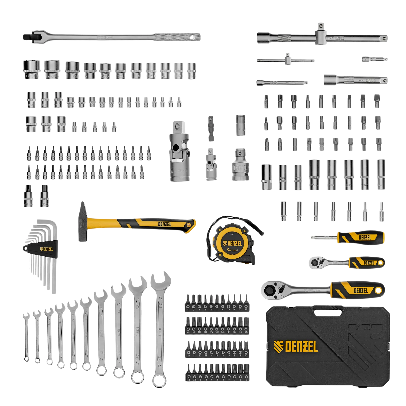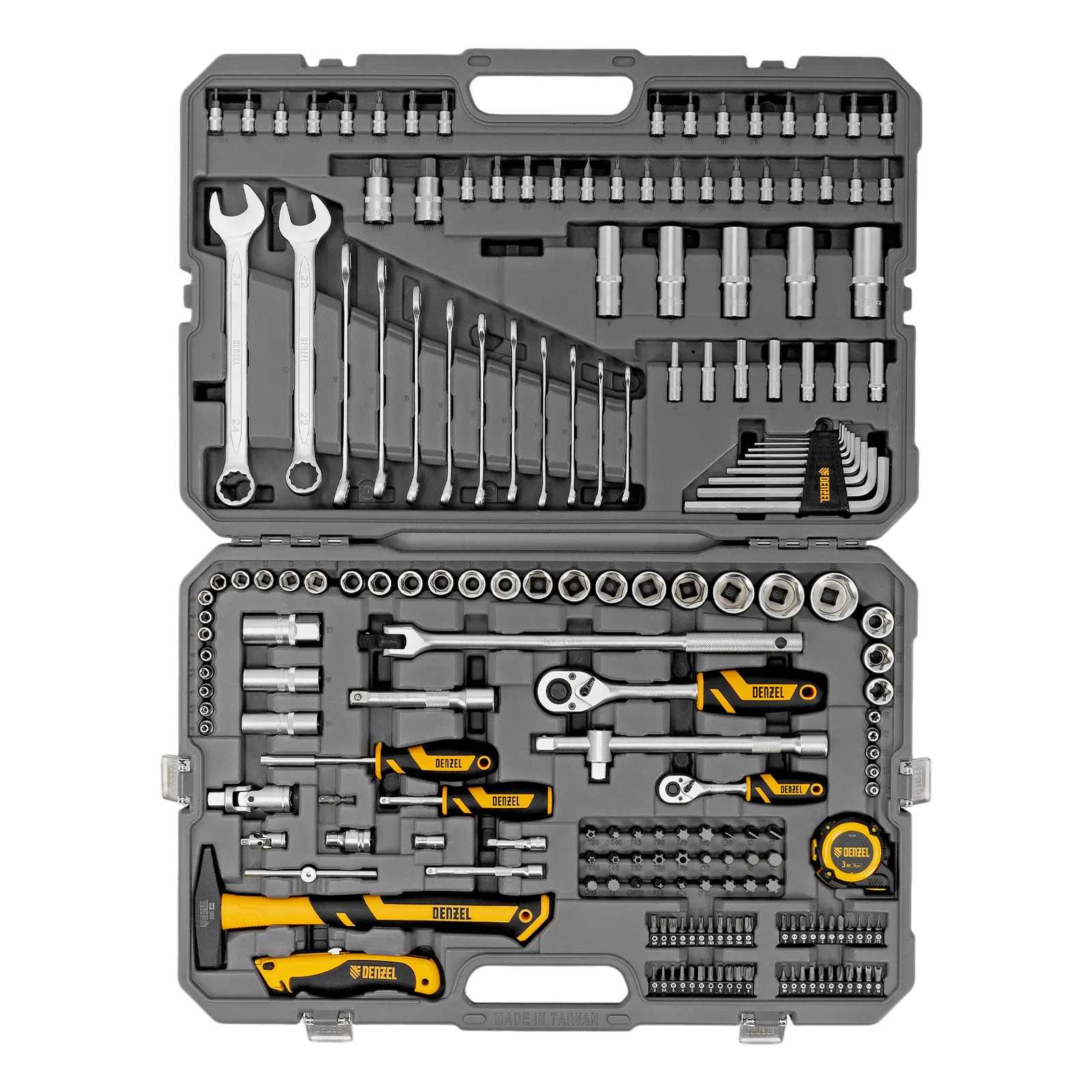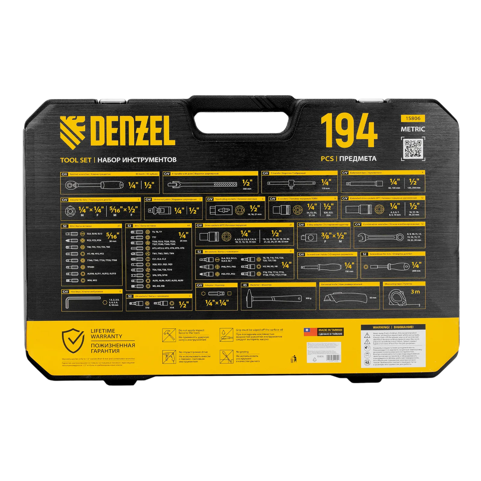 Набор инструментов Denzel 15806 состоит из 194 предметов с присоединительными квадратами 1/4″ и 1/2″, упакованных во вместительный ударопрочный кейс собственной разработки с антивандальным покрытием. В комплект поставки входят инструменты и оснастка для монтажа и демонтажа резьбовых соединений, а также молоток для выполнения ударных работ, рулетка для проведения измерений и нож для резки материалов. Набор предназначен для профессионального использования в автомастерской, будет полезен и для решения бытовых вопросов.