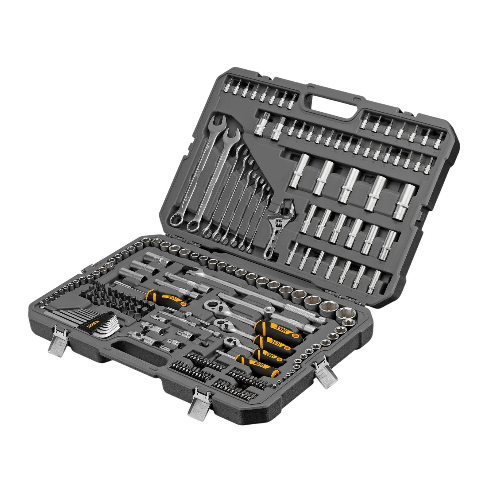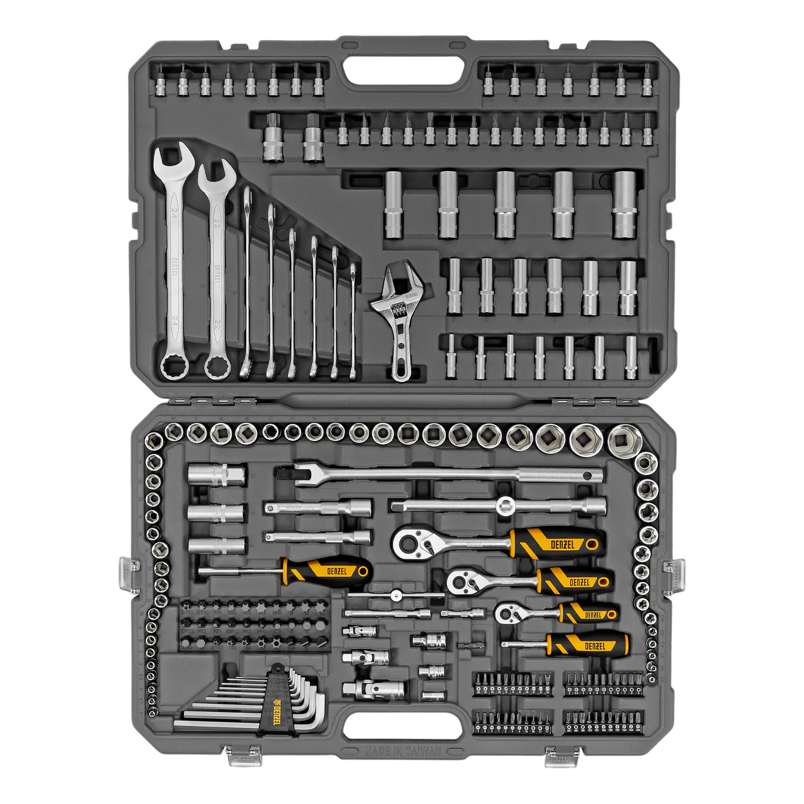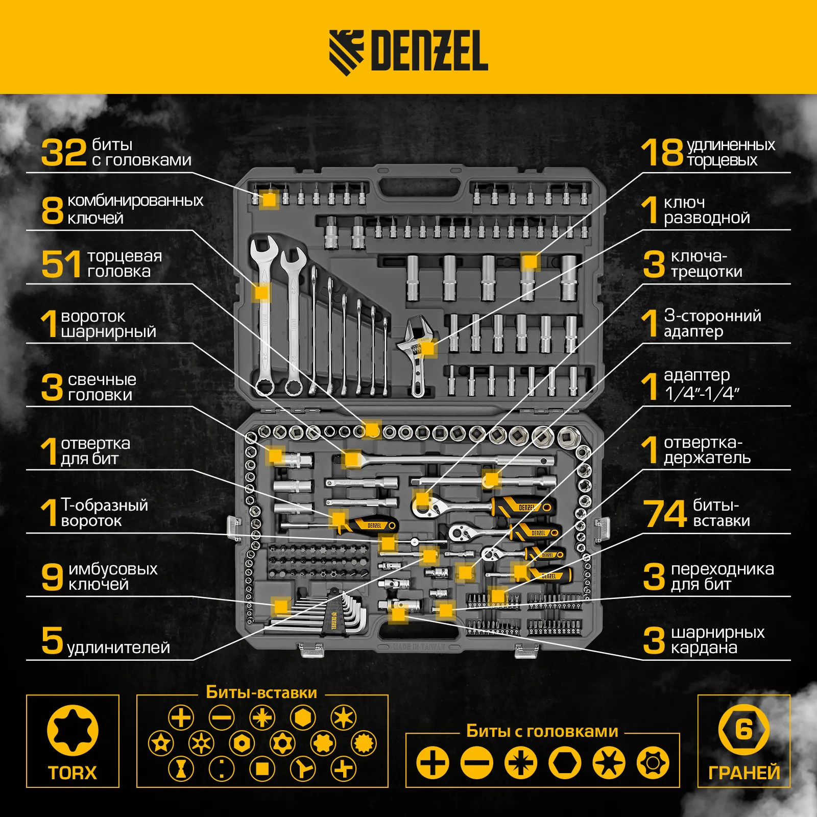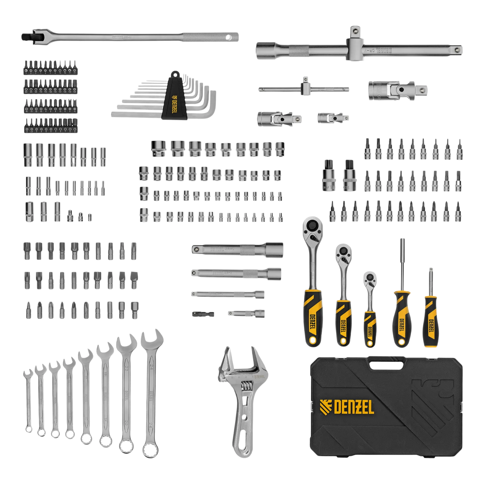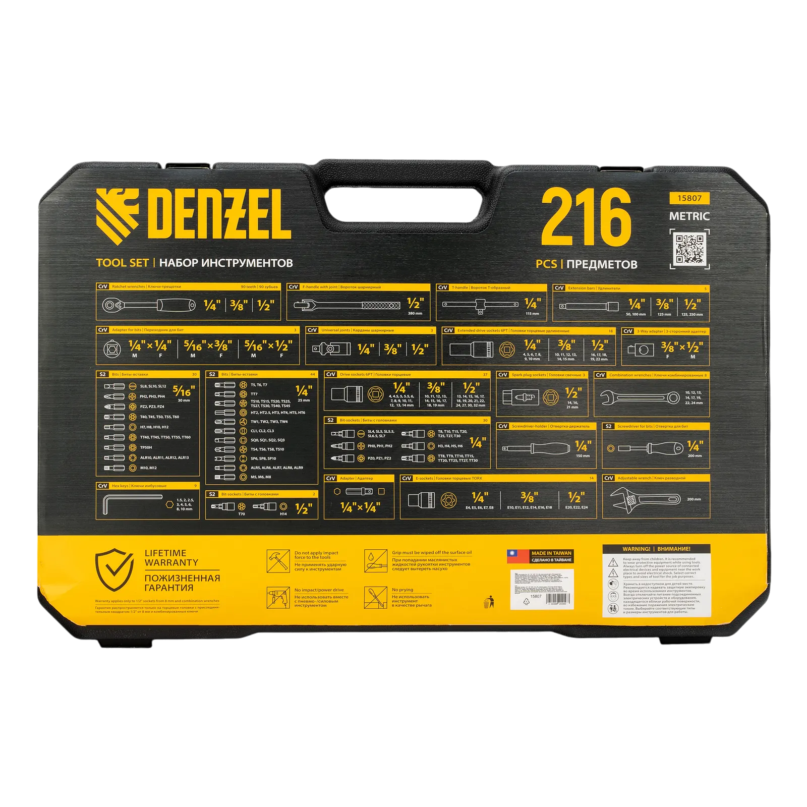 Набор инструментов Denzel 15807 состоит из 216 предметов с присоединительными квадратами 1/4″, 1/2″, 3/8″, упакованных во вместительный ударопрочный кейс собственной разработки с антивандальным покрытием. В комплект поставки входят инструменты и оснастка для монтажа и демонтажа резьбовых соединений. Набор предназначен для профессионального использования в автомастерской, будет полезен и для решения бытовых вопросов.