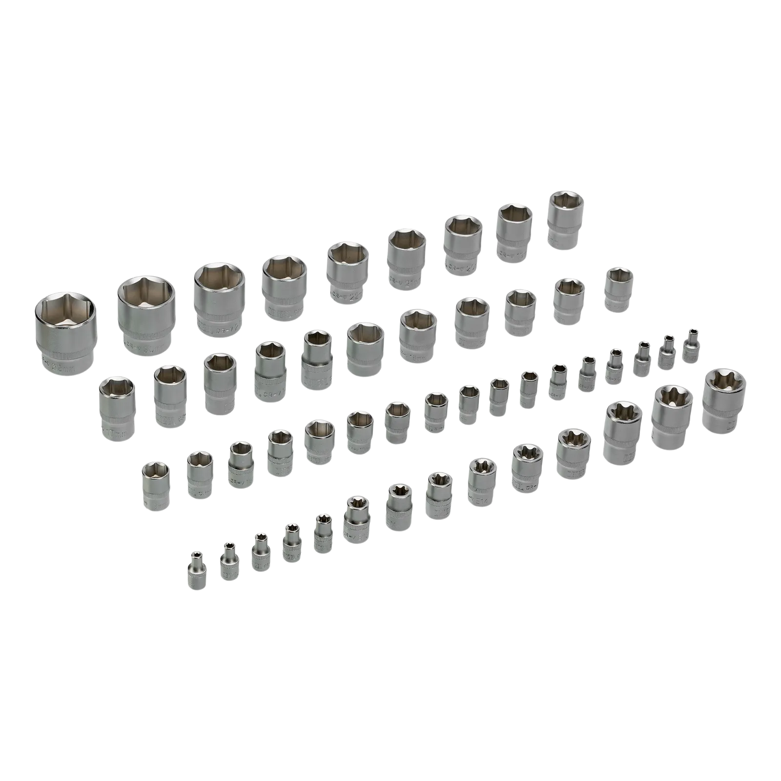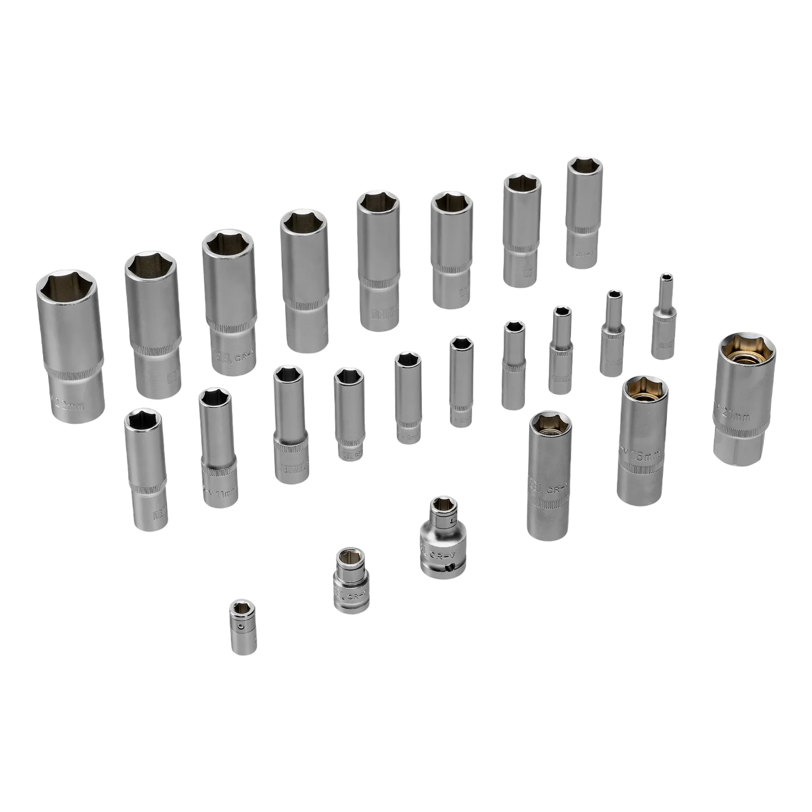 Головки торцевые 1/4" - 5 шт, 3/8" - 6 шт, 1/2" - 3 шт, удлин. 1/4" - 7 шт, 3/8" - 6 шт, 1/2 - 5 шт