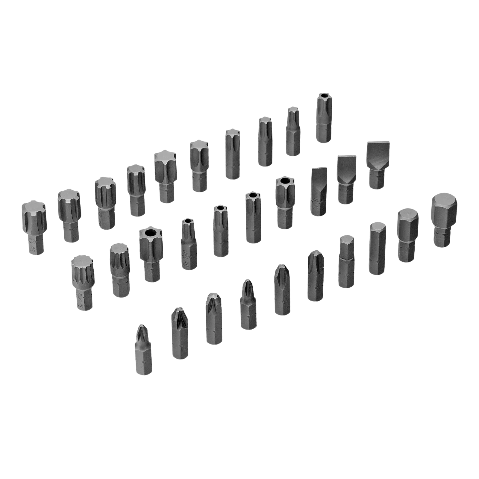 Биты с головками 1/4": SL4, 5, 5.5, 6.5, 7; PH0, 1, 2; PZ0, 1, 2; T8, 10, 15, 20, 25, 30;
