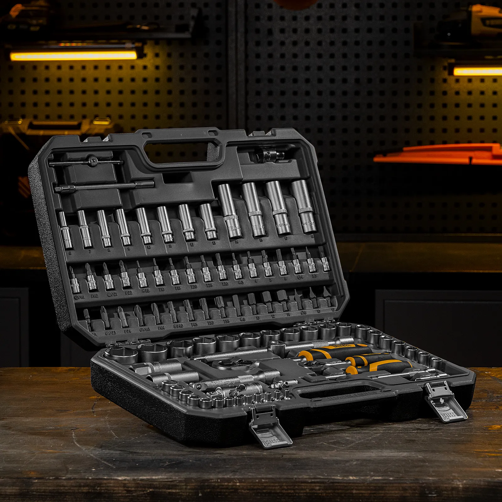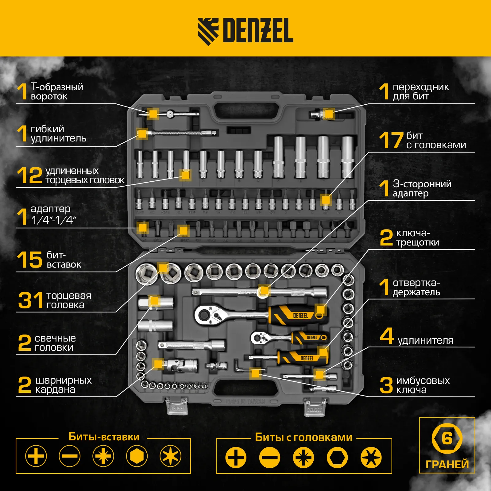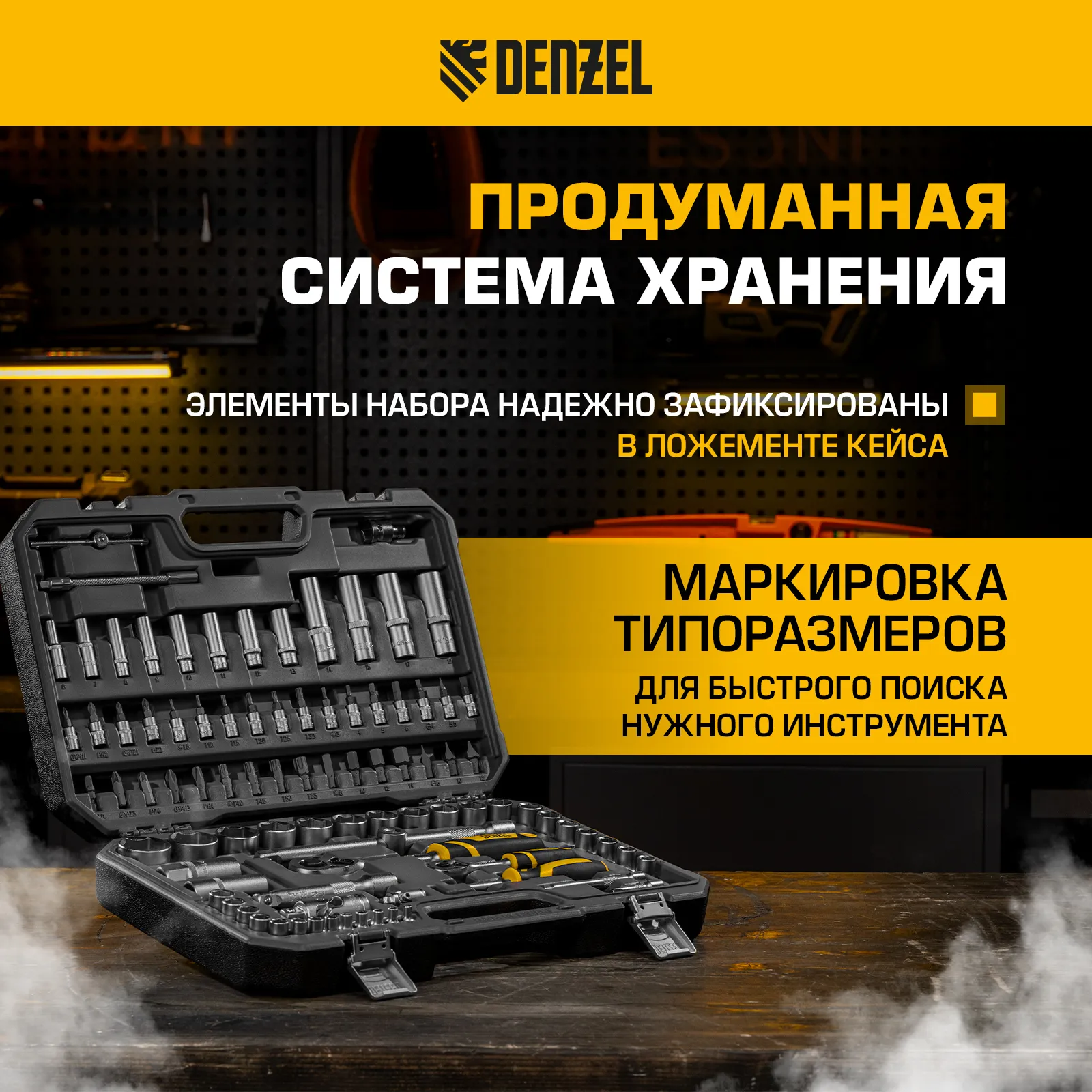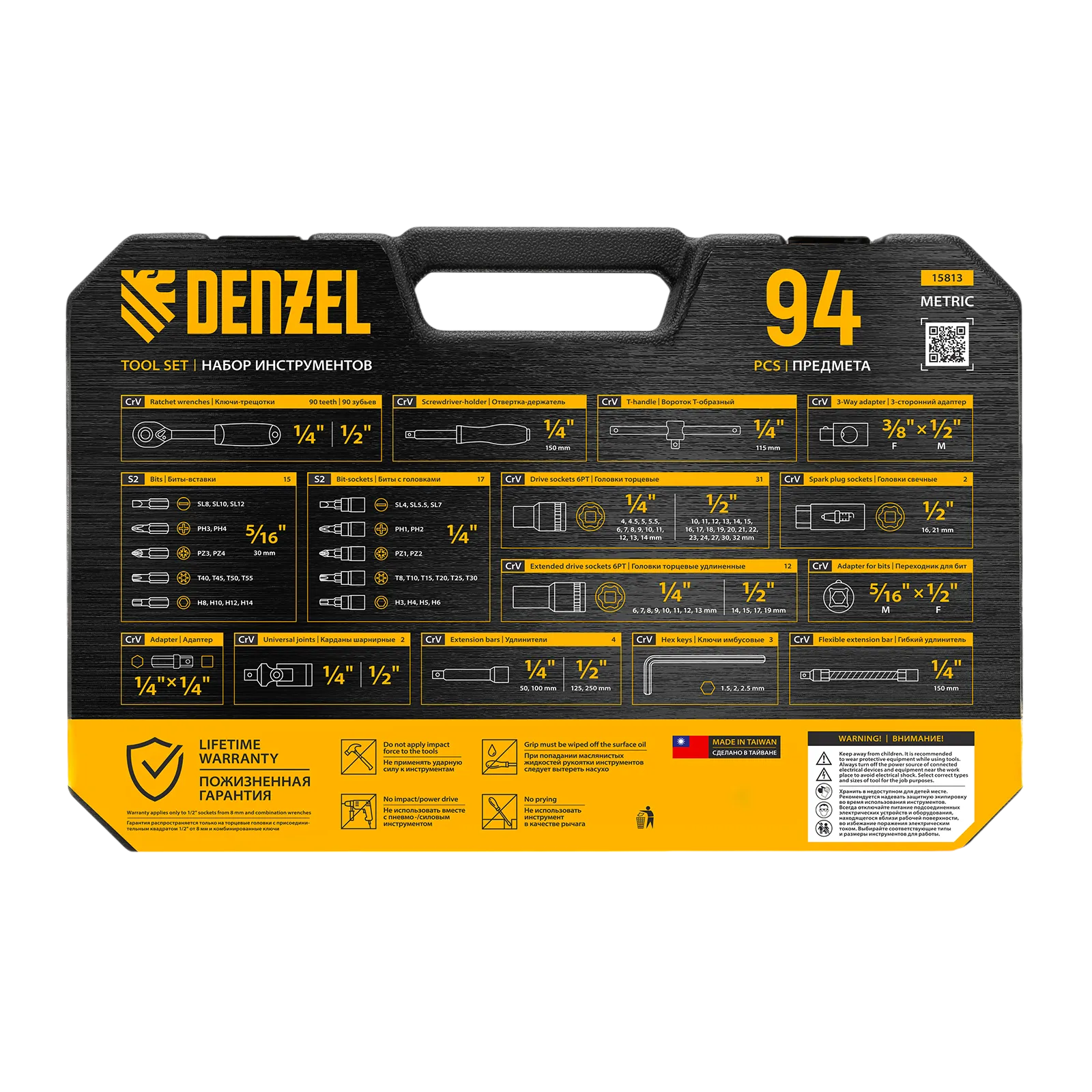Набор инструментов Denzel 15813 состоит из 94 предметов с присоединительными квадратами 1/4″, 1/2″, упакованных во вместительный ударопрочный кейс собственной разработки с антивандальным покрытием. В комплект поставки входят инструменты и оснастка для монтажа и демонтажа резьбовых соединений. Набор предназначен для профессионального использования в автомастерской, будет полезен и для решения бытовых вопросов.