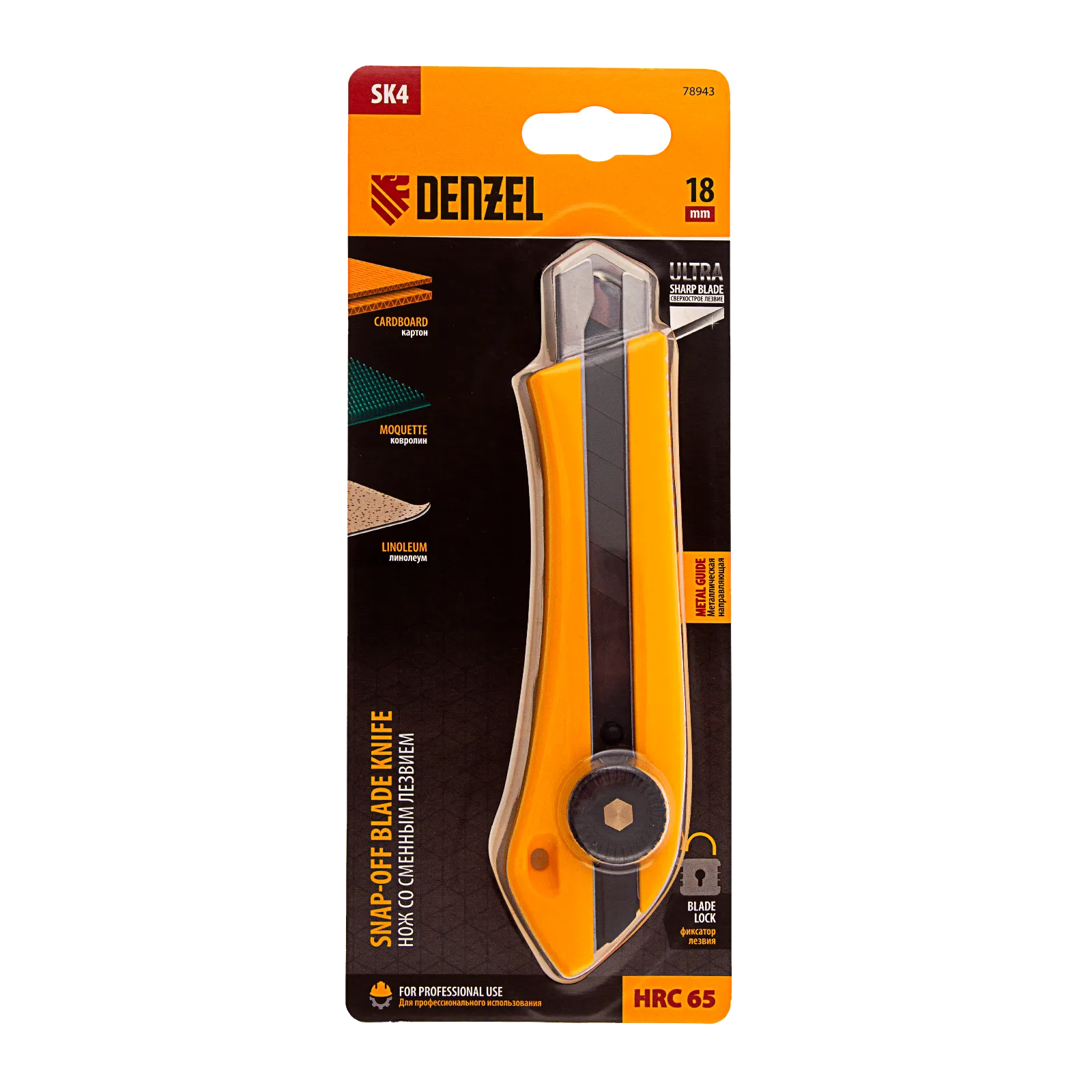 Нож Denzel 78943 со сменным лезвием шириной 18 мм, изготовленным из стали SK4, оснащен винтовым фиксатором и металлической направляющей. Сверхострое выдвижное лезвие легко режет линолеум, ковролин, бумагу, обои, картон и другие листовые материалы. Нож рекомендован для профессионального применения, пригодится также в домашнем хозяйстве.