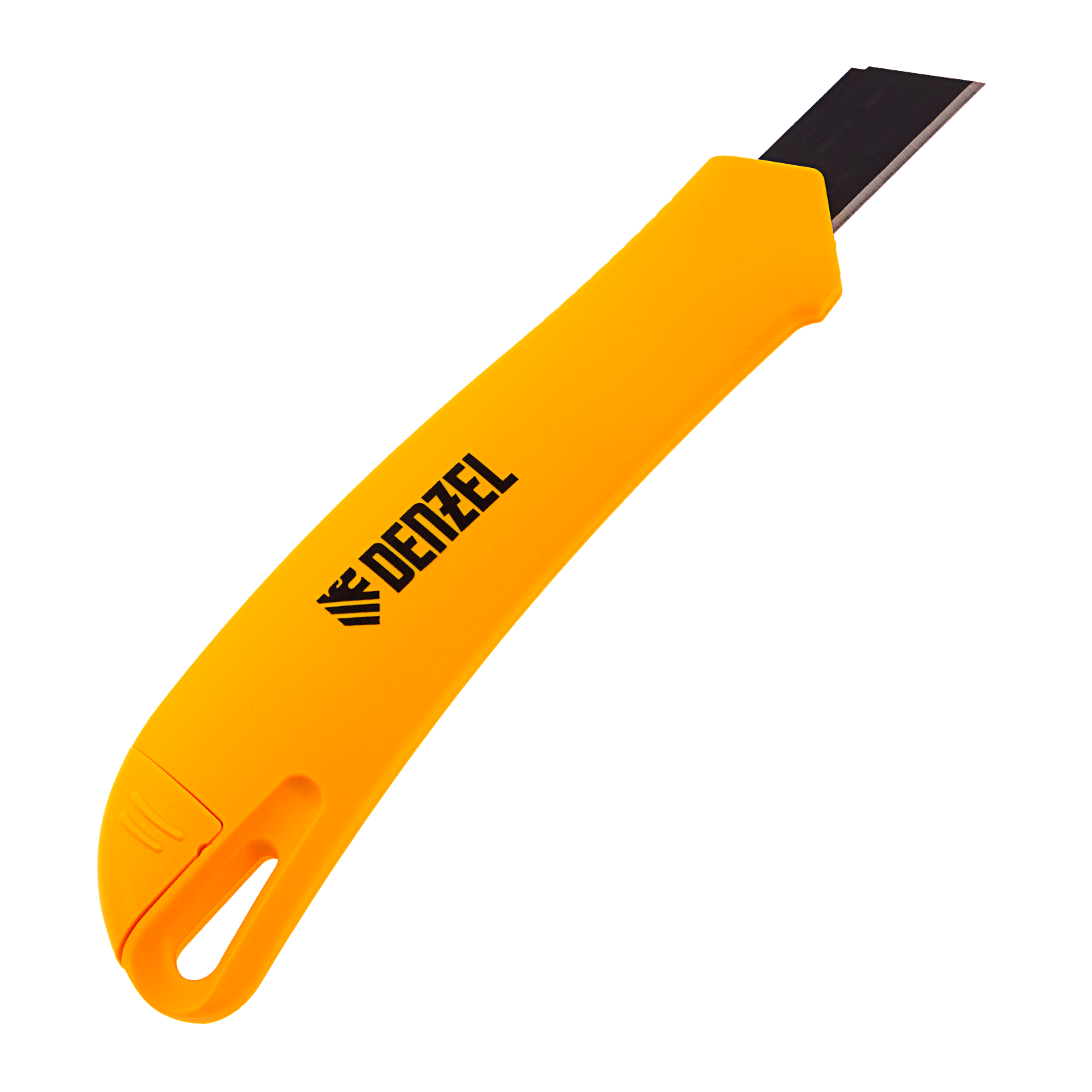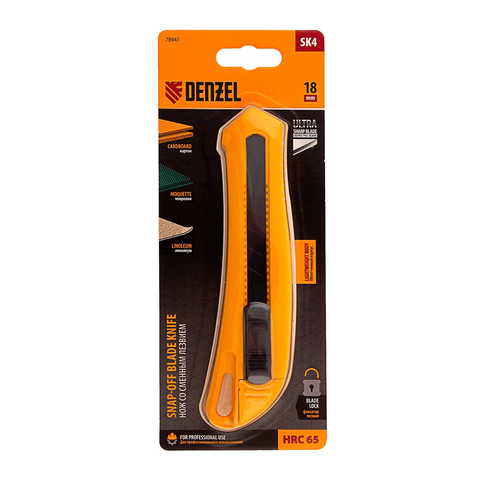Нож Denzel 78941 в облегченном корпусе, со сменным лезвием шириной 18 мм, изготовленным из стали SK4, оснащен нажимным фиксатором. Сверхострое выдвижное лезвие легко режет линолеум, ковролин, бумагу, обои, картон и другие листовые материалы. Нож рекомендован для профессионального применения, пригодится также в домашнем хозяйстве.