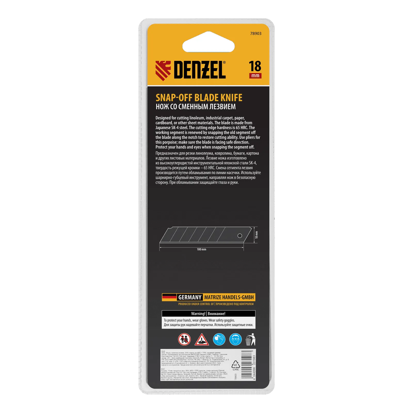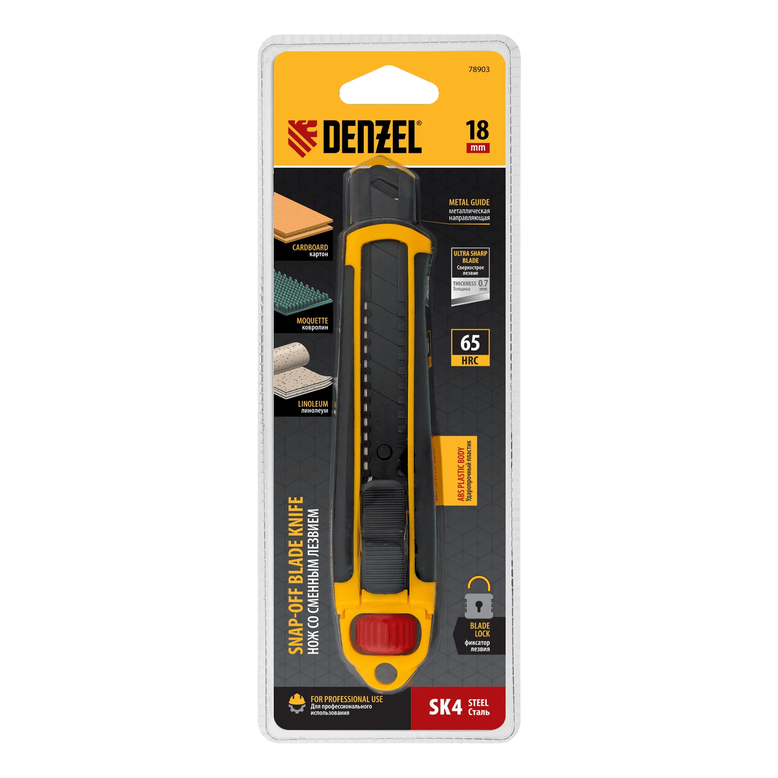 Нож Denzel 78903 выполнен в корпусе из ABS-пластика со вставками из термопластичной резины TPR, оснащен сменным лезвием шириной 18 мм, изготовленным из стали SK4 по технологии UltraSharp, и торцевым зажимом. Сверхострое выдвижное лезвие легко режет линолеум, ковролин, бумагу, обои, картон и другие листовые материалы. Нож будет полезен для проведения профессиональных ремонтных и отделочных работ, пригодится также в домашнем хозяйстве.