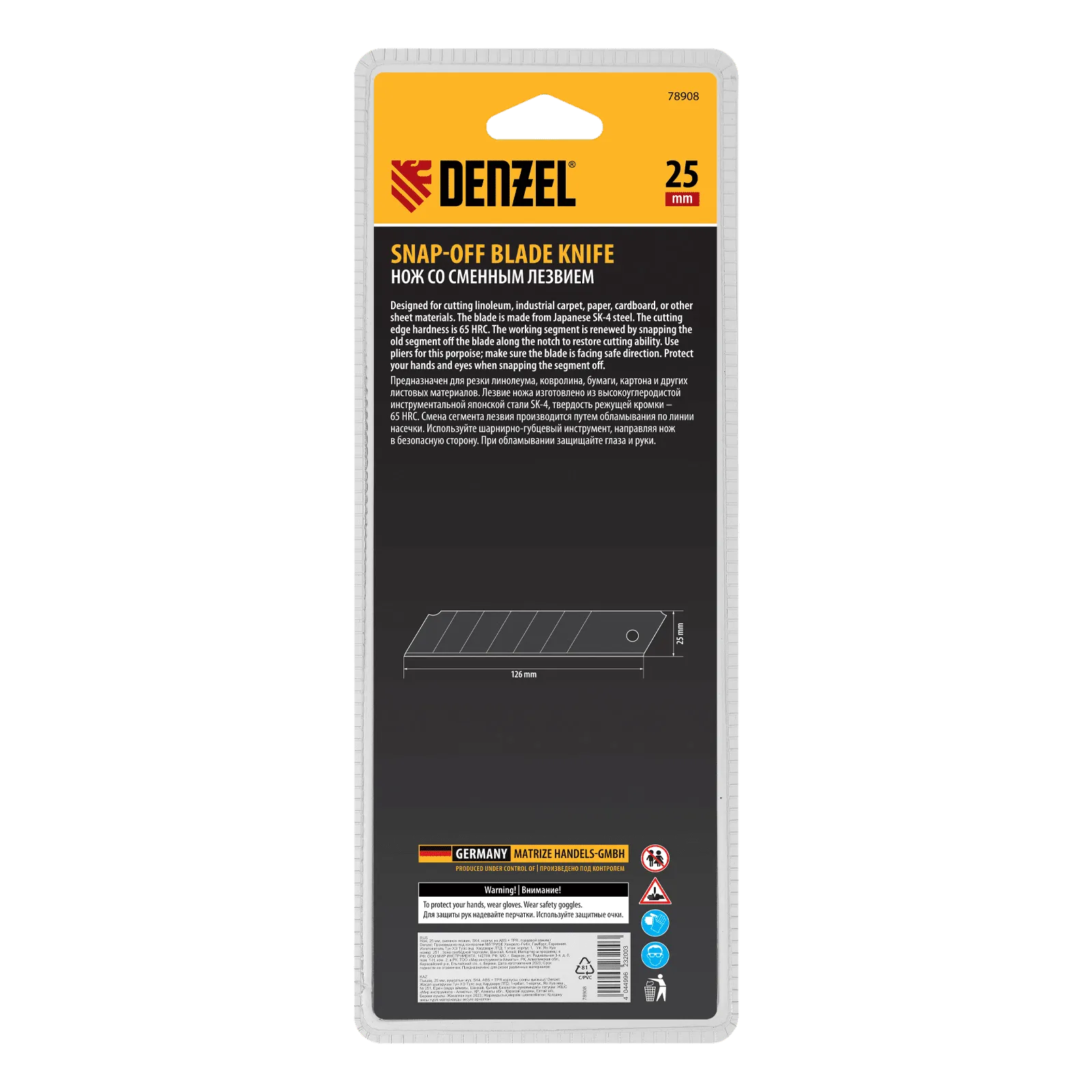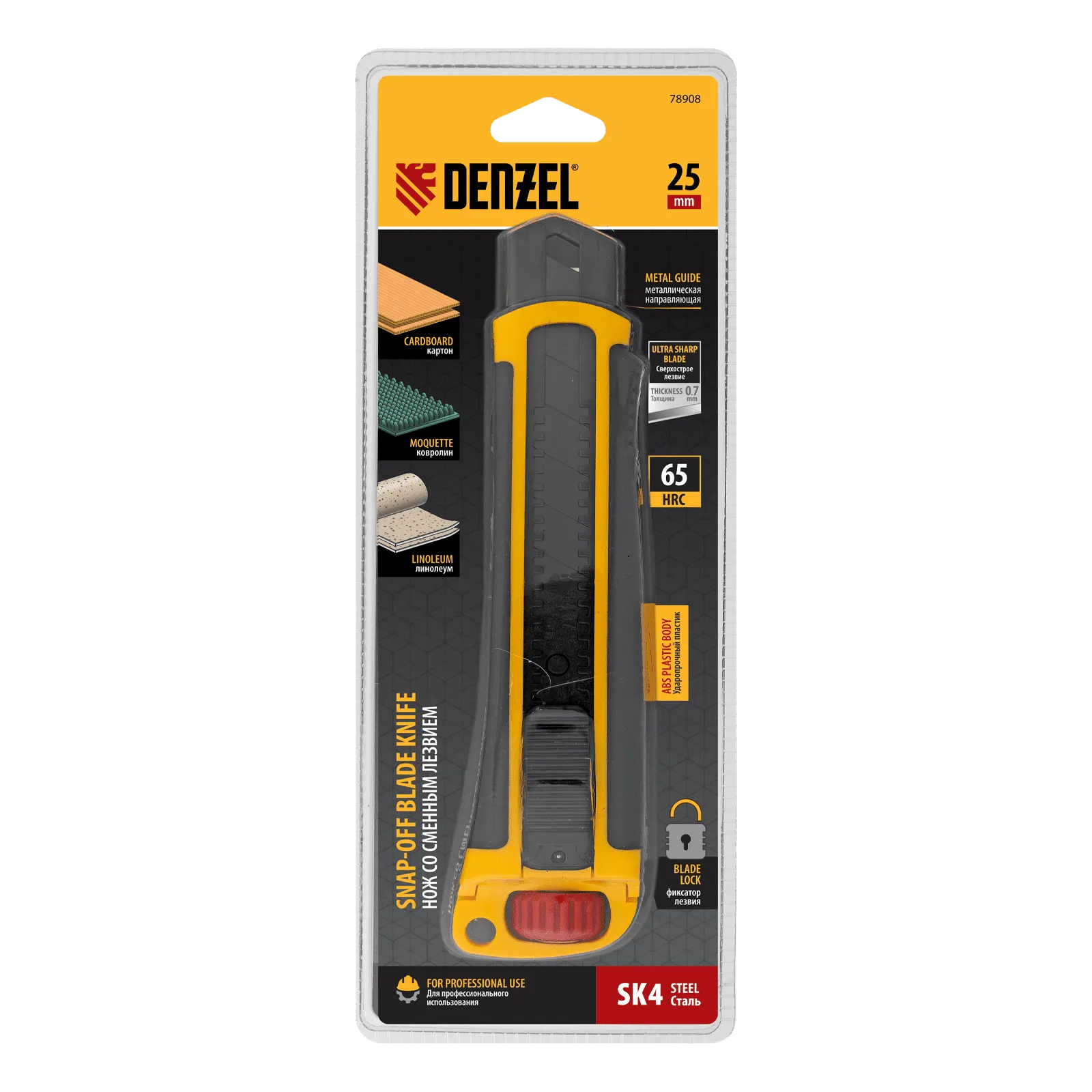 Нож Denzel 78908 выполнен в корпусе из ABS-пластика со вставками из термопластичной резины TPR, оснащен сменным лезвием шириной 25 мм, изготовленным из стали SK4 по технологии UltraSharp, и торцевым зажимом. Сверхострое выдвижное лезвие легко режет линолеум, ковролин, бумагу, обои, картон и другие листовые материалы. Нож будет полезен для проведения профессиональных ремонтных и отделочных работ, пригодится также в домашнем хозяйстве.