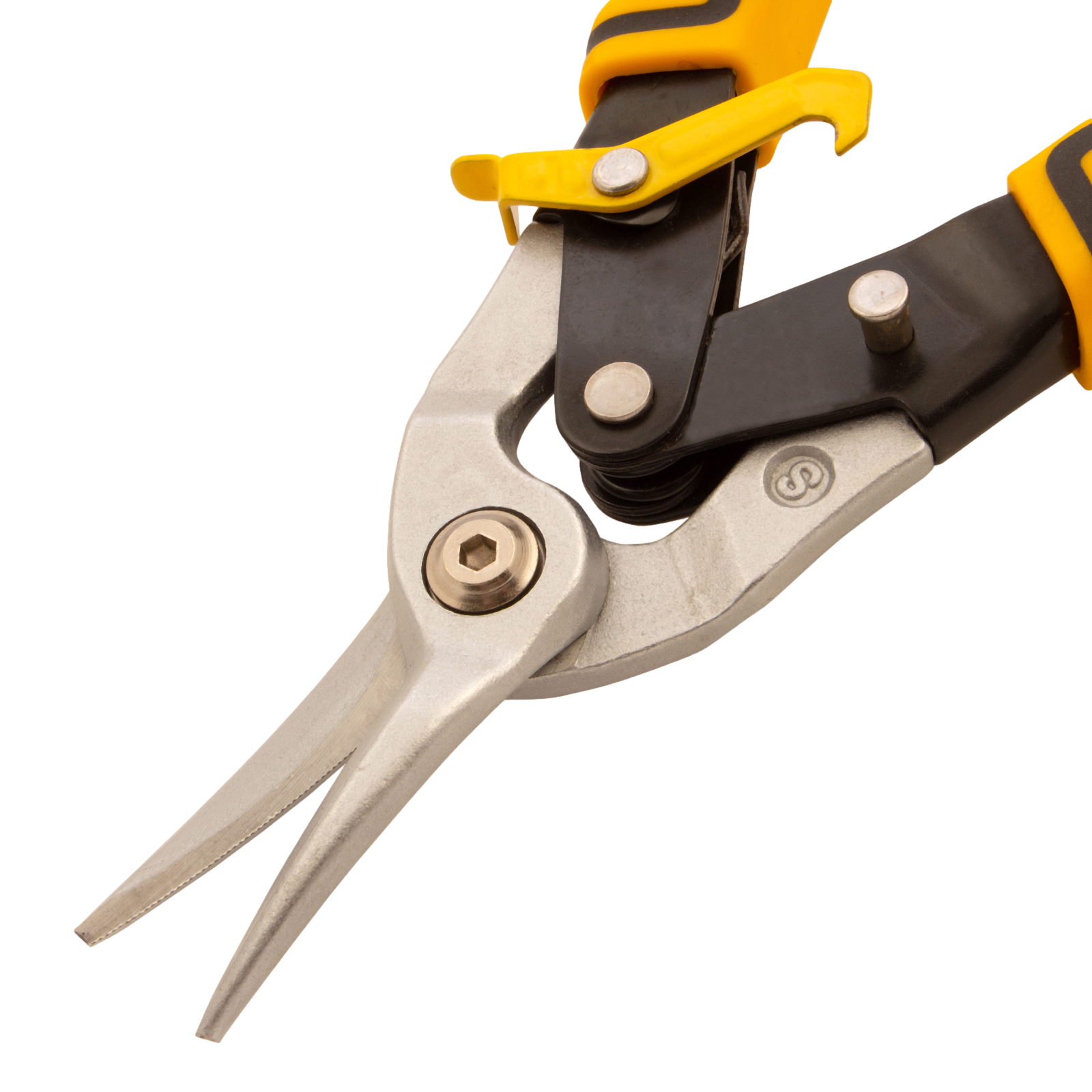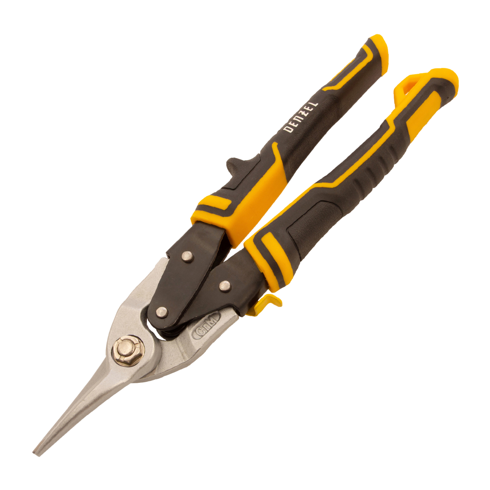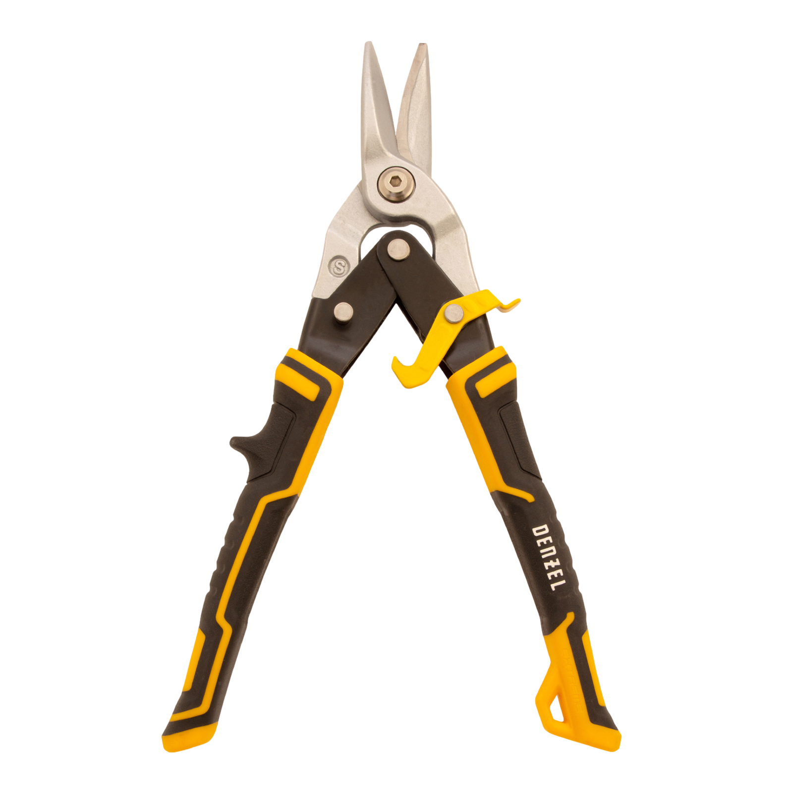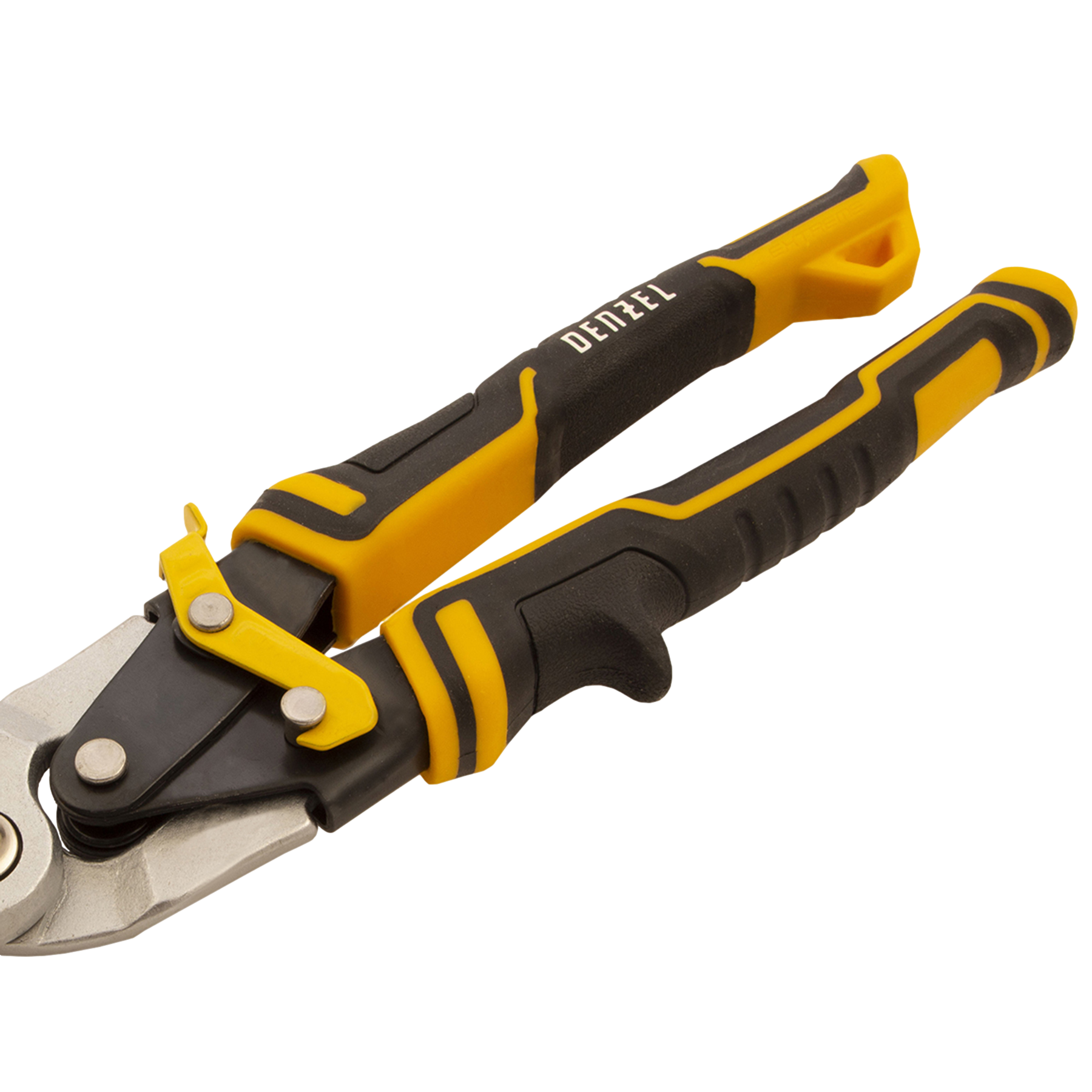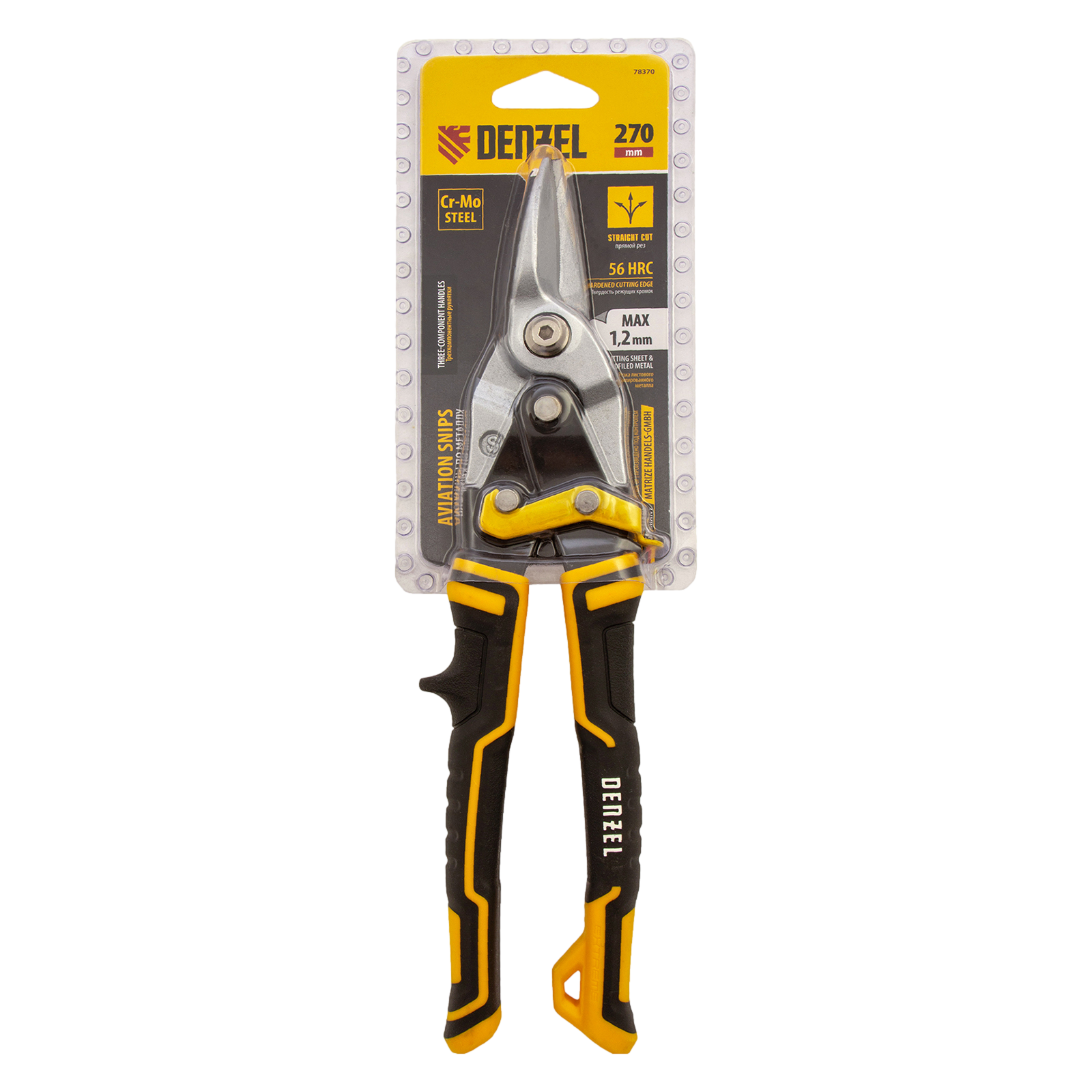 Ножницы по металлу Denzel 78370 общей длиной 270 мм, из стали-CrMo, с трехкомпонентными рукоятками, предназначены для прямого реза листовых металлических заготовок и металлопрофиля толщиной до 1,2 мм. Инструмент с усиленной конструкцией осевого шарнира рассчитан на профессиональное использование. Ножницы используются для проведения строительных, кровельных и слесарных работ.