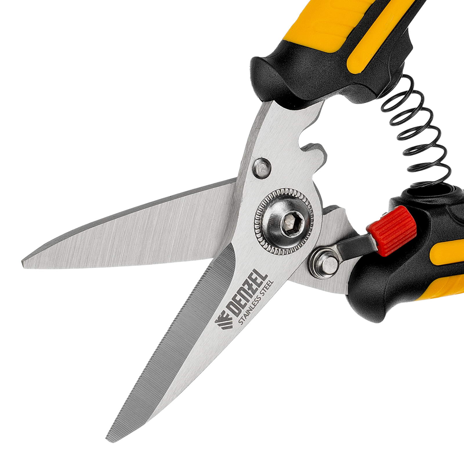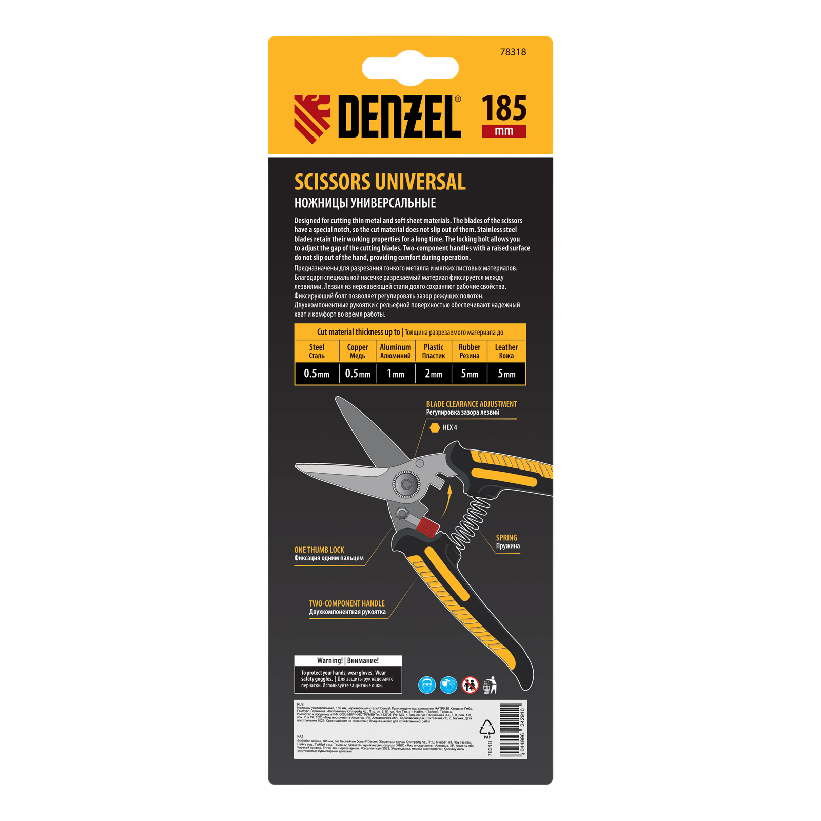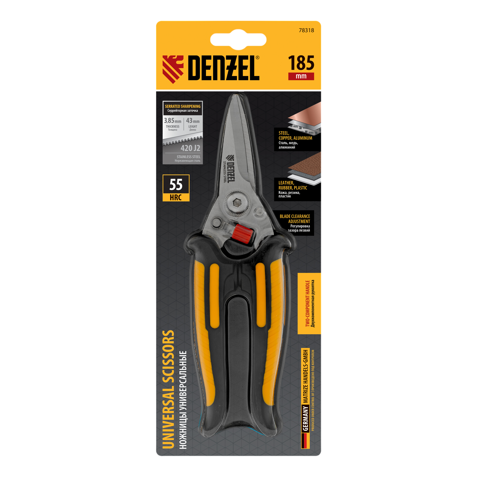 Универсальные ножницы Denzel 78318 длиной 185 мм — инструмент для разрезания тонкого металла и мягких материалов. Одно из лезвий имеет серрейторную (зубчатую) заточку, поэтому разрезаемый материал не выскальзывает из инструмента. Ножницы подходят для выполнения разнообразных работ: на даче помогут разрезать стальную сетку с небольшим диаметром проволоки, в походе — ветки или рыбу, во время мелкого ремонта или занятий творчеством — провода, кожу, резину, картон, бумажную лозу и другие материалы.