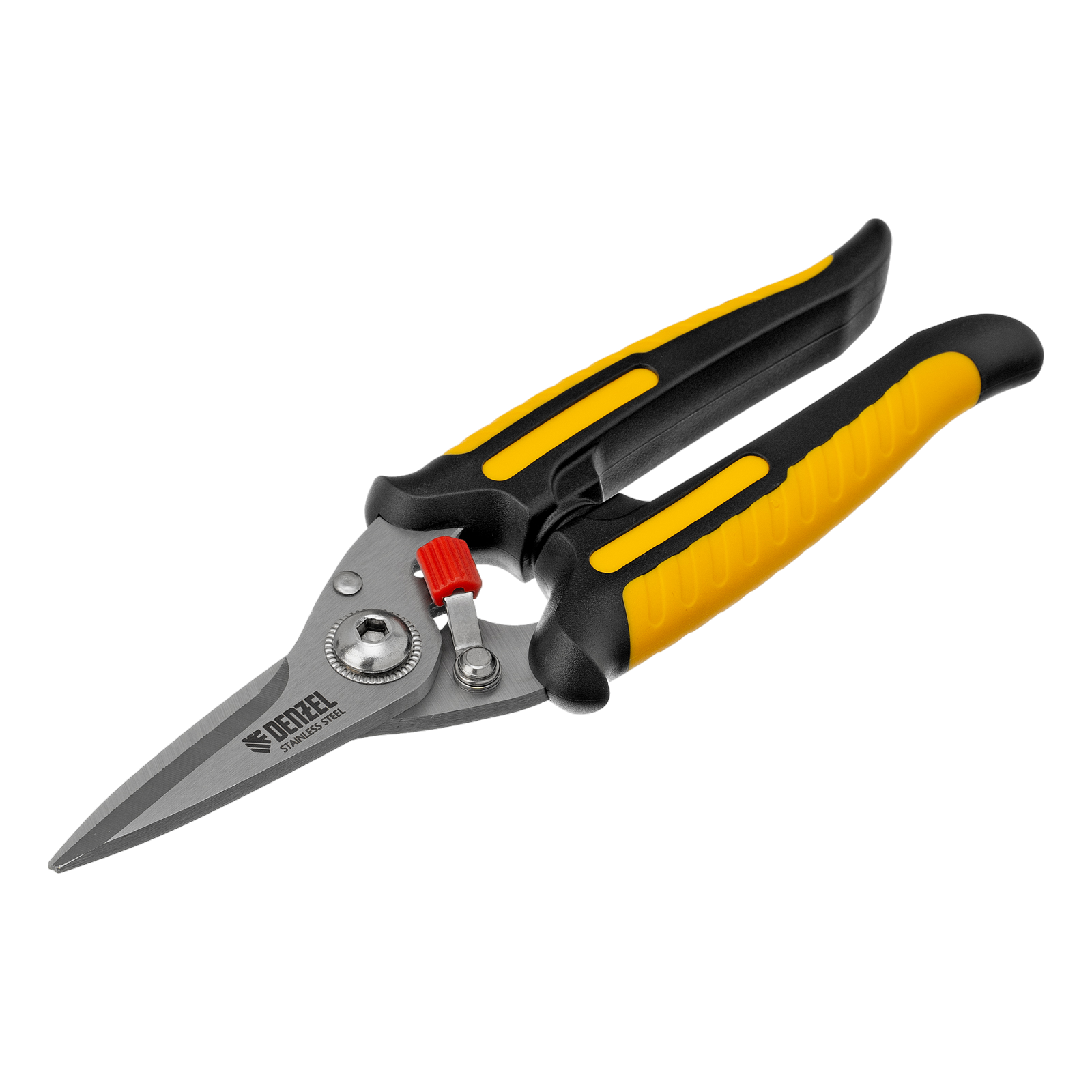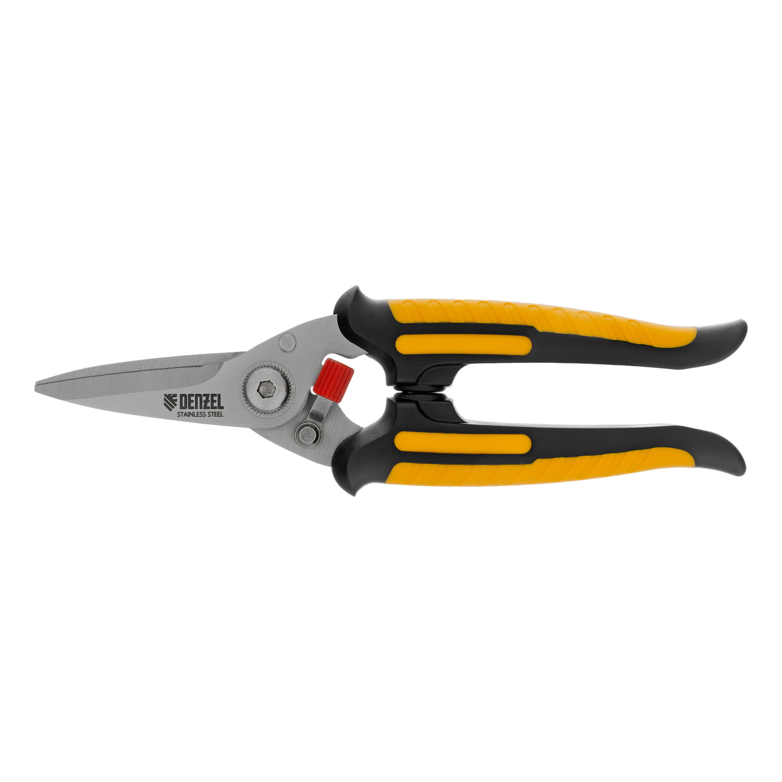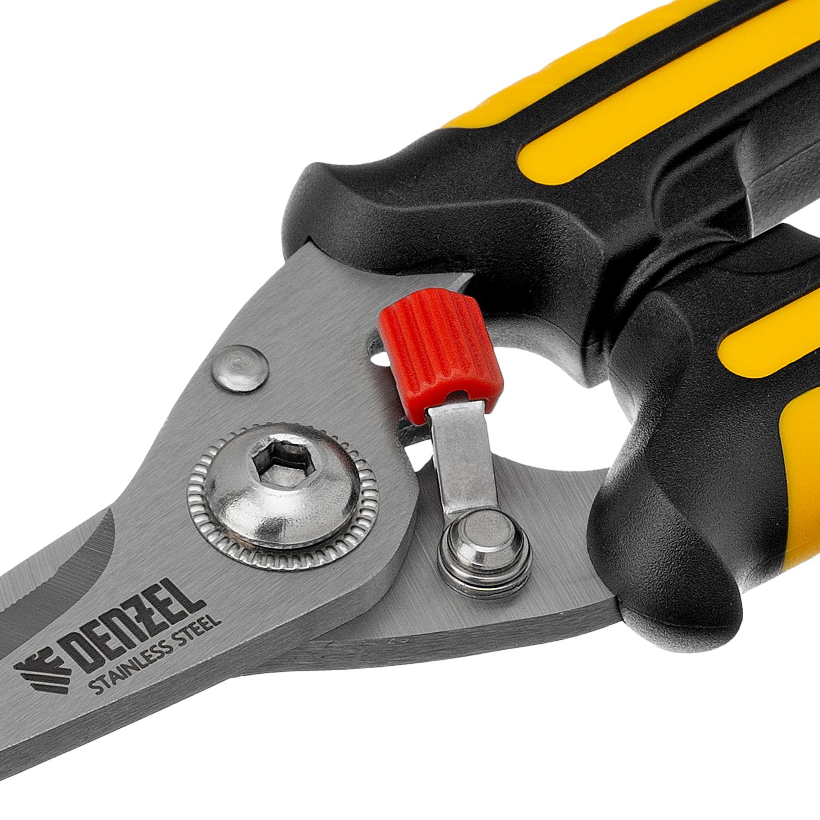 Универсальные ножницы Denzel 78318 длиной 185 мм — инструмент для разрезания тонкого металла и мягких материалов. Одно из лезвий имеет серрейторную (зубчатую) заточку, поэтому разрезаемый материал не выскальзывает из инструмента. Ножницы подходят для выполнения разнообразных работ: на даче помогут разрезать стальную сетку с небольшим диаметром проволоки, в походе — ветки или рыбу, во время мелкого ремонта или занятий творчеством — провода, кожу, резину, картон, бумажную лозу и другие материалы.