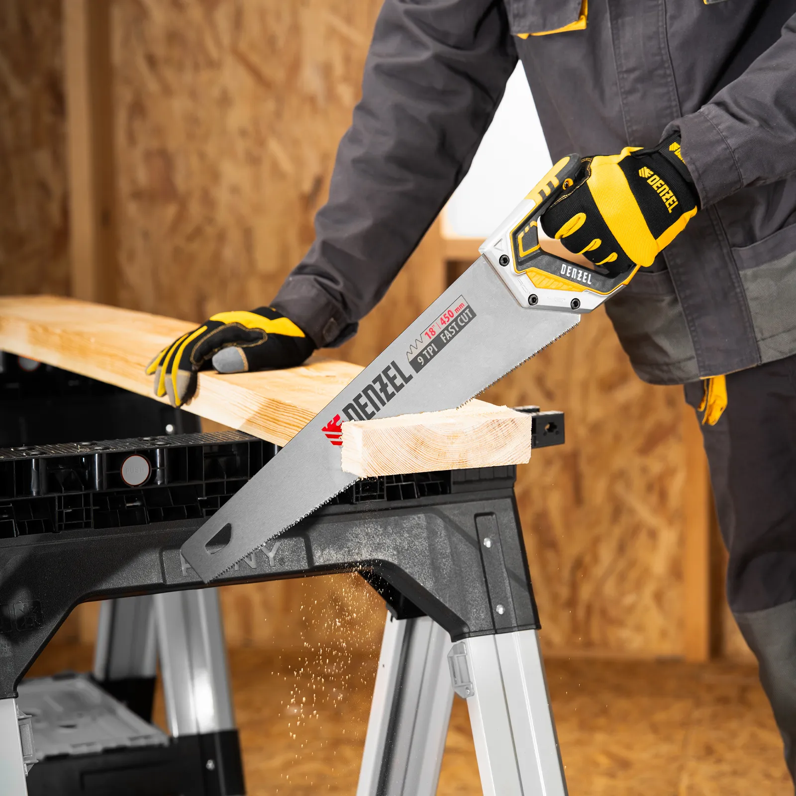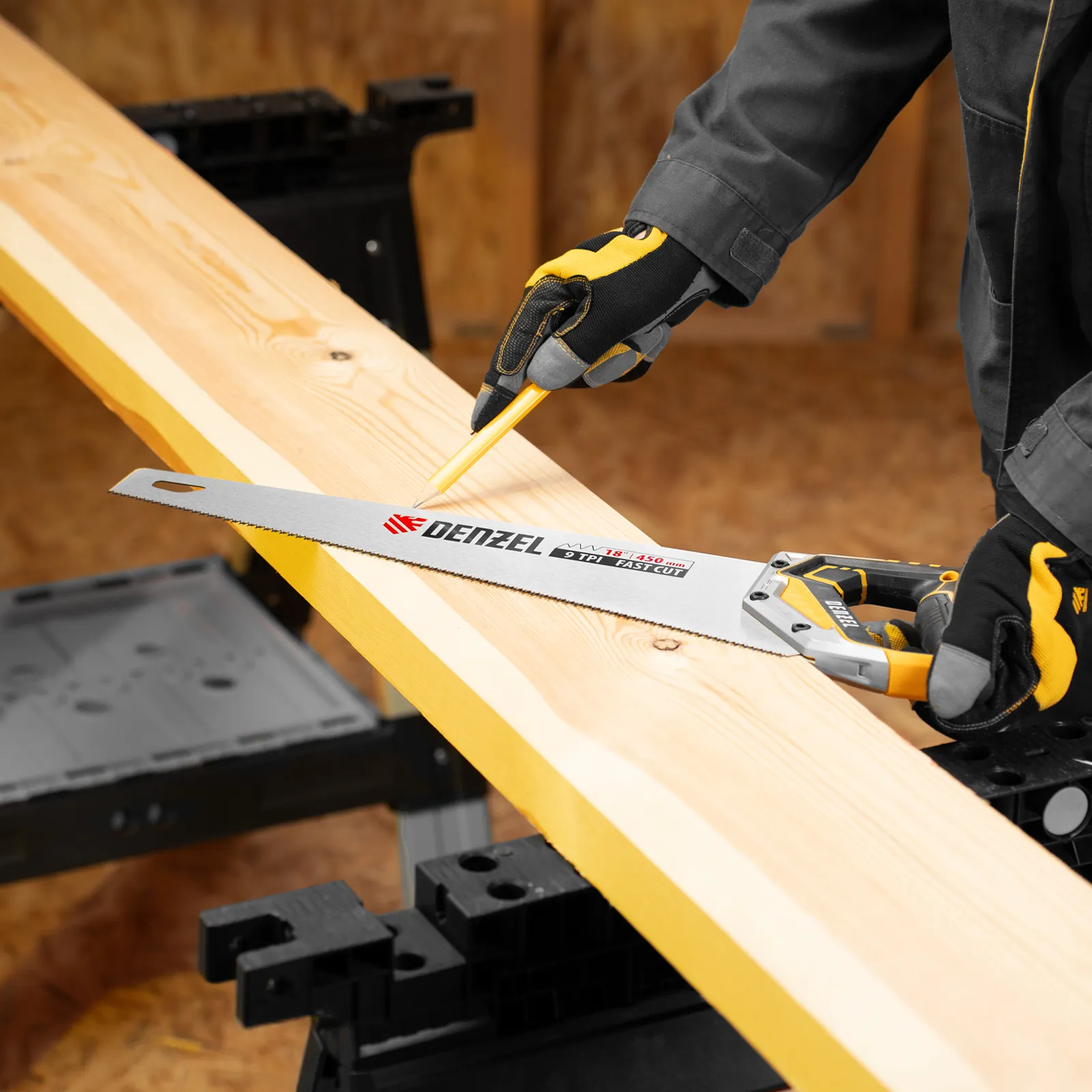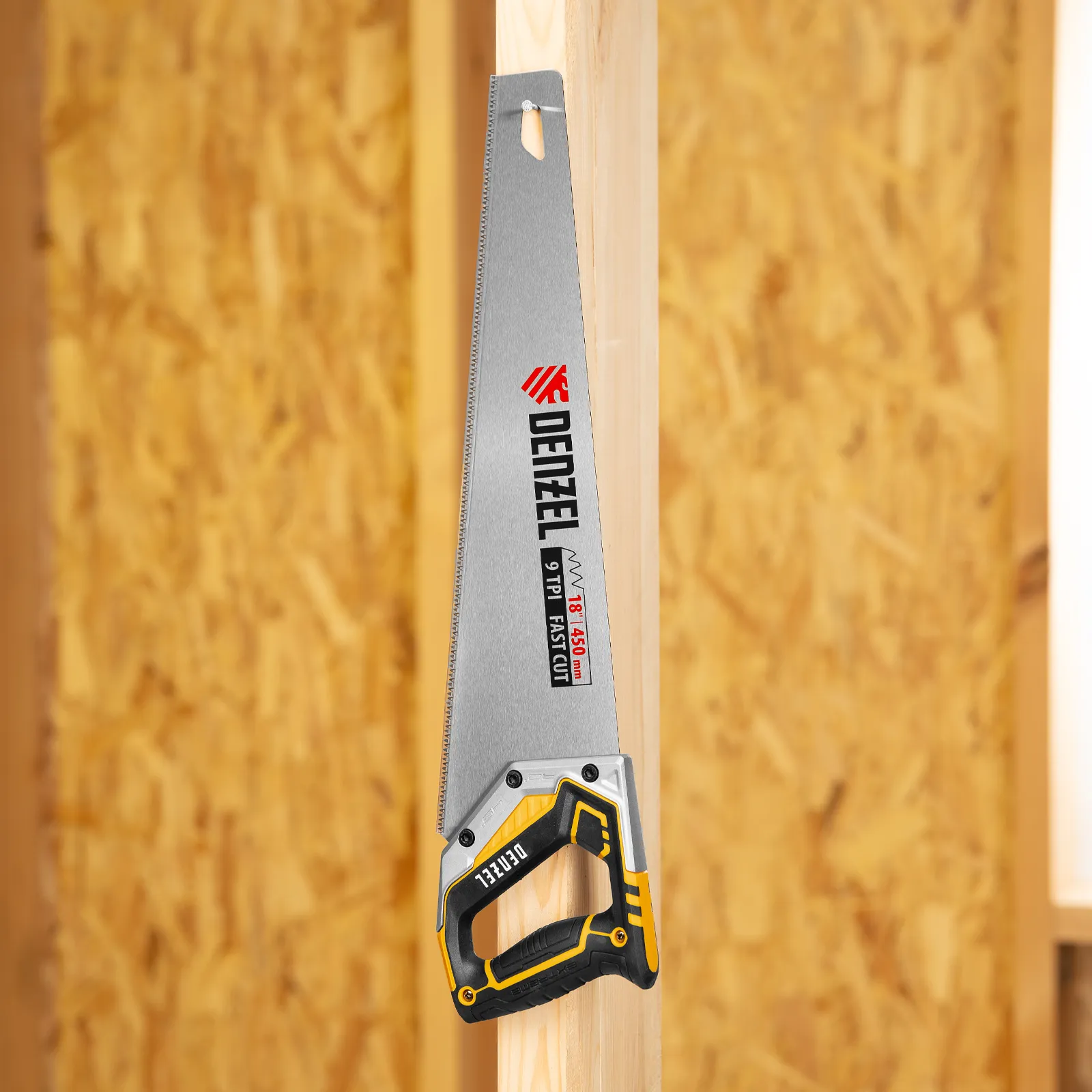 Ножовка по дереву Denzel 24140 длиной 450 мм, с зубьями с шагом 9 TPI и 3D-заточкой, с металлопластиковой рукояткой, предназначена для продольной и поперечной распиловки заготовок из древесины, ДСП, ДВП, МДФ, ламината, а также из ПВХ (труб, панелей, коробов). Подходит для спиливания молодых веток. Зубья с шагом 9 TPI позволяют выполнять быстрый рез. Ножовка используется для проведения столярных работ в мастерской и на дачном участке.