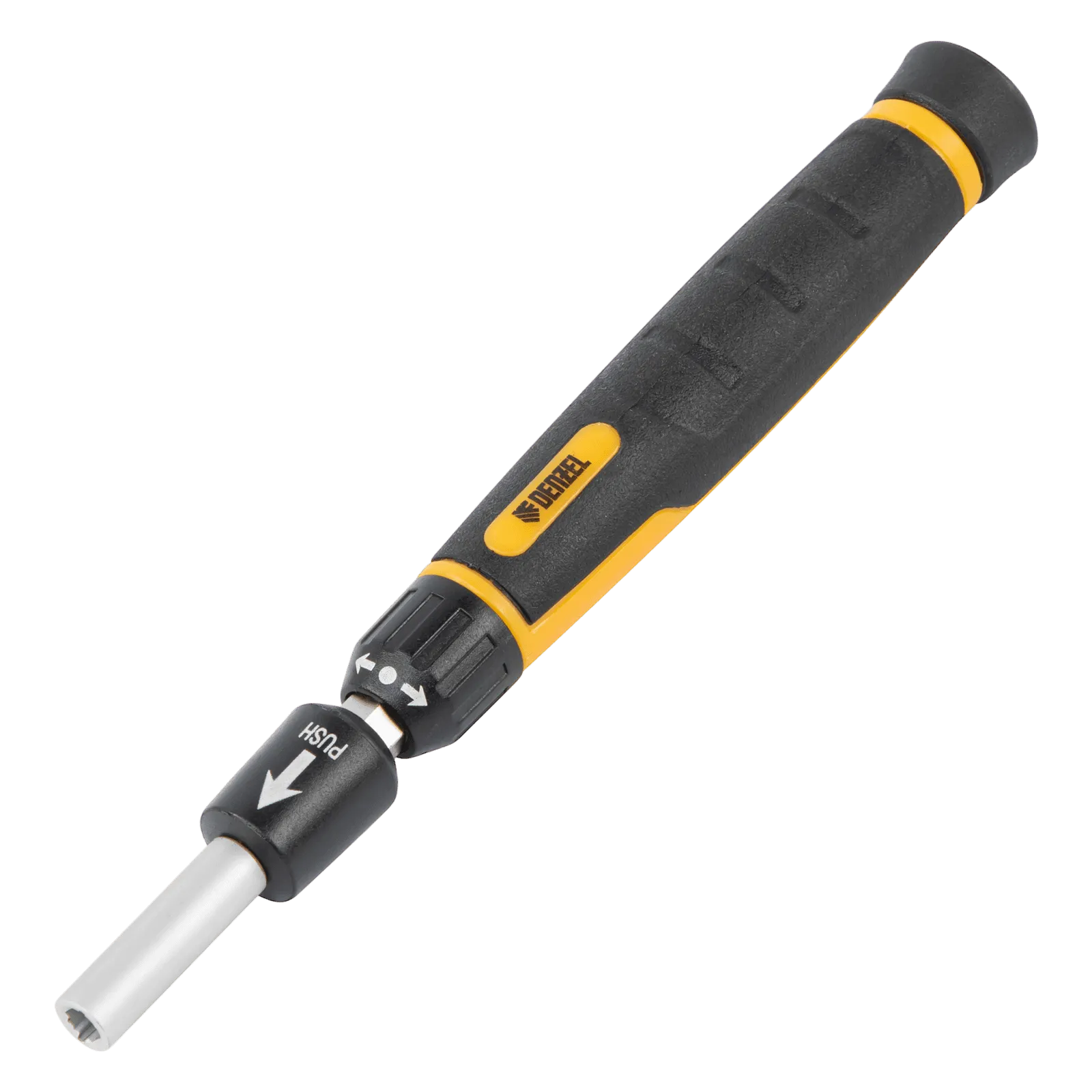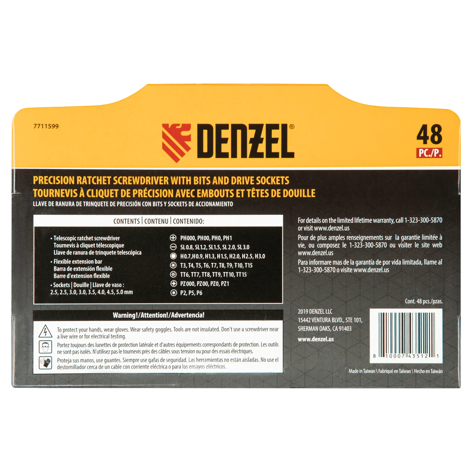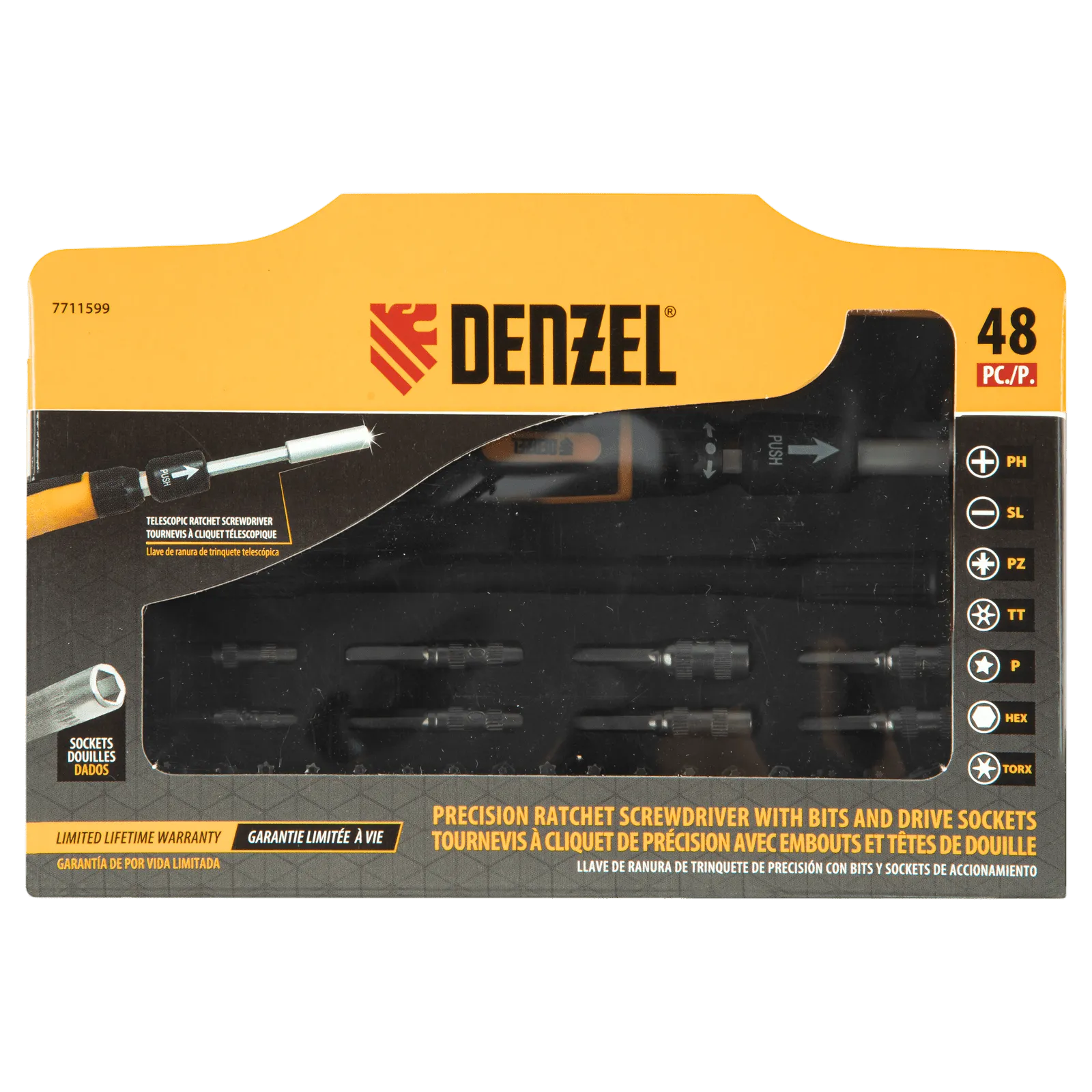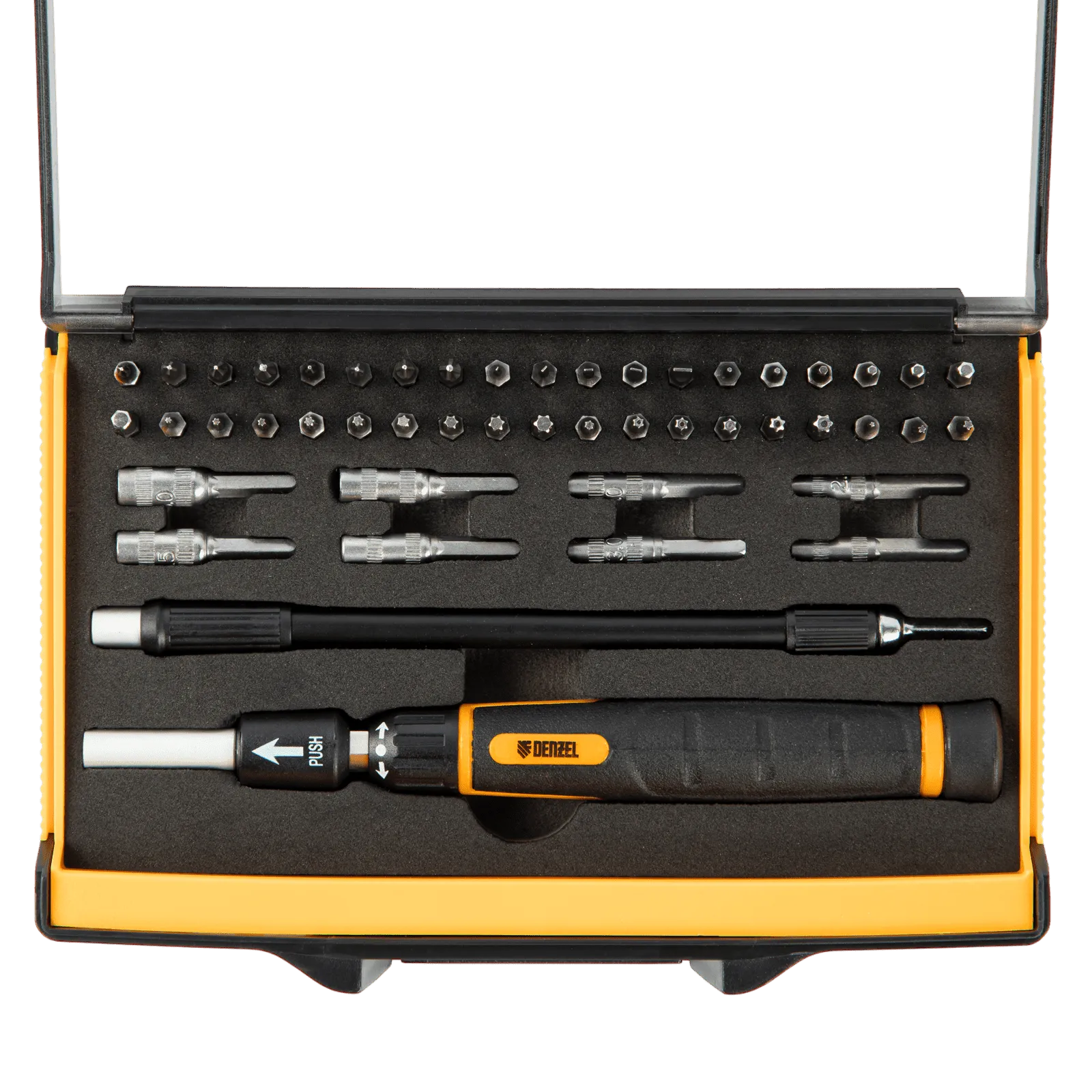 Отвертка с набором бит и торцевых головок Denzel 7711599, с гибким приводом, входит в набор из 48 предметов из стали CrMo и предназначена для выполнения точных работ. С ее помощью можно отремонтировать очки, игрушки, портативную и бытовую технику и т.д. Выдвижной стержень и гибкий удлинитель позволяют работать с мелкими деталями в углублениях и труднодоступных местах.