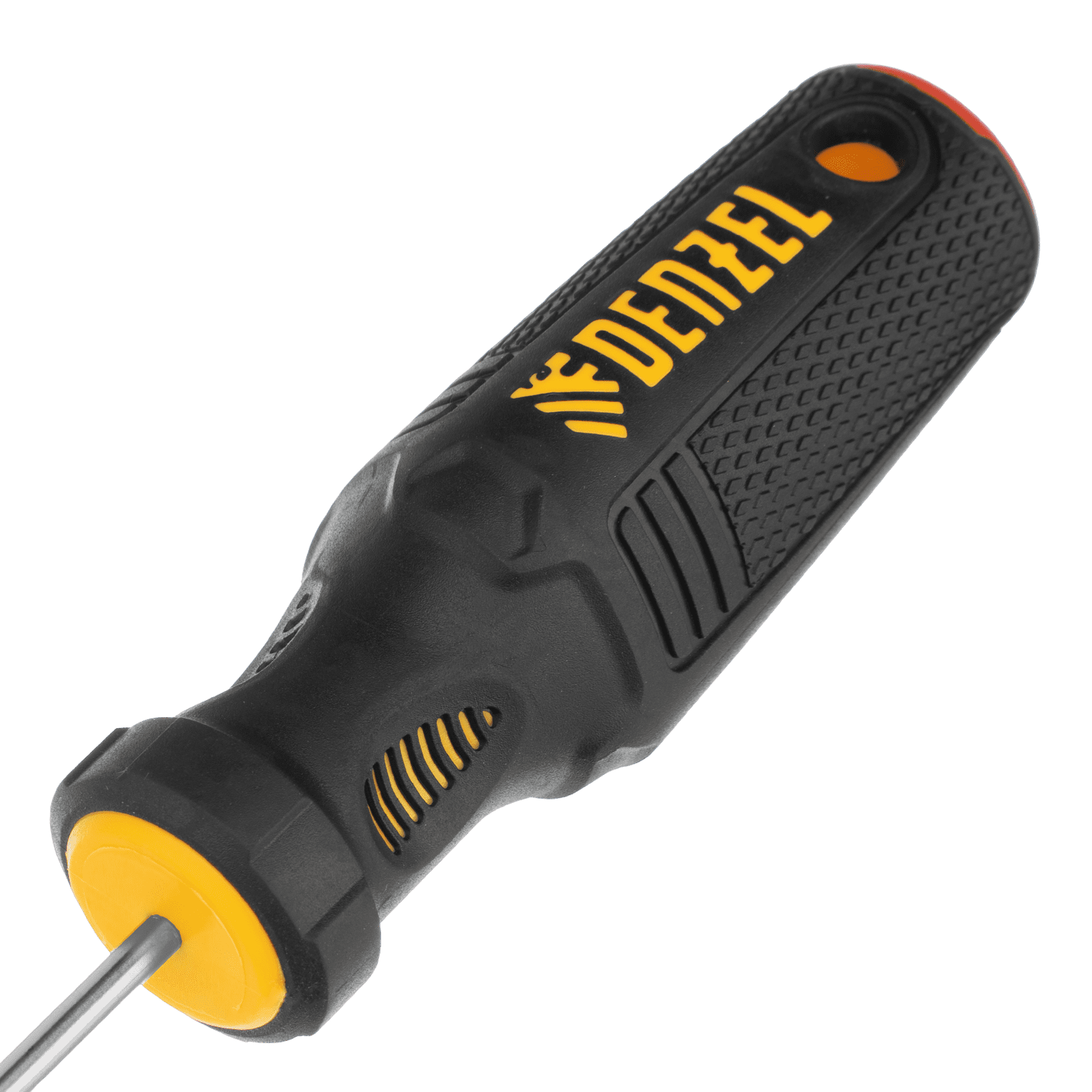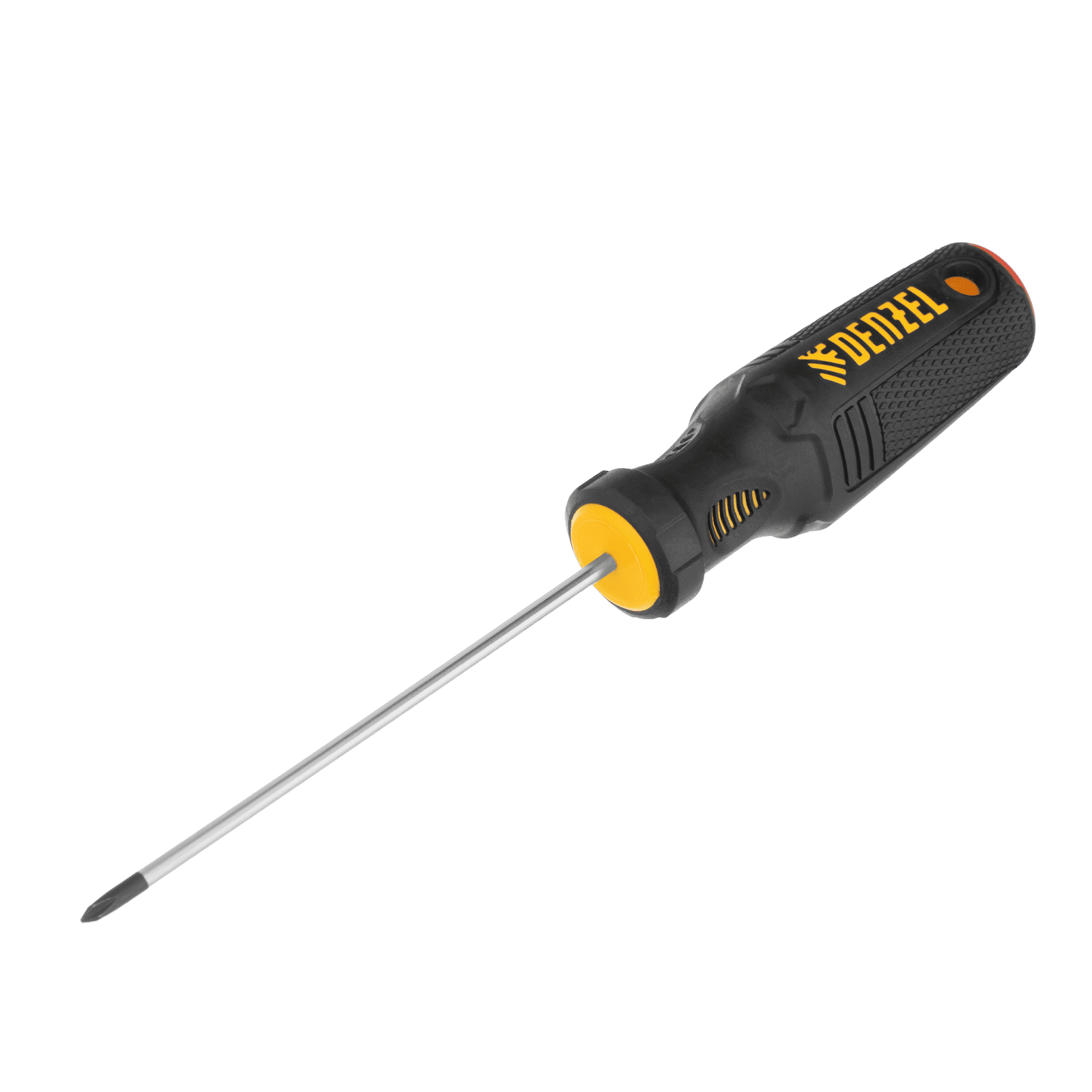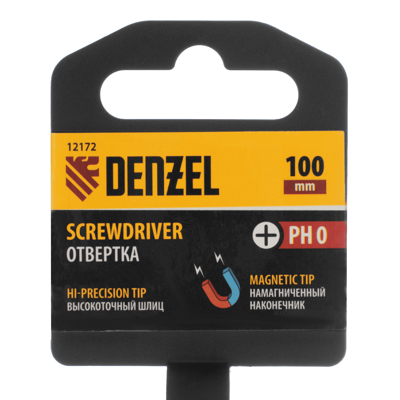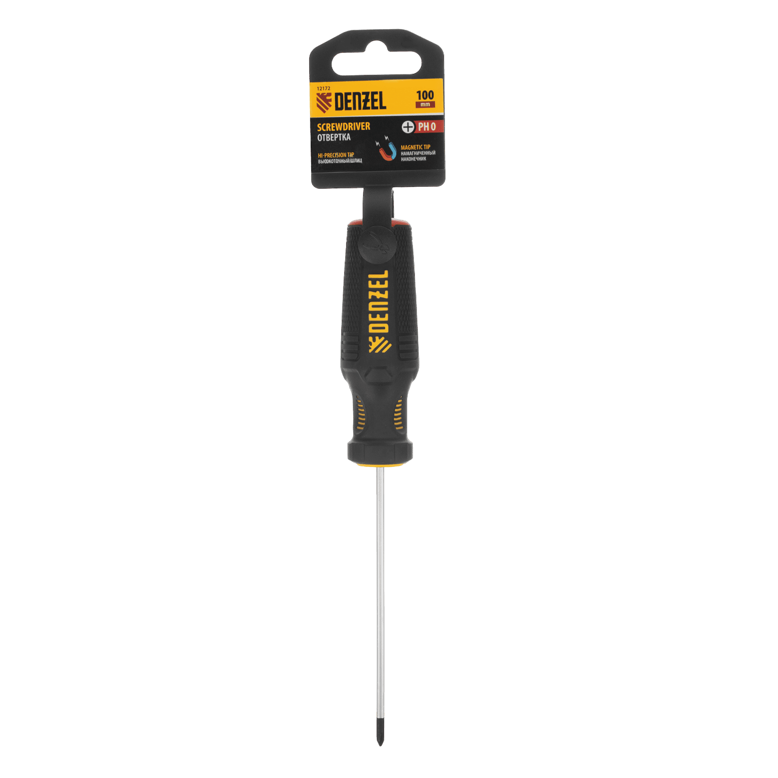 Отвертка PH0 х 100 мм Denzel 12172 из стали CrV, с трехкомпонентной рукояткой, предназначена для закручивания и откручивания резьбовых крепежей типа Philips. Шлиц намагничен, что избавляет от необходимости придерживать винт или саморез рукой. Отвертка рекомендована для профессионального использования.