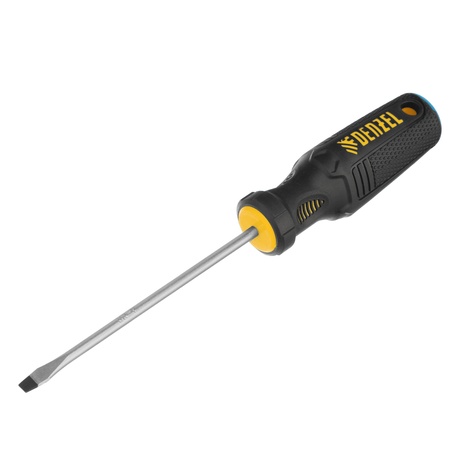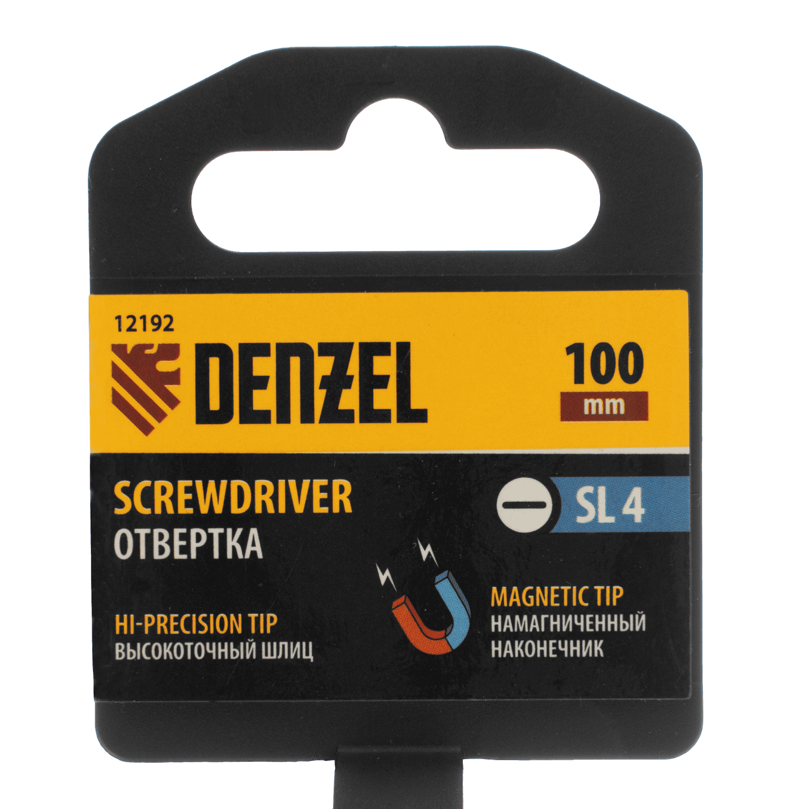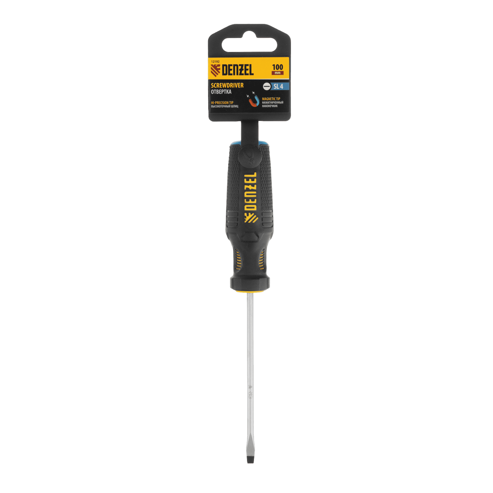 Отвертка SL4 х 100 мм Denzel 12192 из стали CrV, с трехкомпонентной рукояткой, используется для монтажа и демонтажа винтов и саморезов с прямым шлицем Slotted. Намагниченный шлиц крепко фиксируется в головке крепежа. Отвертка выдерживает интенсивное применение и предназначена для выполнения профессиональных ремонтных и монтажных работ.