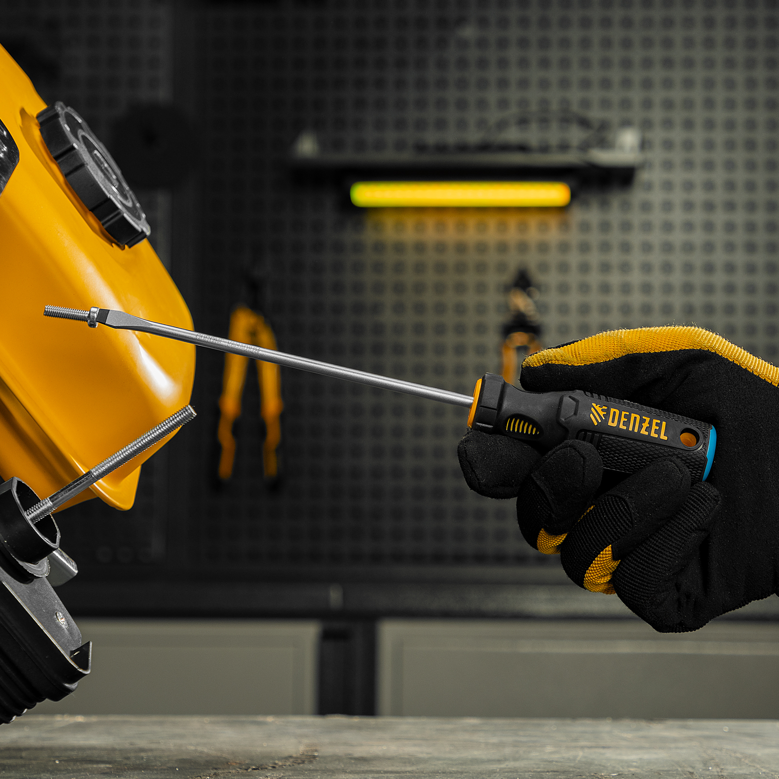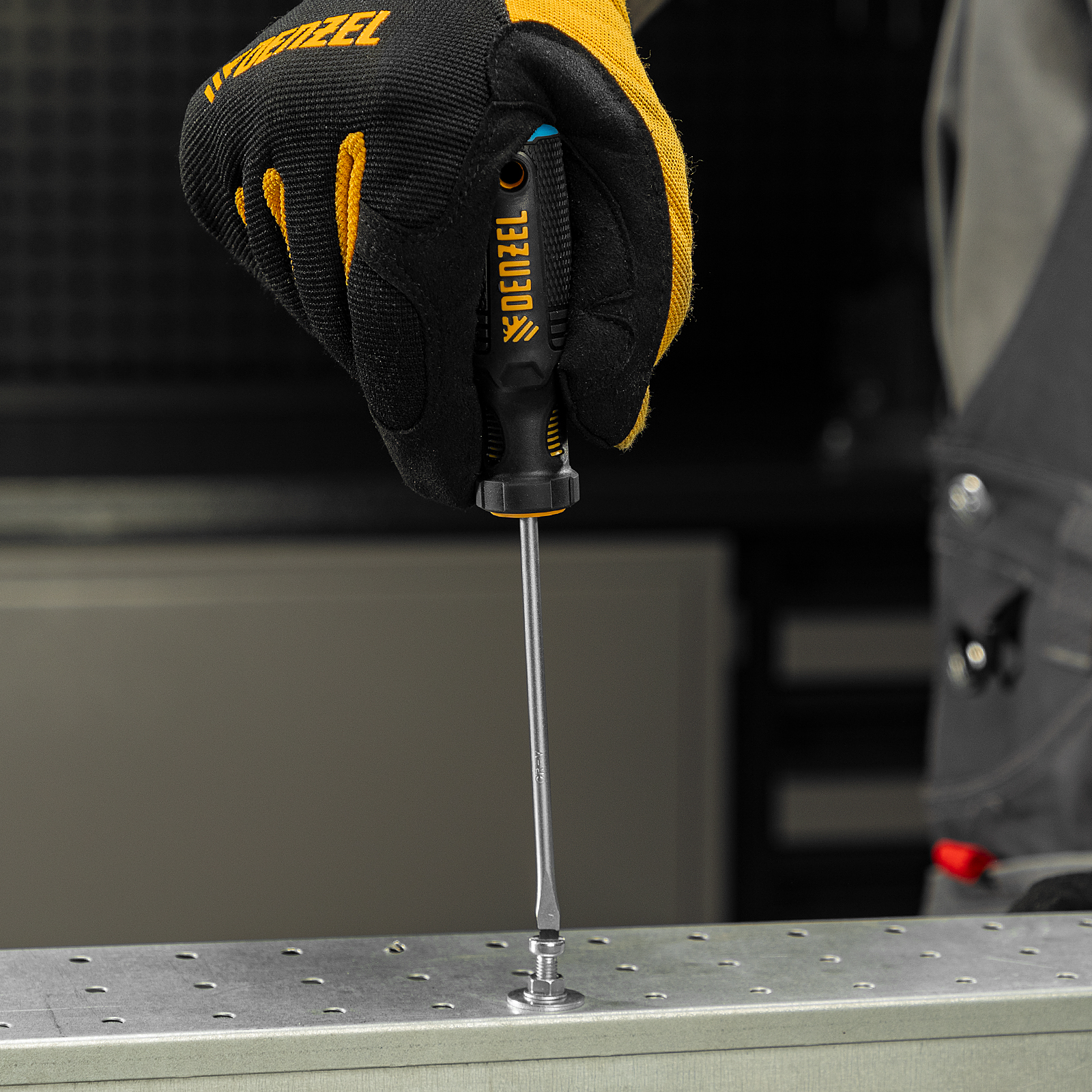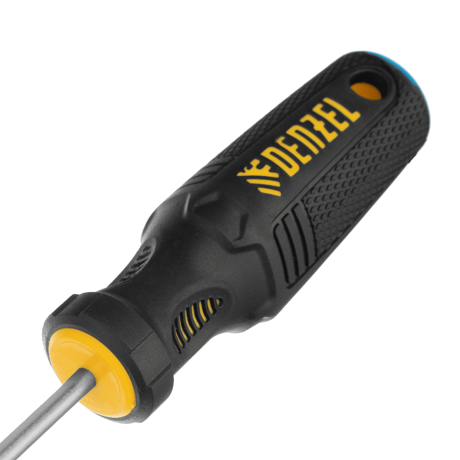 Отвертка SL4 х 100 мм Denzel 12192 из стали CrV, с трехкомпонентной рукояткой, используется для монтажа и демонтажа винтов и саморезов с прямым шлицем Slotted. Намагниченный шлиц крепко фиксируется в головке крепежа. Отвертка выдерживает интенсивное применение и предназначена для выполнения профессиональных ремонтных и монтажных работ.