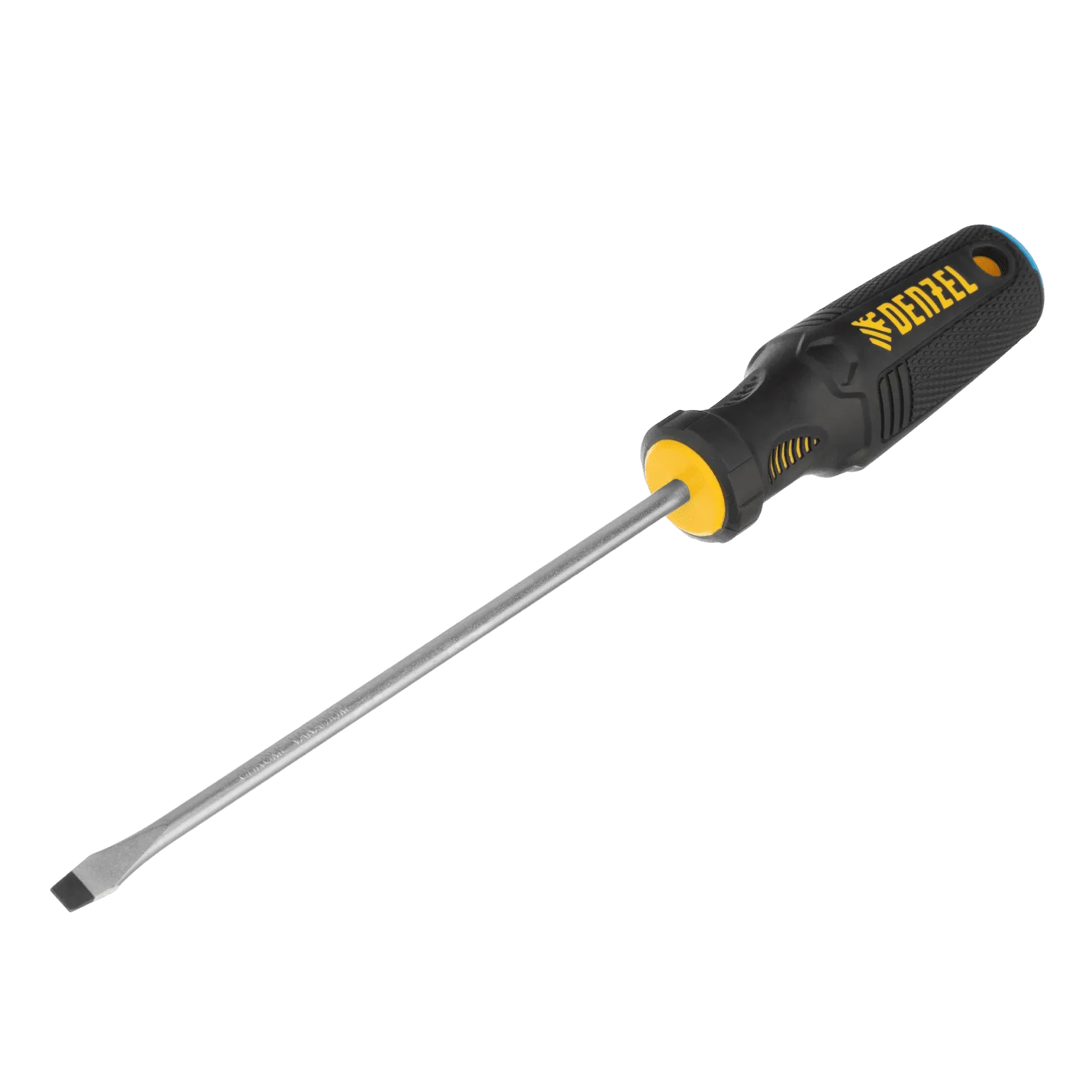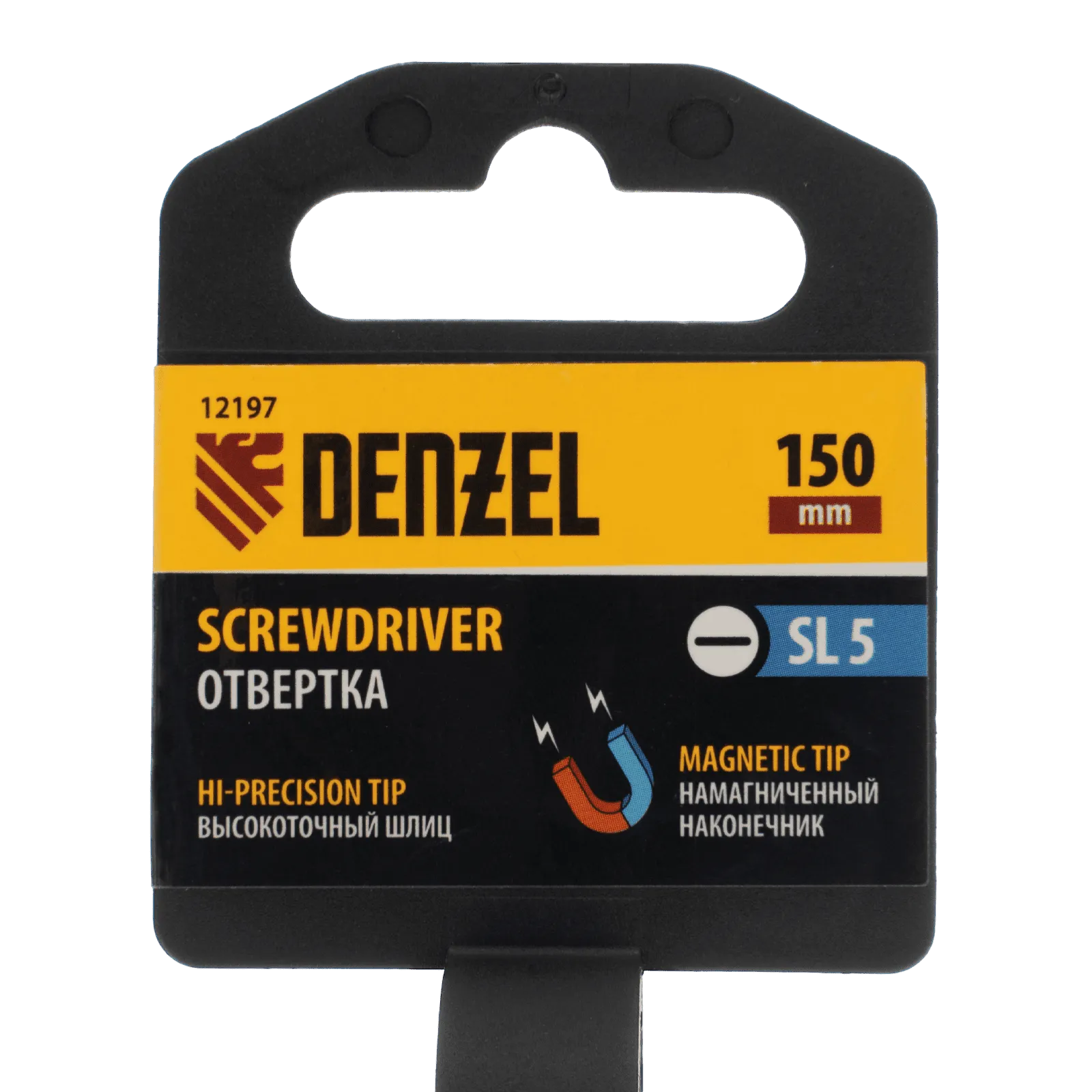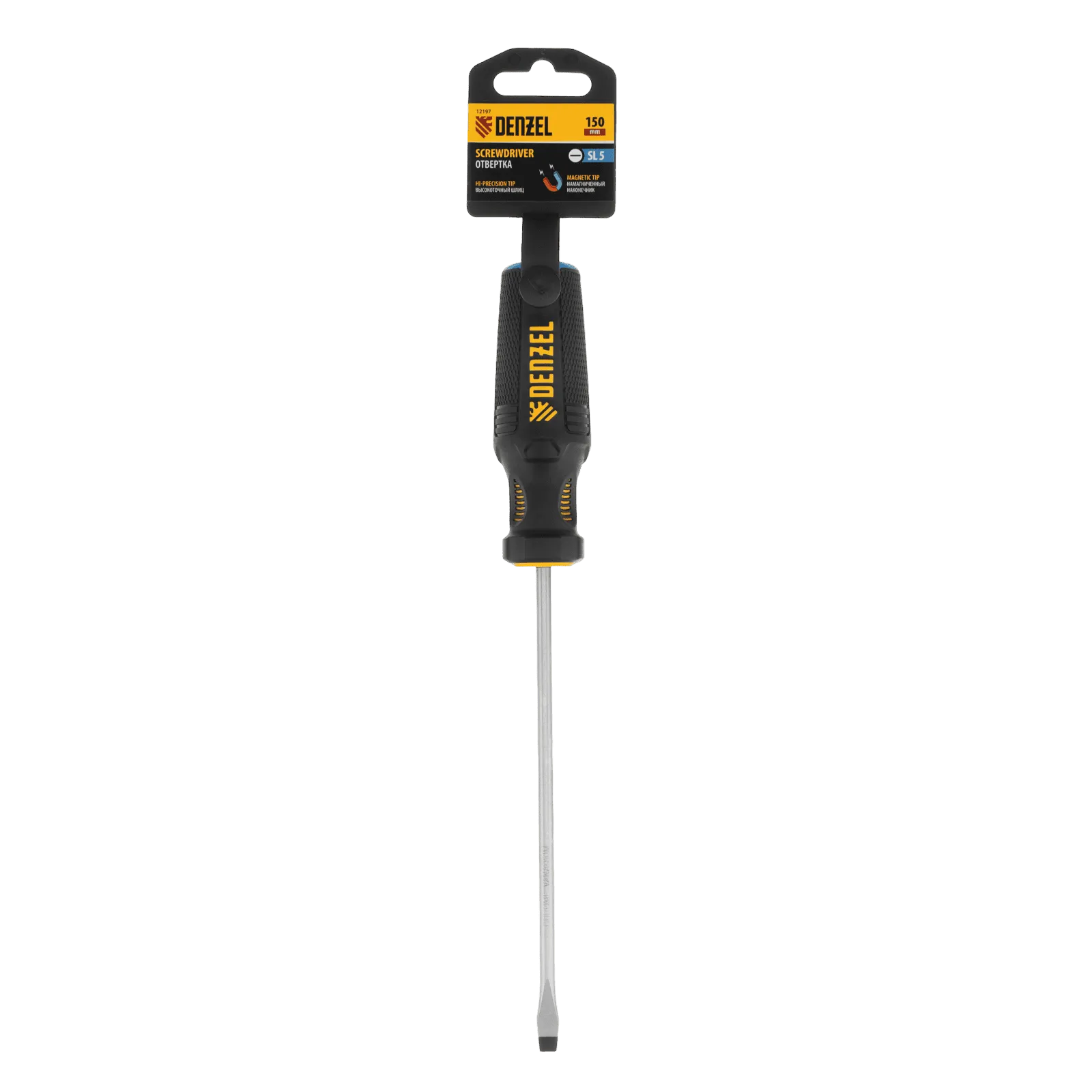 Отвертка SL5 х 150 мм Denzel 12197 из стали CrV, с трехкомпонентной рукояткой, используется для монтажа и демонтажа винтов и саморезов с прямым шлицем Slotted. Намагниченный шлиц крепко фиксируется в головке крепежа. Отвертка выдерживает интенсивное применение и предназначена для выполнения профессиональных ремонтных и монтажных работ.