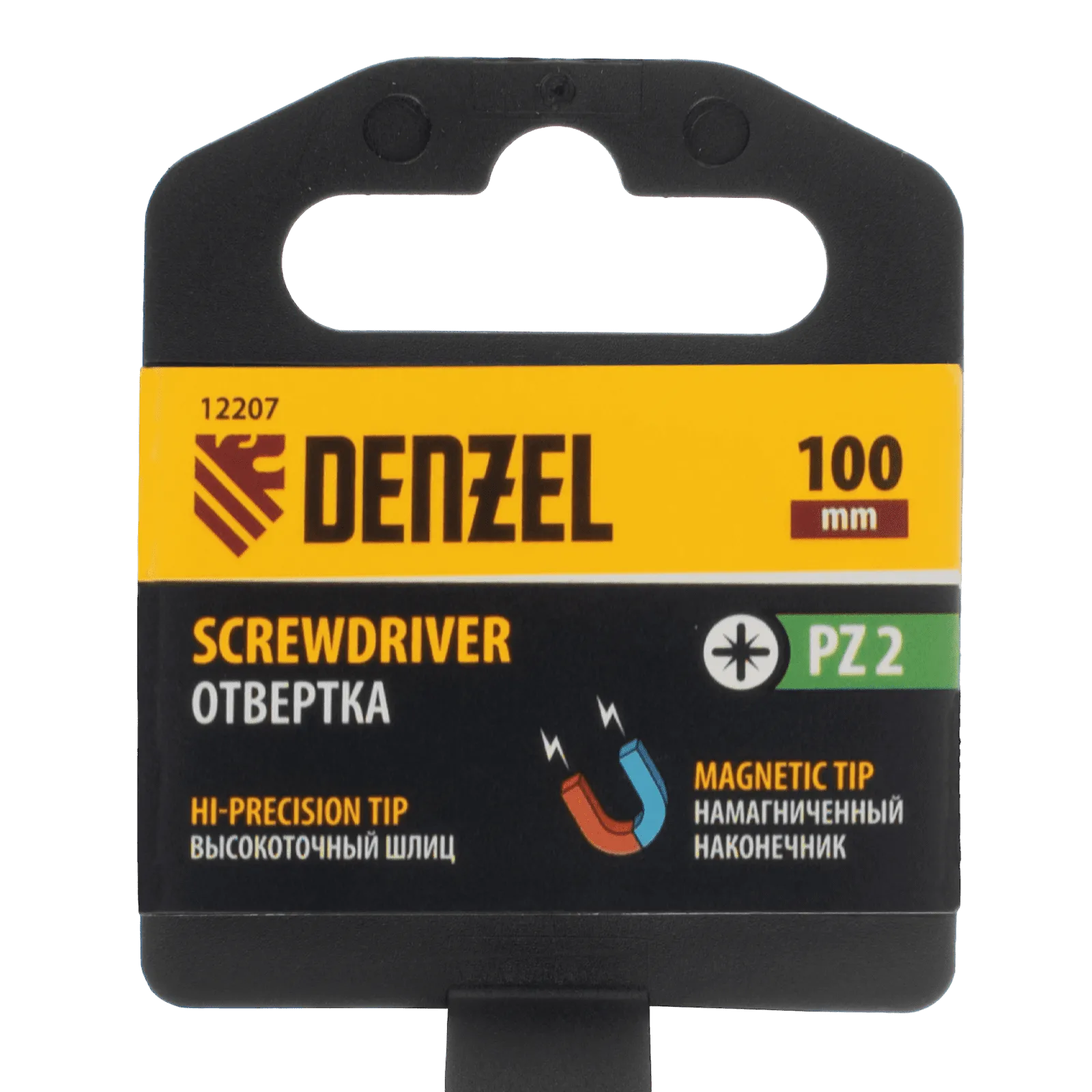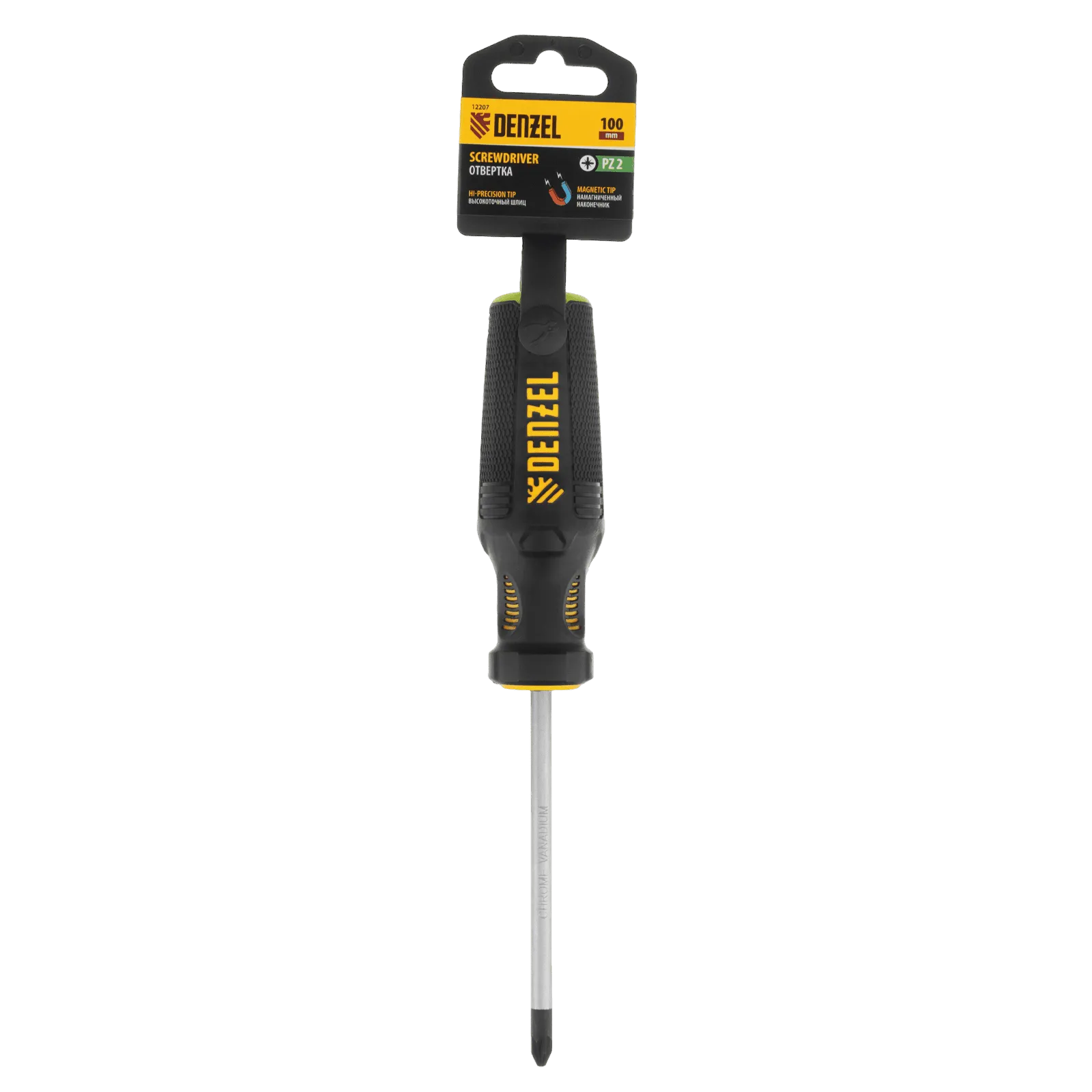Отвертка PZ2 x 100 мм Denzel 12207 из стали CrV, c трехкомпонентной рукояткой, предназначена для монтажных и демонтажных работ с резьбовыми соединениями типа Pozidriv. Благодаря намагниченному шлицу отвертку с крепежом можно направлять одной рукой, удерживая другой закрепляемую деталь. Инструмент подходит для профессионального использования.
