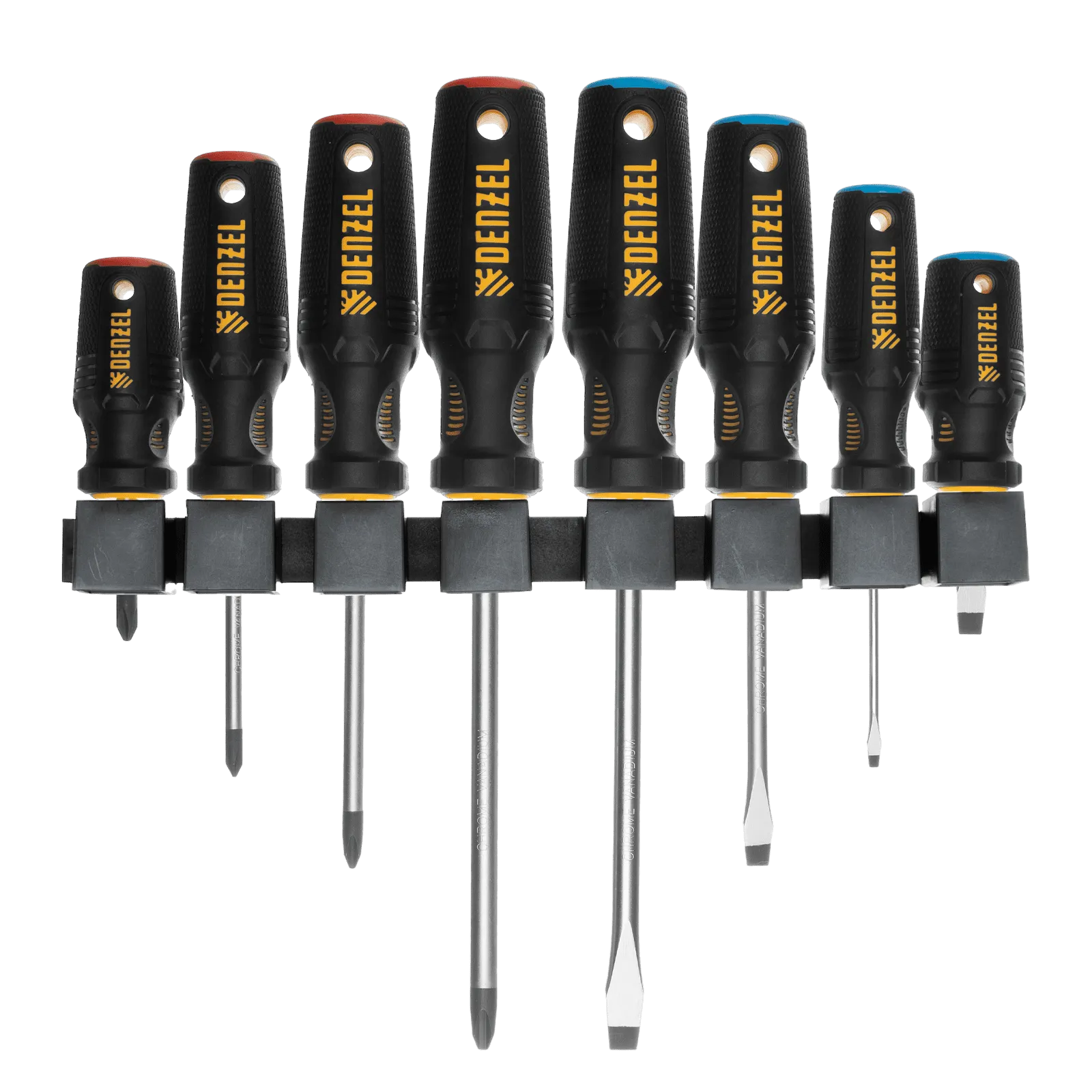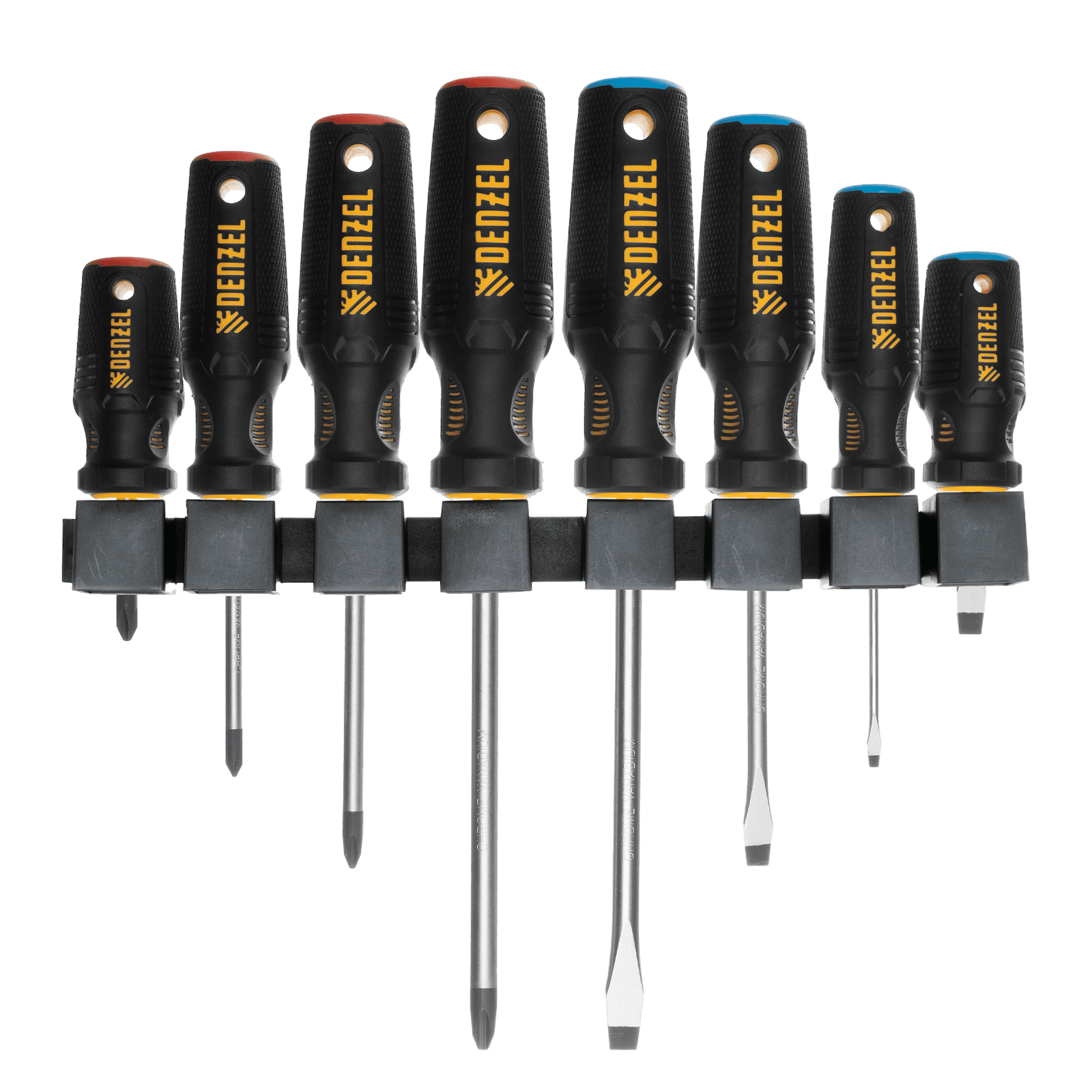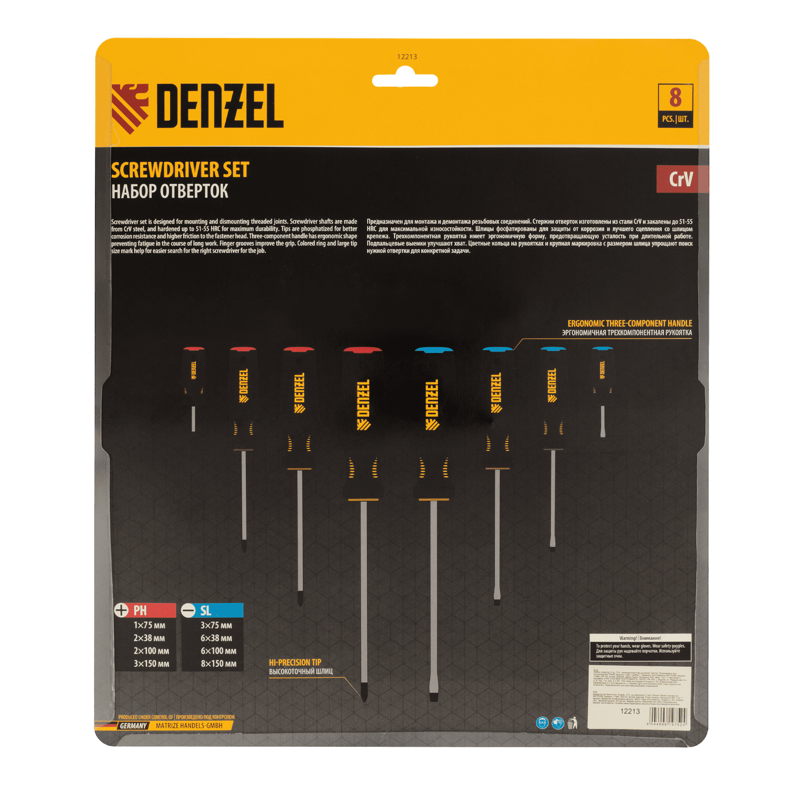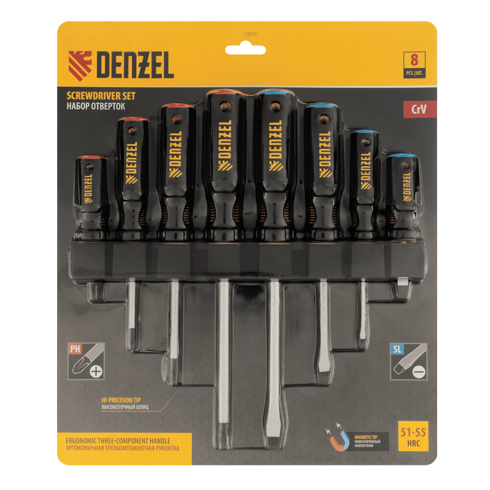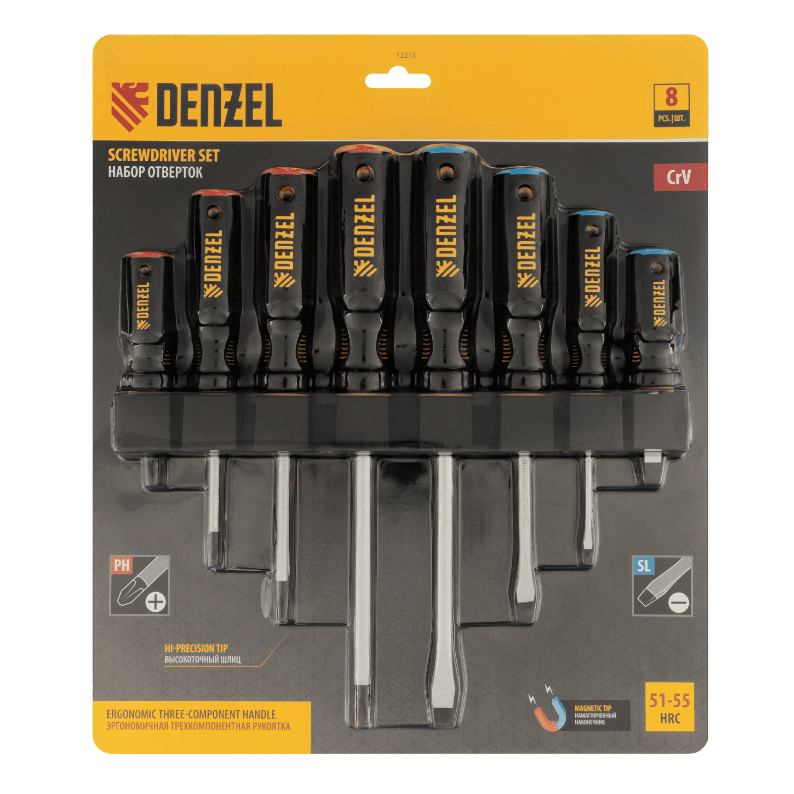 Набор Denzel 12213 состоит из 8 отверток с трехкомпонентными рукоятками, изготовленных из стали CrV. Они предназначены для работы с резьбовыми крепежами типа PH и SL. Благодаря намагниченным наконечникам направлять отвертки с крепежом можно одной рукой. Отвертка с длиной стержня 38 мм удобна для работы в ограниченном пространстве. Набор подходит для профессионального использования.