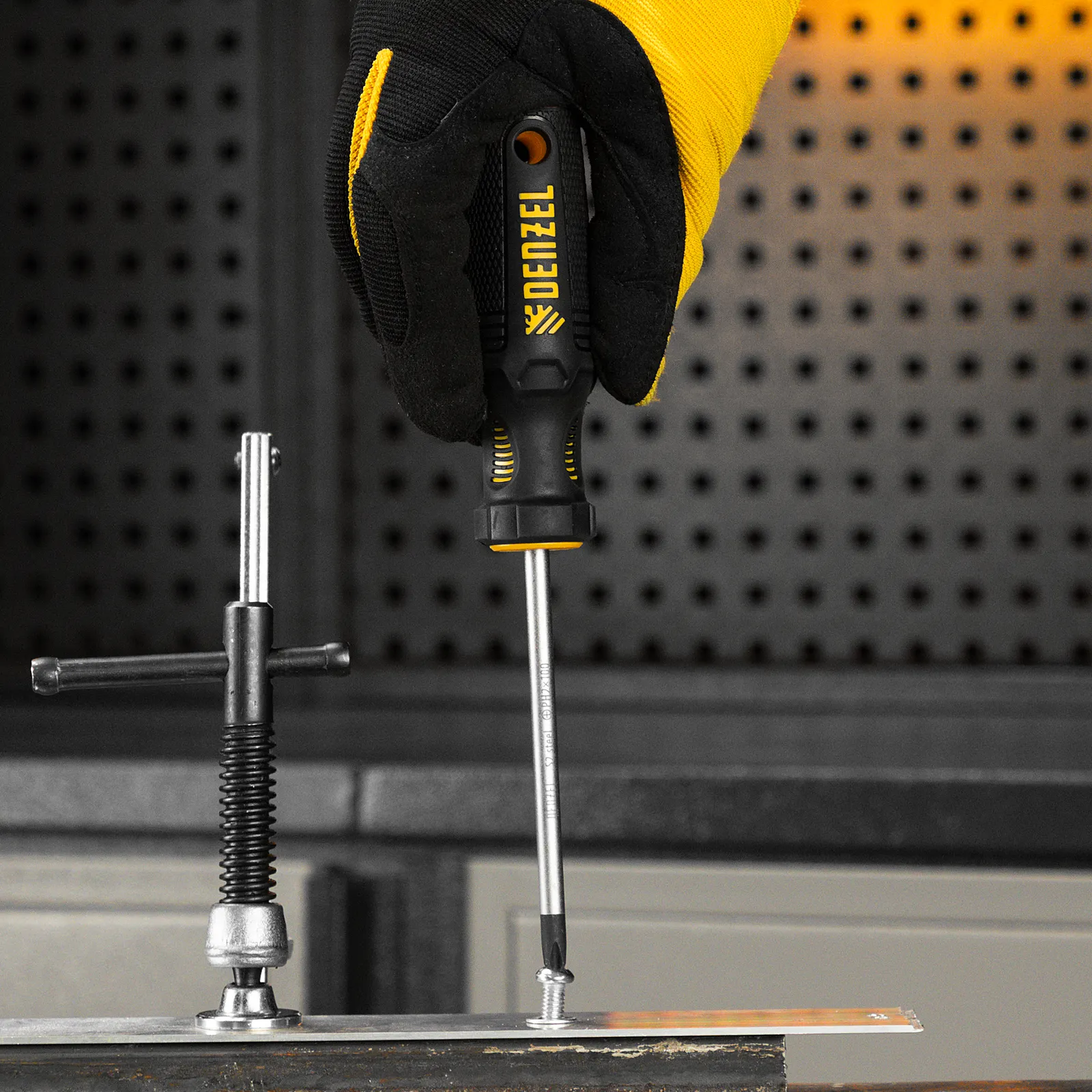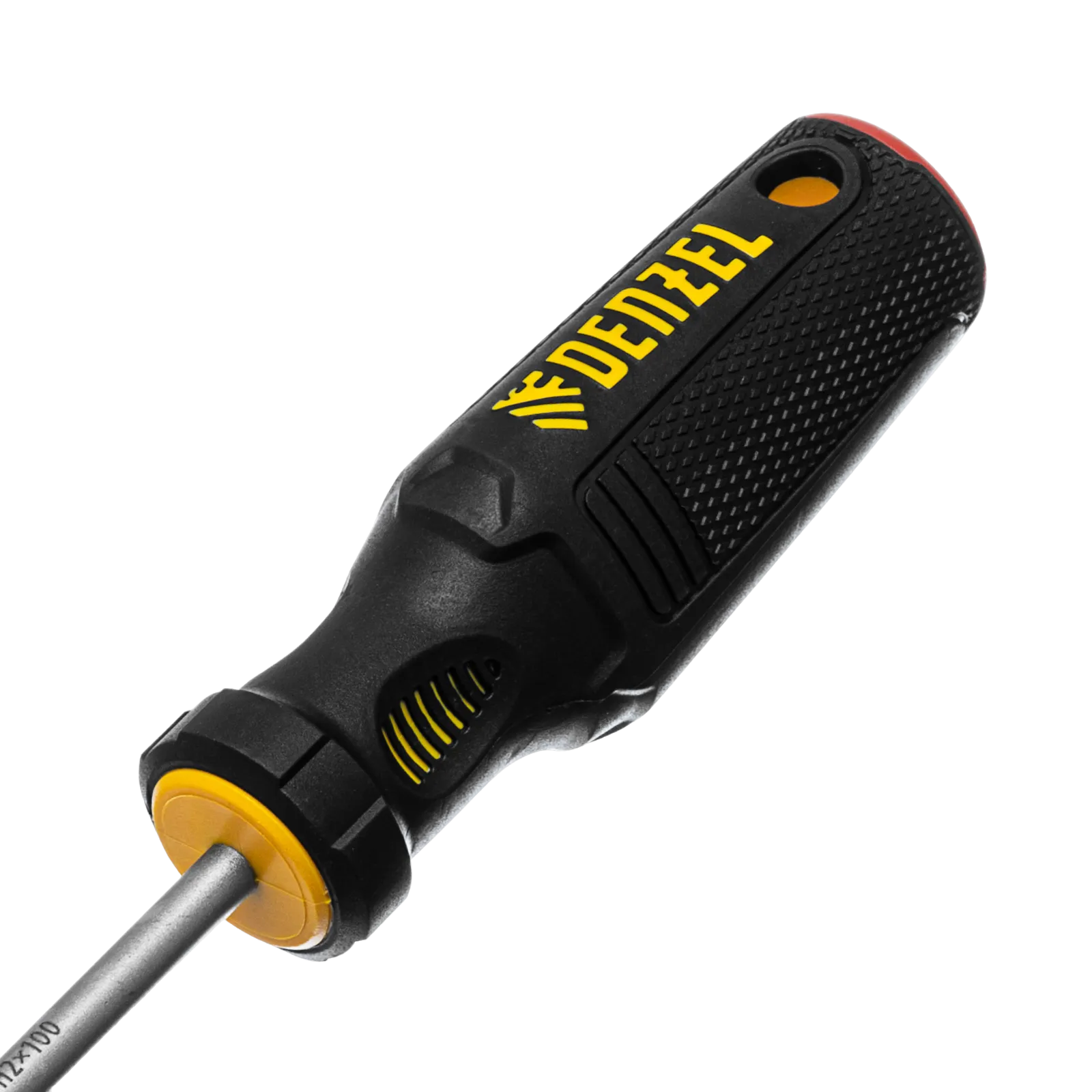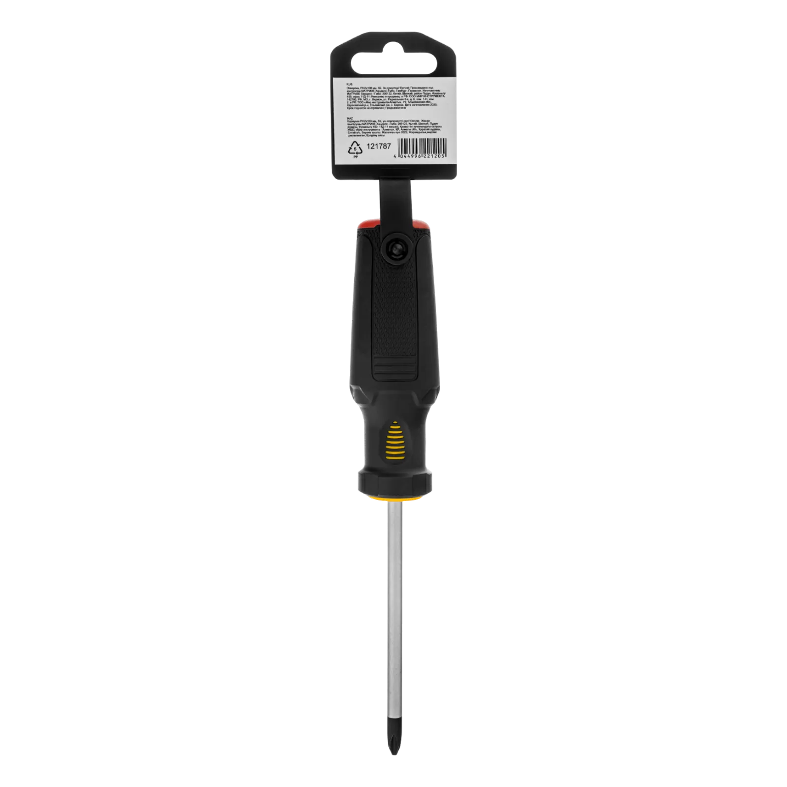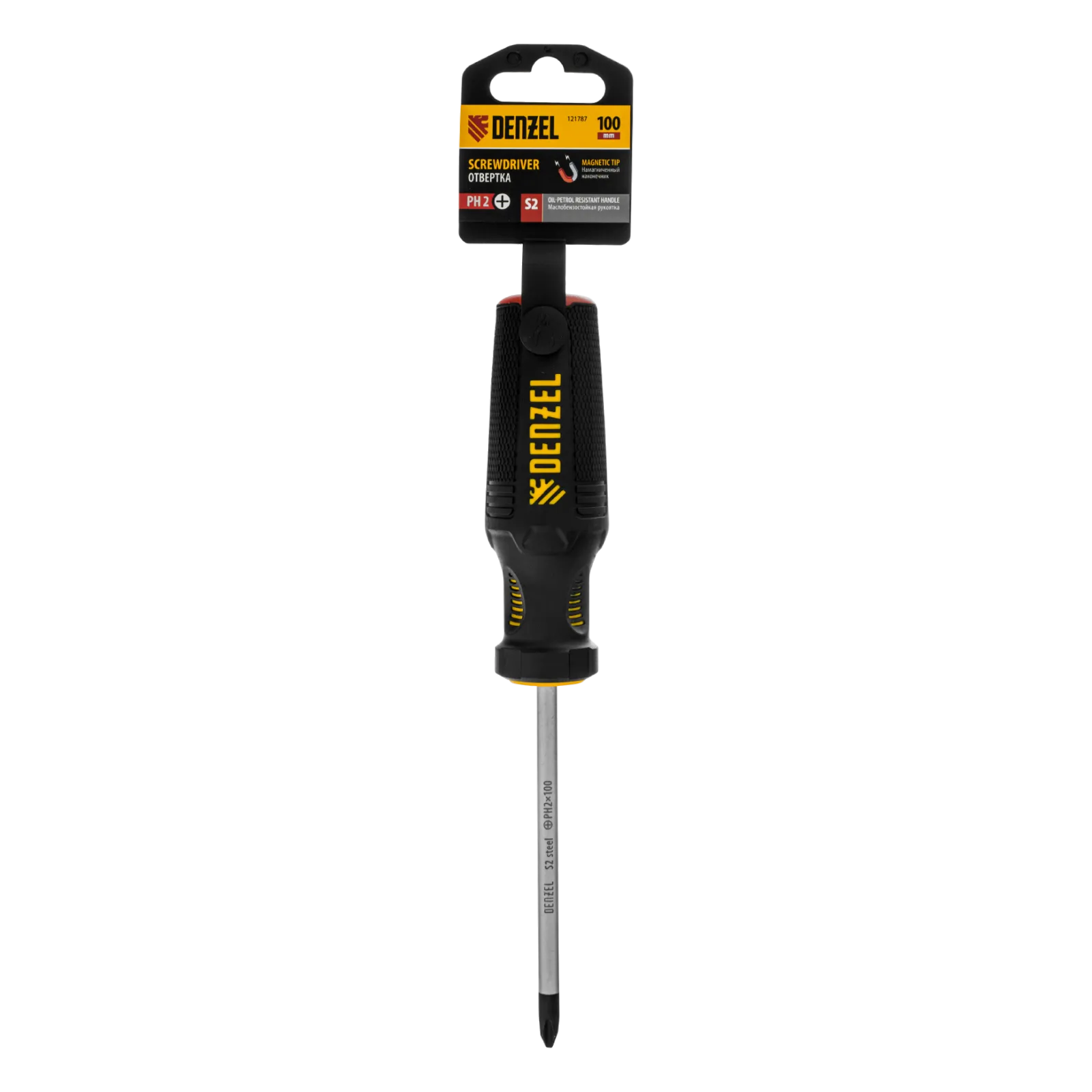 Отвертка Denzel 121787 с трехкомпонентной рукояткой, со стержнем из стали S2, длиной 100 мм, предназначена для закручивания и откручивания резьбового крепежа типа PH2. Высокоточный намагниченный шлиц избавляет мастера от необходимости придерживать винт или саморез рукой. Отвертка рекомендована для профессионального использования.